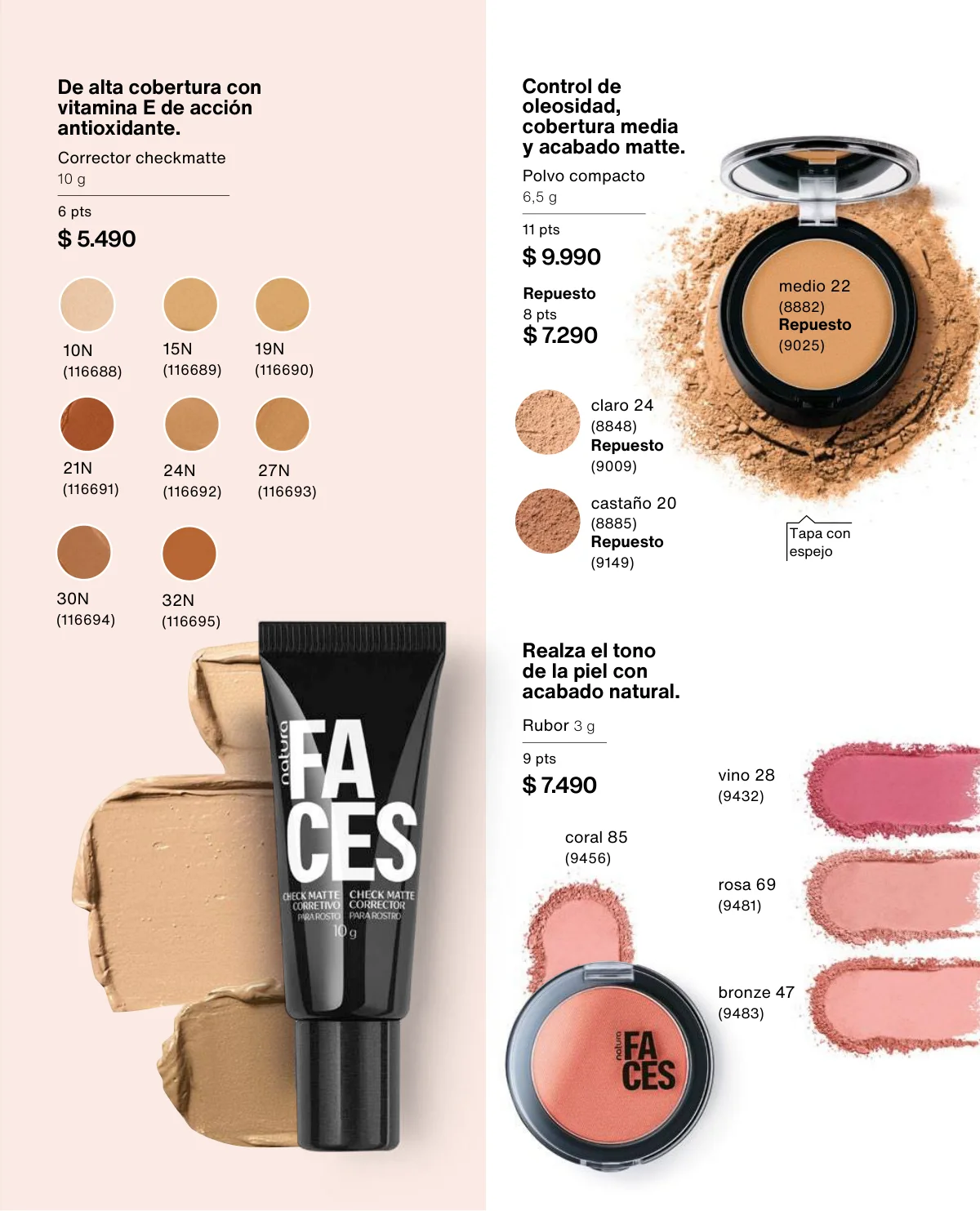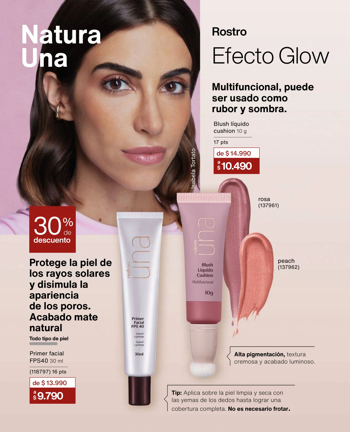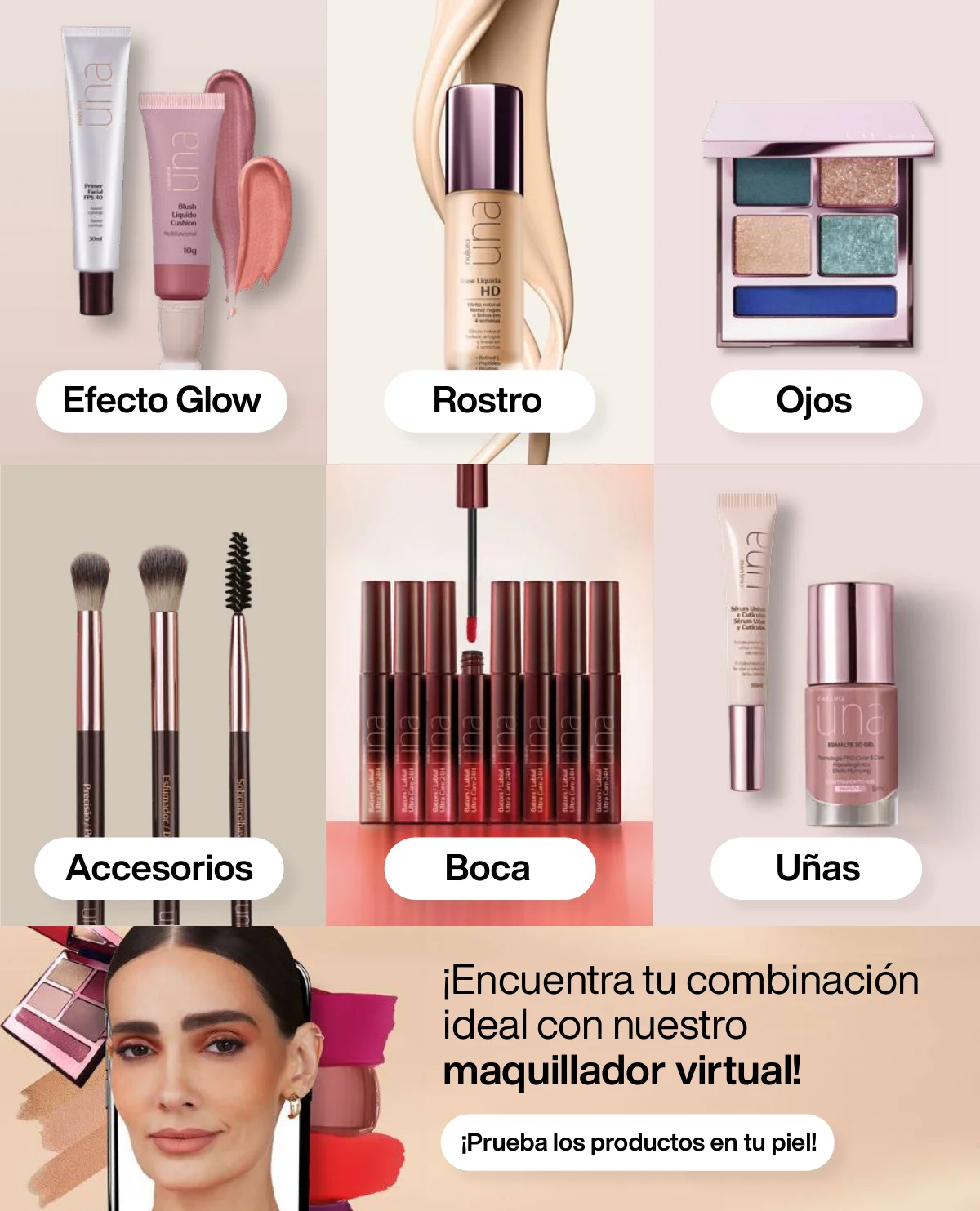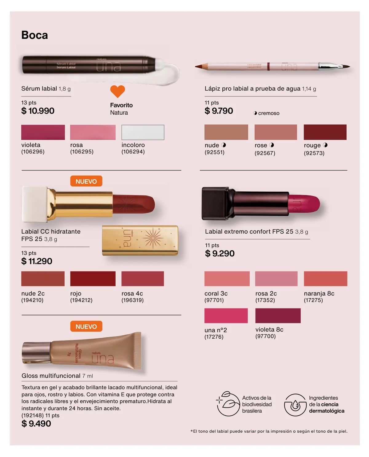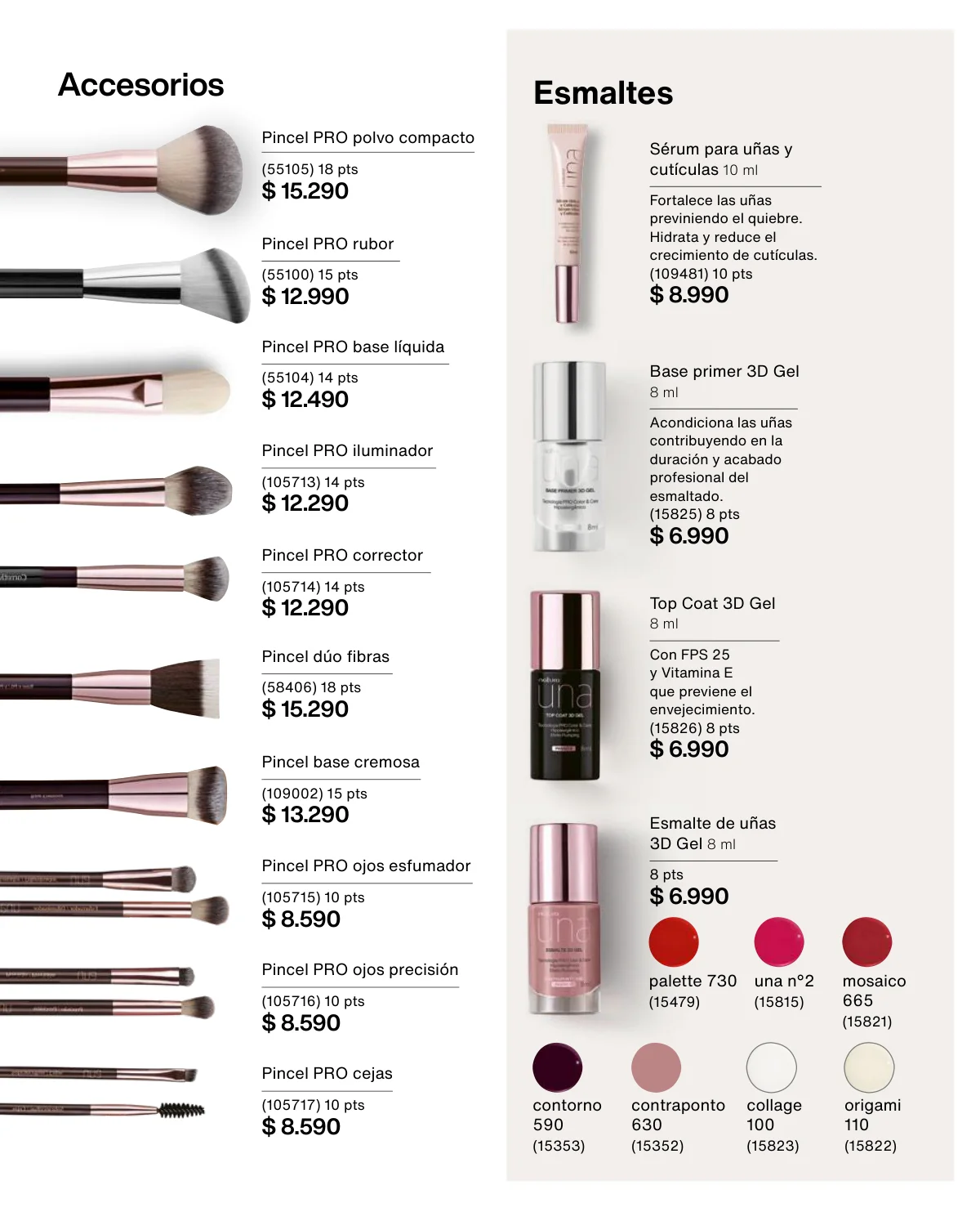 Y para un maquillaje de impacto, las líneas UNA y Faces (página 65 en adelante) tiene las muestras más variadas de Primers UNA (productos para hacer durar el maquillaje), bases y rubores, sérum labial UNA o las llamativas paletas de sombras Faces o los labiales de hidratación 24 horas.