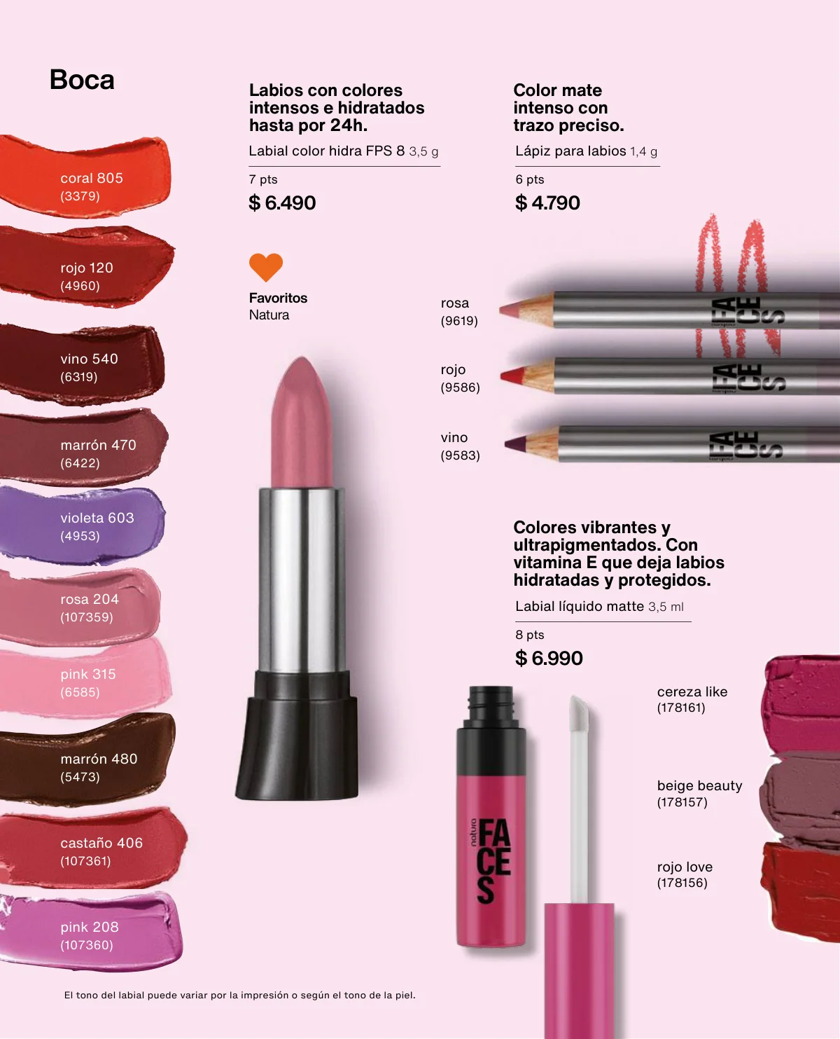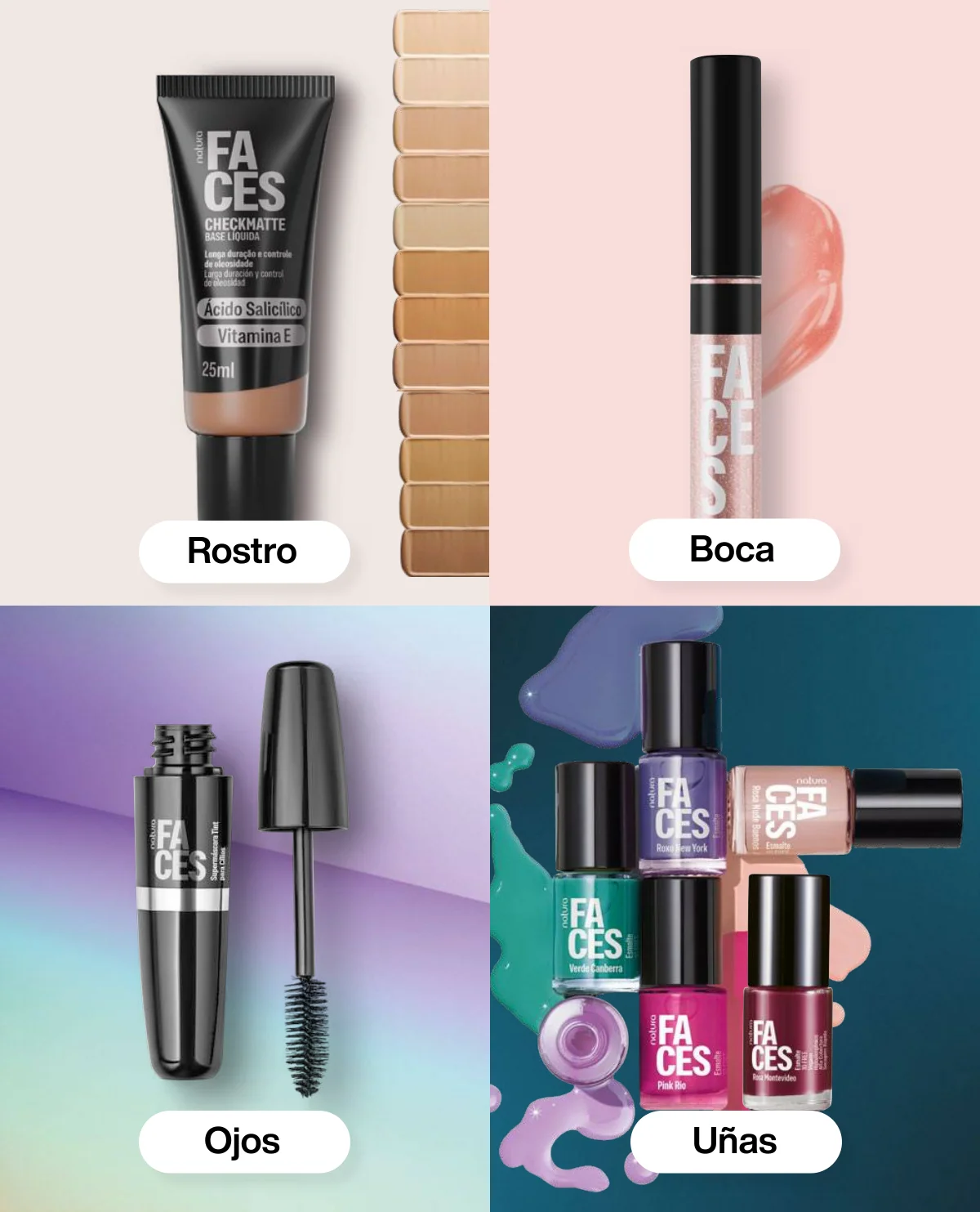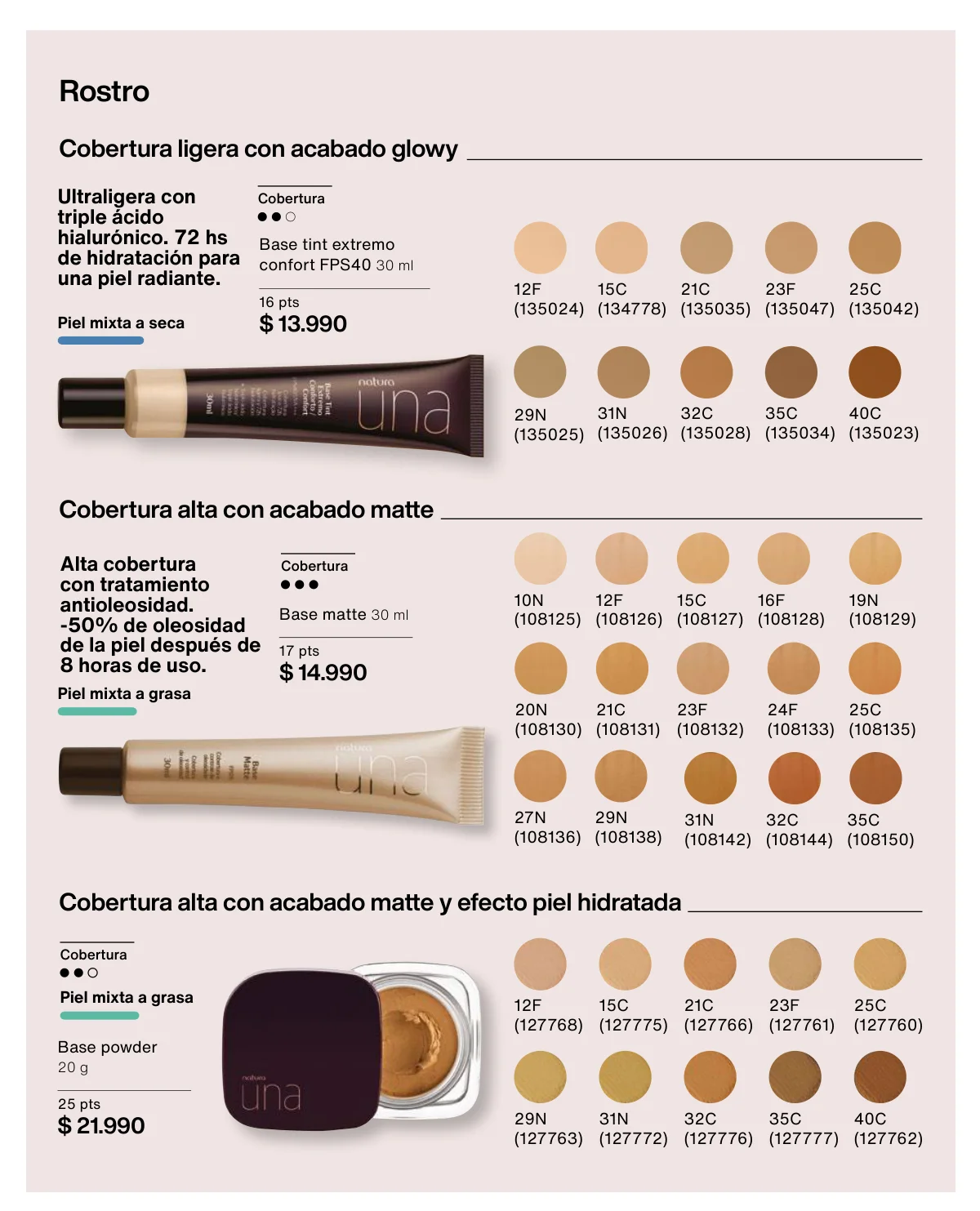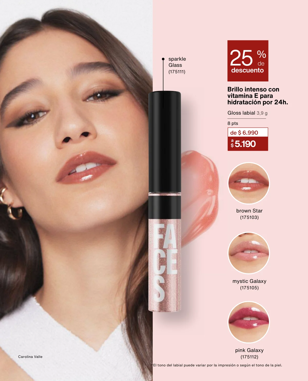 Y para un maquillaje de impacto, las líneas UNA y Faces (página 65 en adelante) tiene las muestras más variadas de Primers UNA (productos para hacer durar el maquillaje), bases y rubores, sérum labial UNA o las llamativas paletas de sombras Faces o los labiales de hidratación 24 horas.