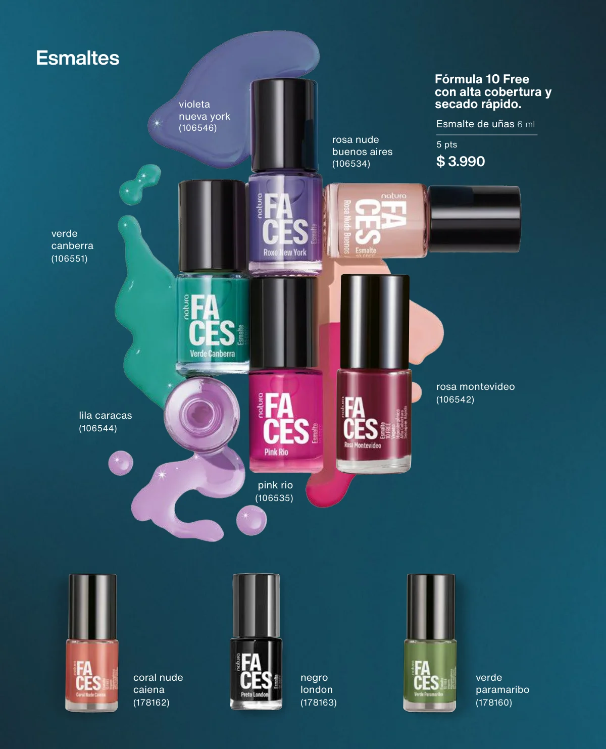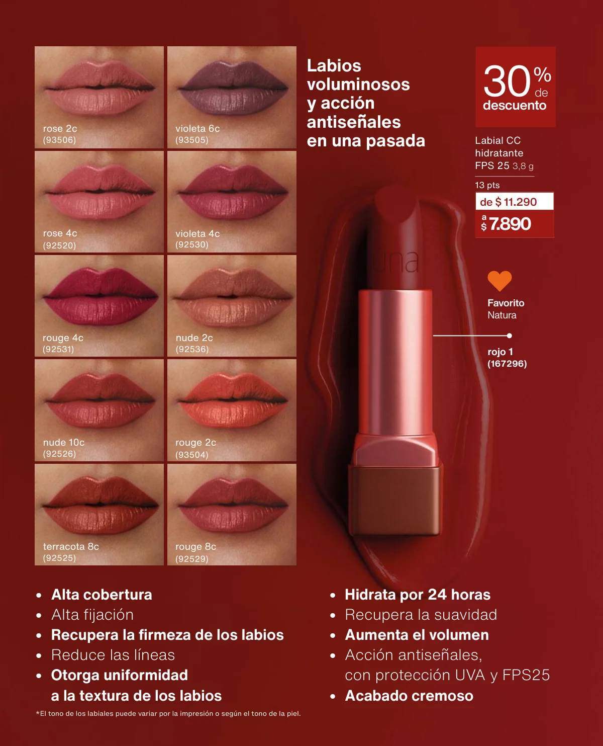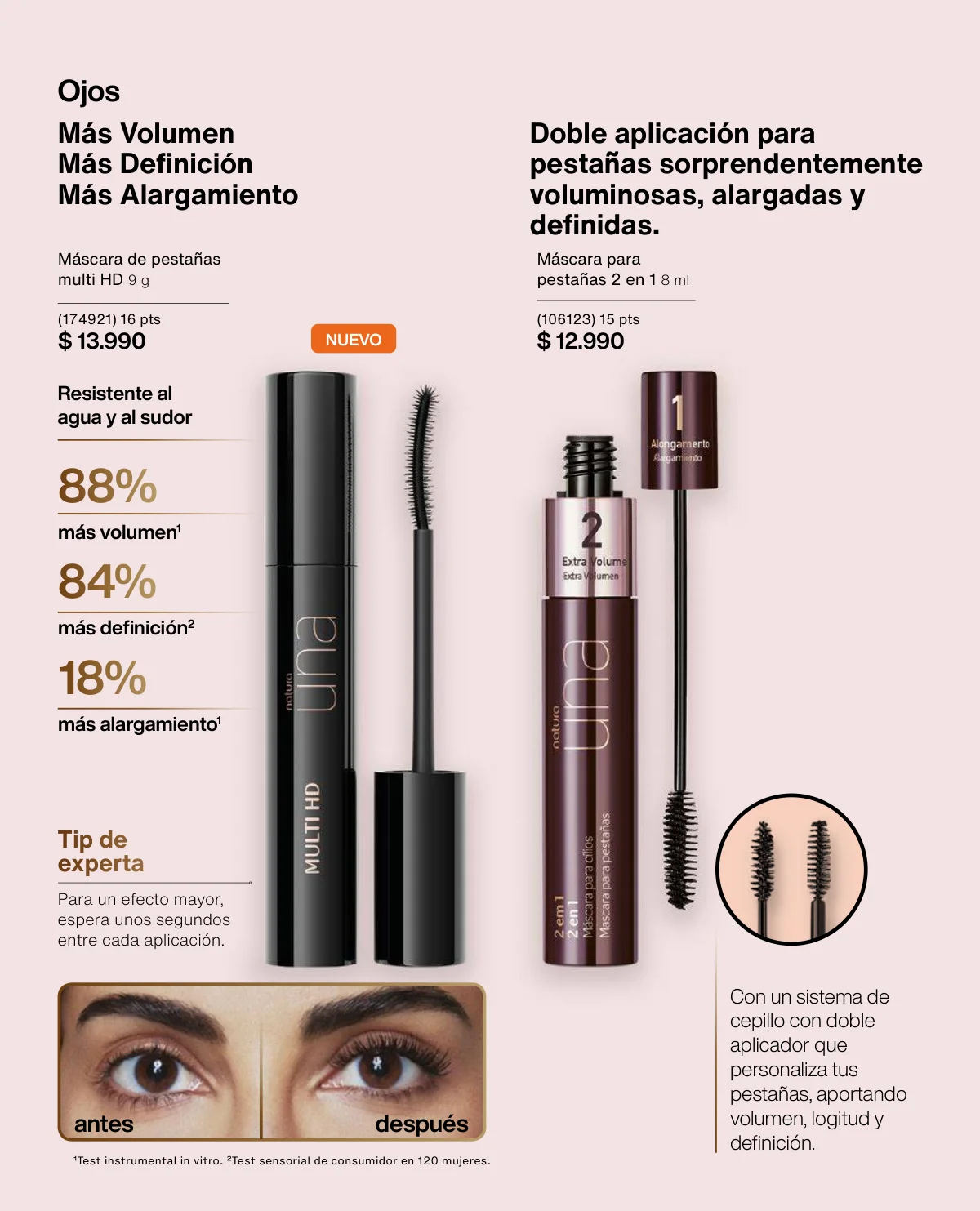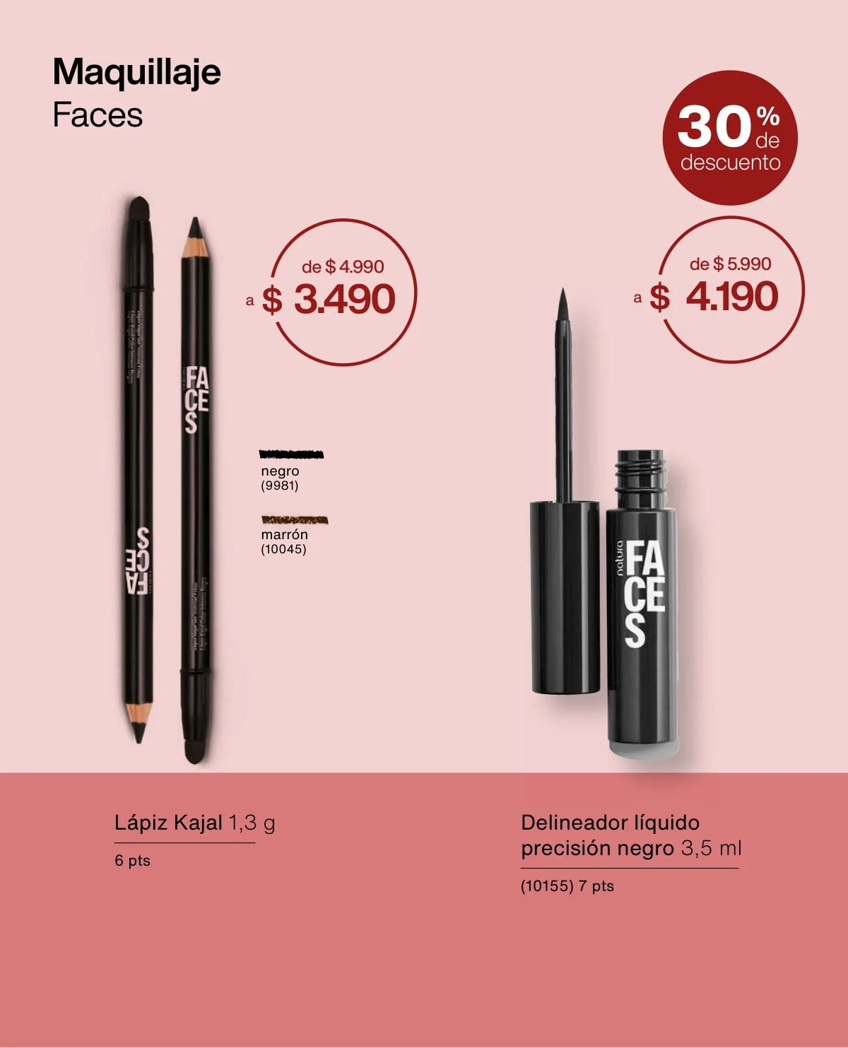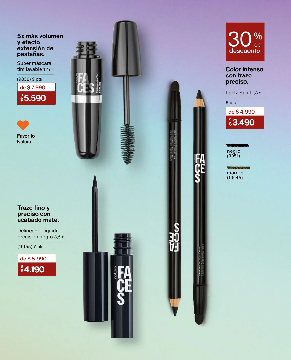 Y para un maquillaje de impacto, las líneas UNA y Faces (página 65 en adelante) tiene las muestras más variadas de Primers UNA (productos para hacer durar el maquillaje), bases y rubores, sérum labial UNA o las llamativas paletas de sombras Faces o los labiales de hidratación 24 horas.