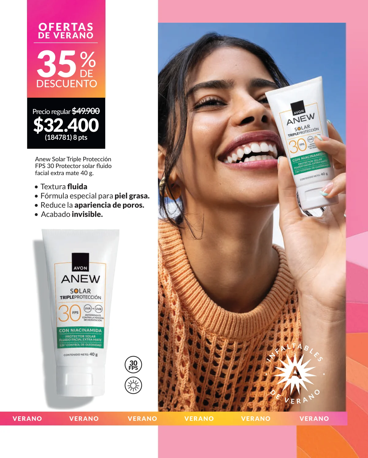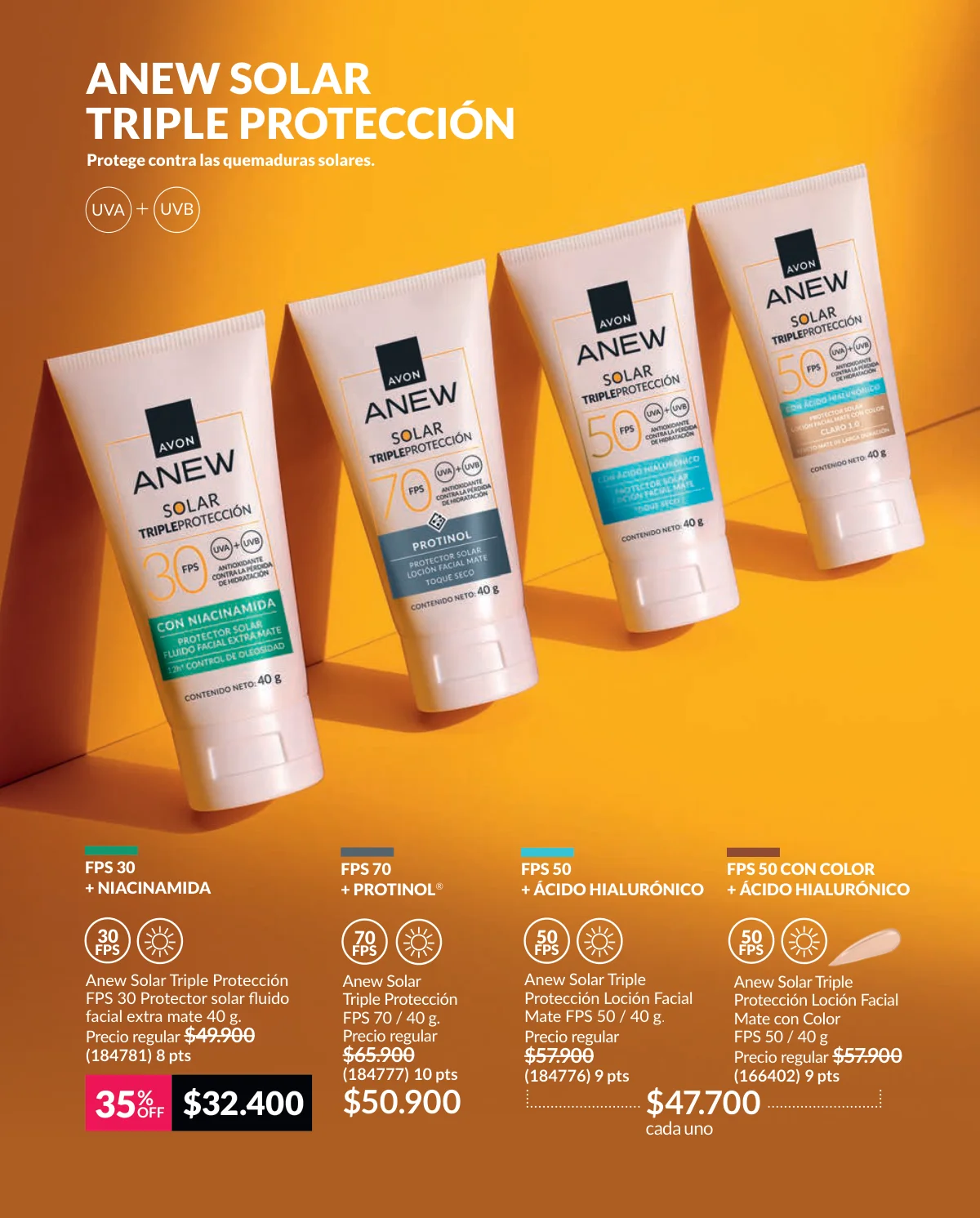Cuando es verano necesitamos cuidados especiales para cuerpo y desde Avon campaña 1 2026 te acercamos todo lo que necesitas esta temporada, porque queremos que brilles y estés radiante como el sol, todo el año. En esta época siempre tenemos que llevar un protector solar en el bolso, para cuidar nuestra piel, prevenir manchas y arrugas, para proteger nuestra salud, es básico llevar con nosotros un protector solar y podrás elegir el que mejor se adapte a ti en nuestras páginas: escoge entre nuestra línea anti-edad Anew Solar Advance, con factor de protección solar 70, para un cuidado súper intenso y completo, además protectores con color para que, aparte de cuidarte, tu piel luzca tersa y suave.