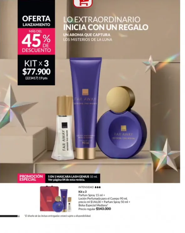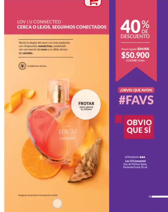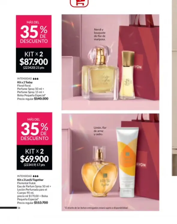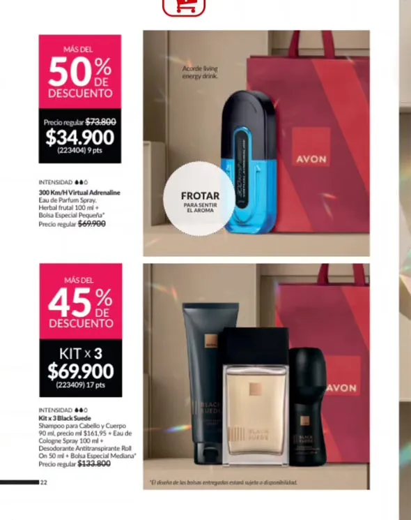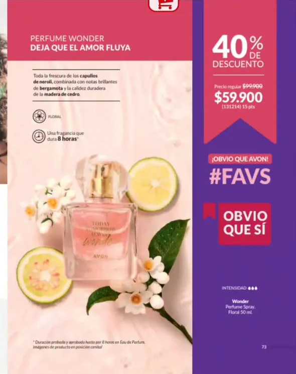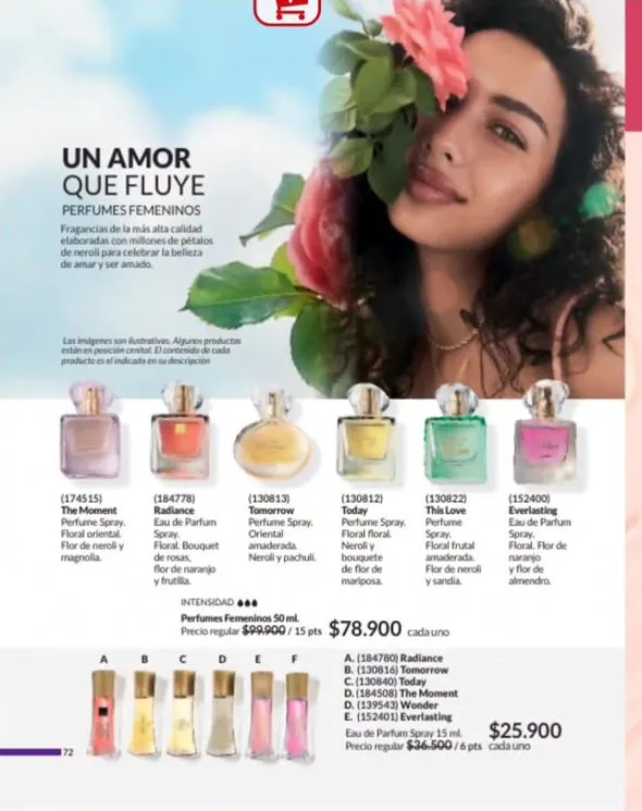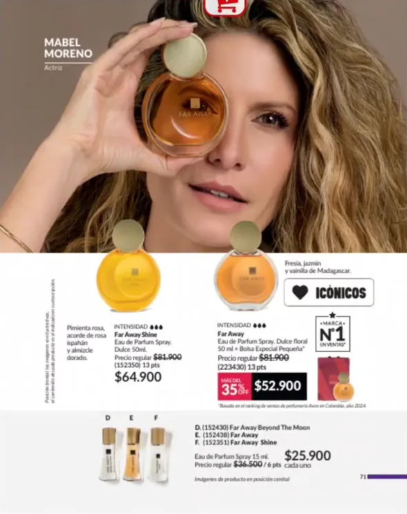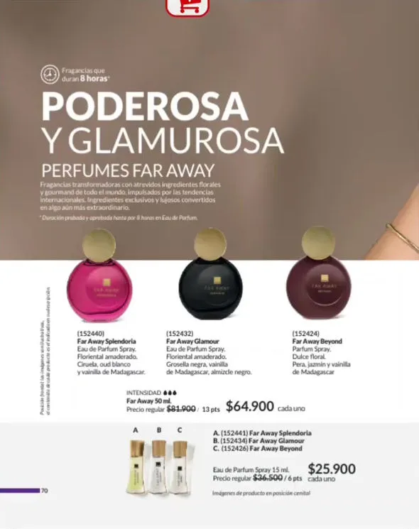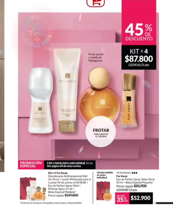 Cada ingrediente de un perfume tiene su encanto natural y se reflejan las exquisitas creaciones que catálogo Avon campaña 16 2024 Colombia siempre trae para ti con esencias florales y frutales de la fragancia for away y otros que enamoran para siempre como el Today con aromas amaderados.