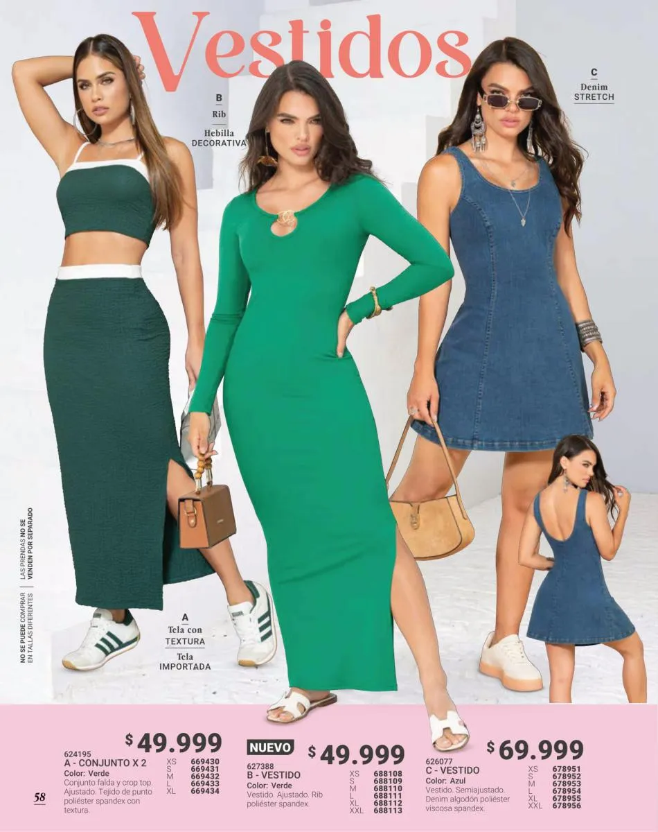 Los vestidos son otra de las prendas infaltables en cada pedido. Para esta catálogo Carmel campaña 18 2025 Colombia los modelos lucen en salidas de día y de noche y resultan ideales para tus momentos más relajados, combinados con tenis o incluso para una cita o reunión de negocios si le sumas unos bellos tacones.