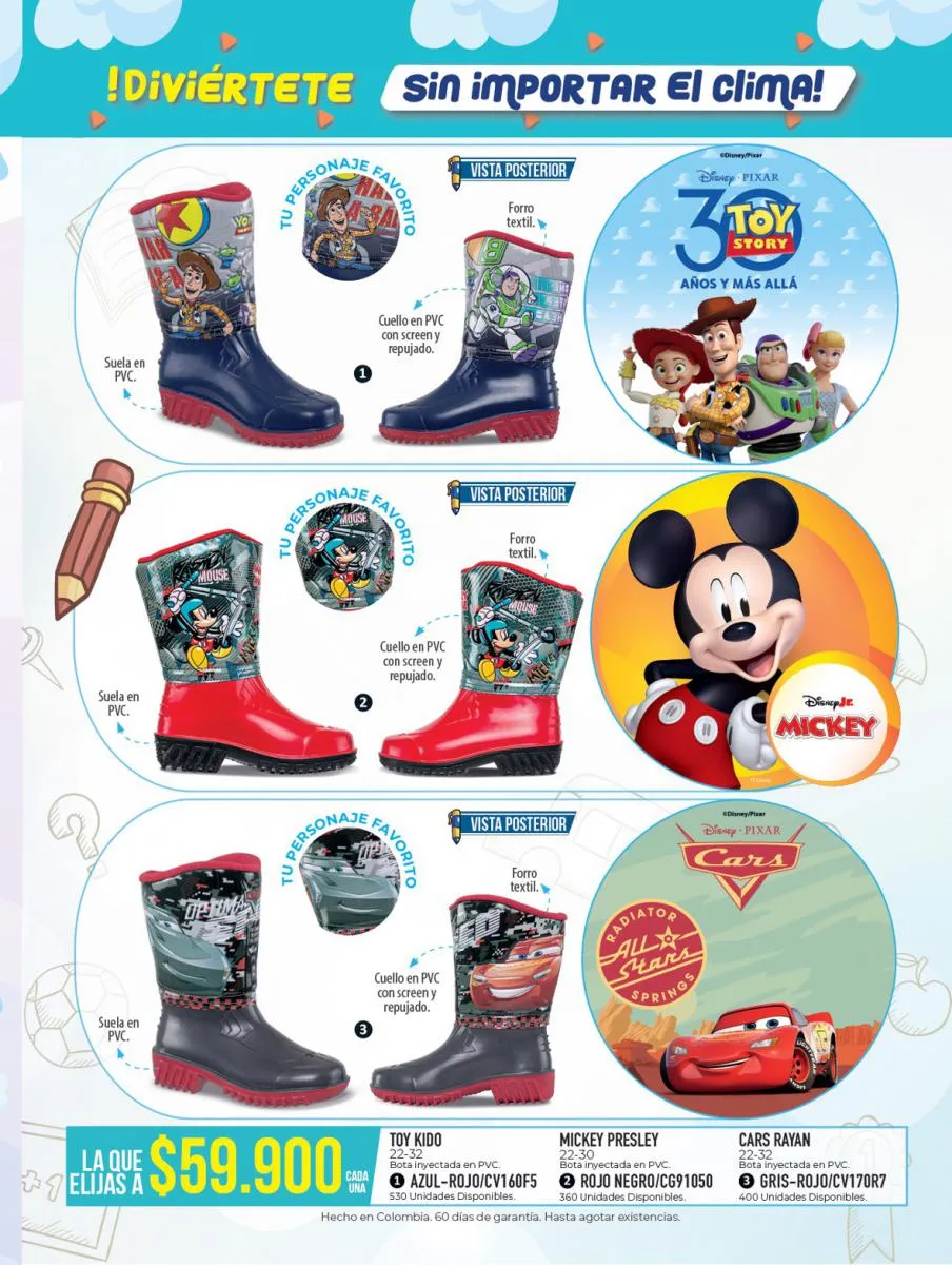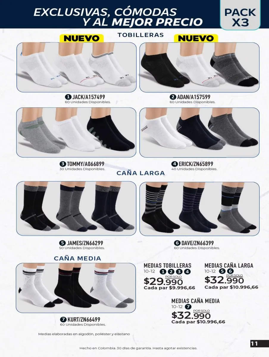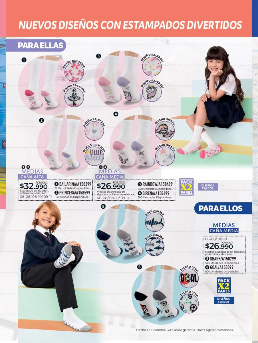 Completa el uniforme escolar de los niños con las medias que estás buscando: paquetes por tres pares en de medias blancas a un precio súper especial, y medias estampadas ¡únicamente en la suela! Ideales para usar con el uniforme y para dejar felices a los niños con las estampas más divertidas y coloridas. Además del calzado y las medias vas a encontrar morrales, loncheras y cartucheras, para ellos de carros o balones, y para ellas de unicornios o princesas, también encontrarás combos de loncheras y estuches a precios exclusivos.