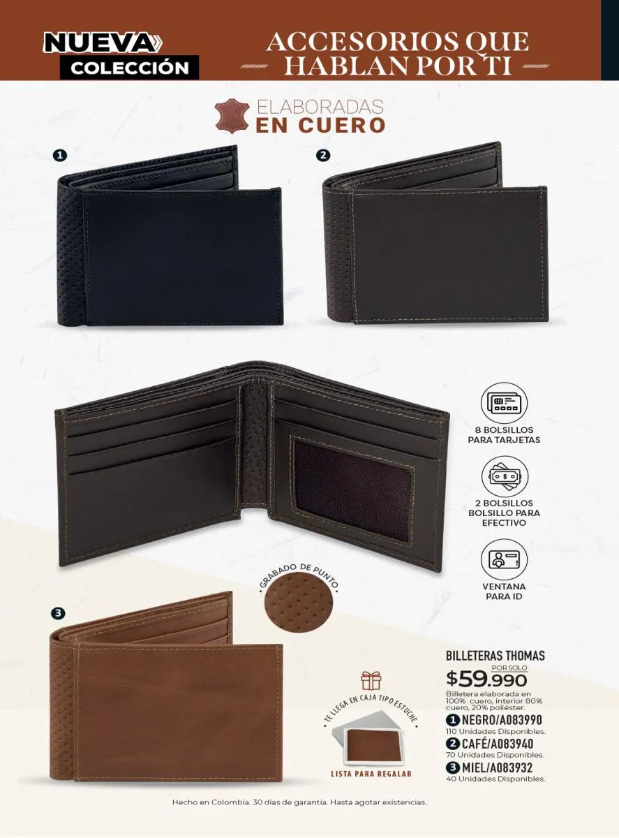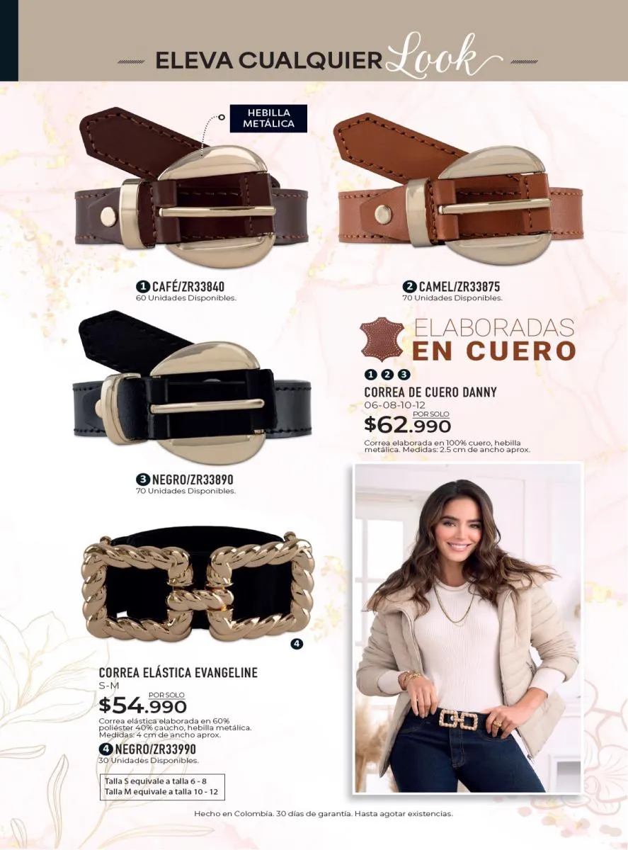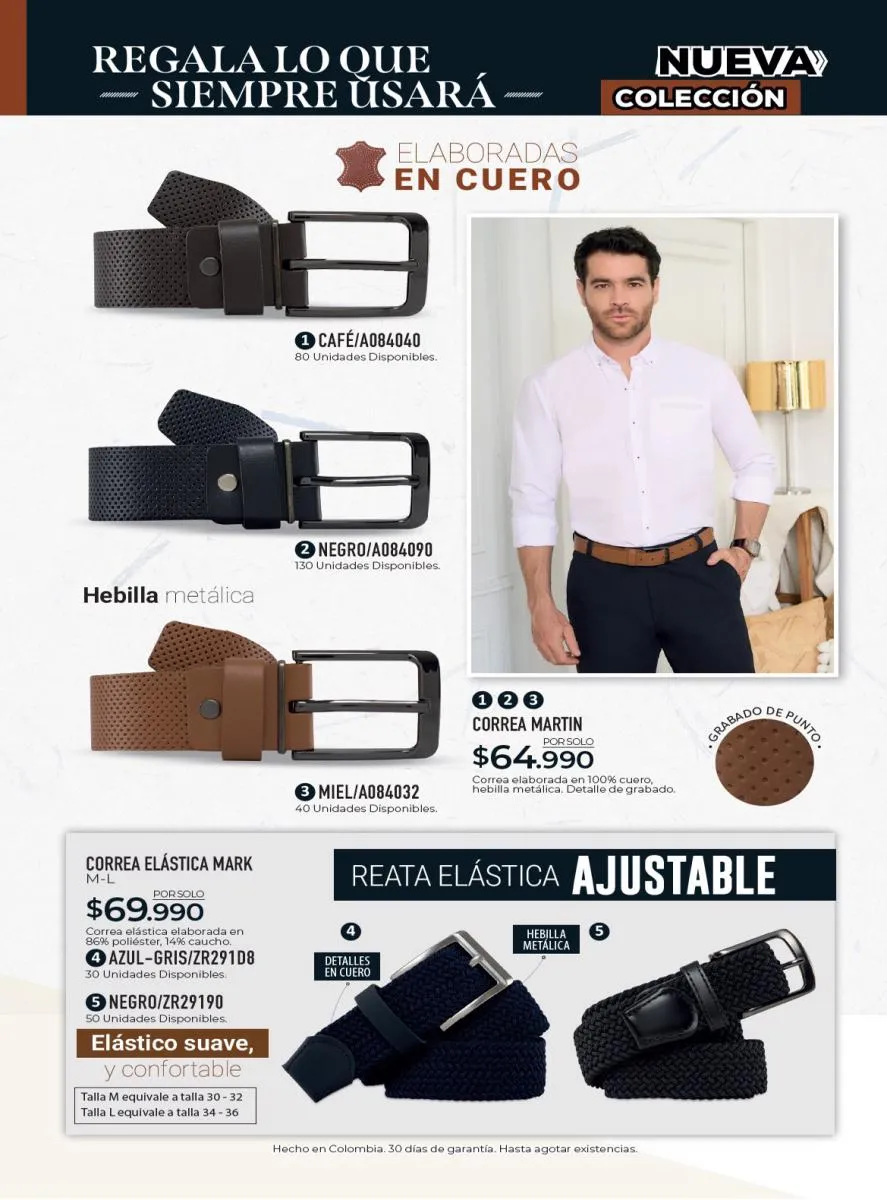 Si se trata de las correas, los modelos más bonitos y prácticos están en esta catálogo Croydon campaña 8 2024 Colombia. Y, para caballeros, puedes pedirlas a juego con las billeteras de cuero.