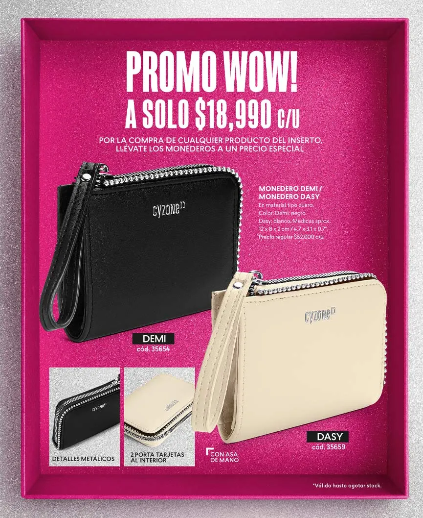 Hay otros productos muy especiales en este catálogo Cyzone campaña 17 2025 Colombia. Las billeteras para damas y caballero están a 35% de descuento, al igual que el organizador Cute Box.
