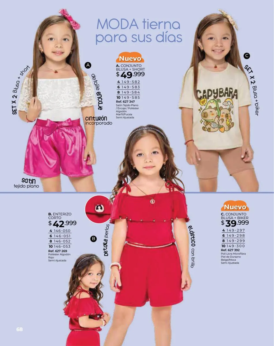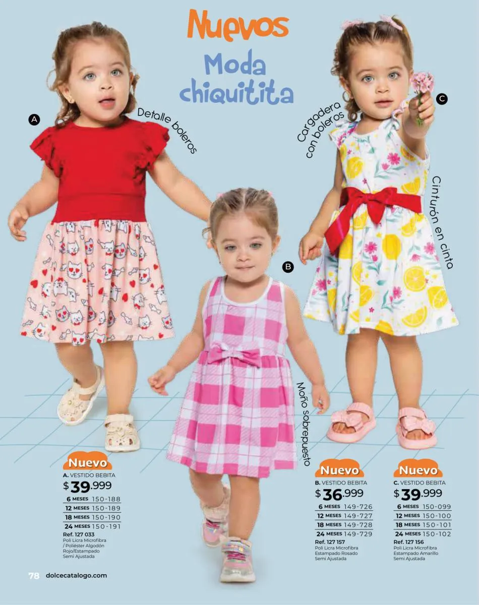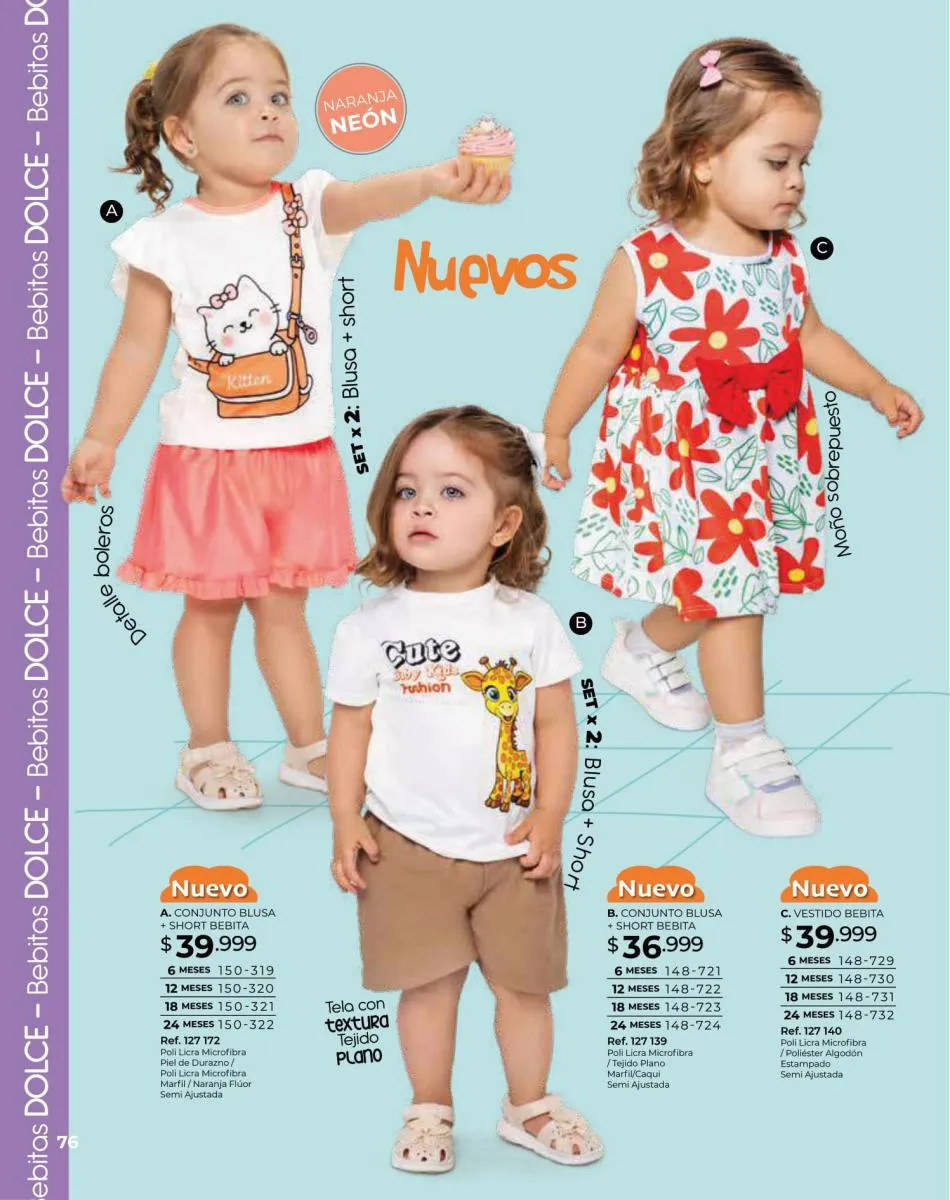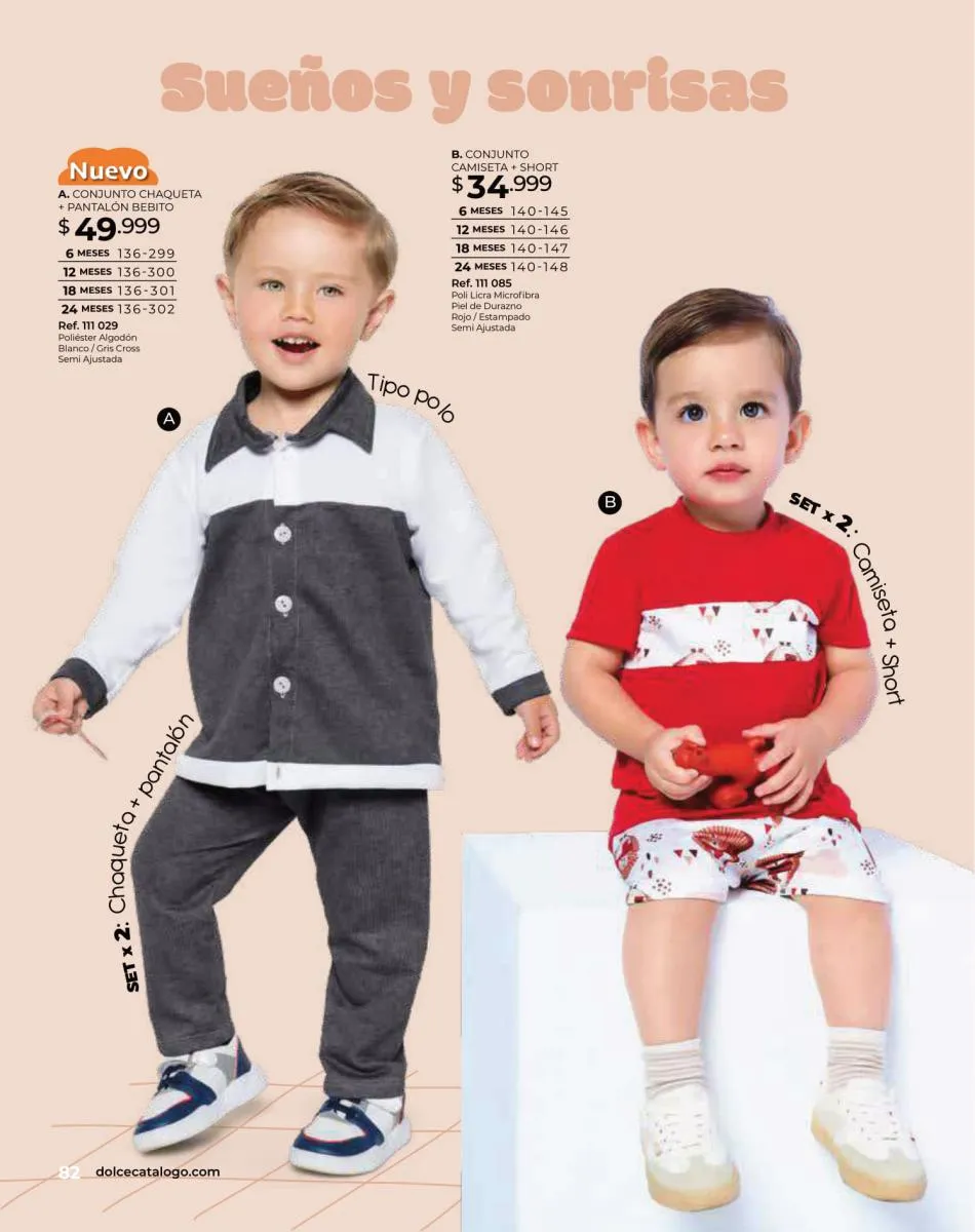 Para las bebitas el catálogo Dolce Colombia te trae un precioso mameluco en color palo rosa con detalle de pompones en pecho con mangas en boleros con bordes blancos y conjunto de blusa blanca estampada + short rosado con puntos blancos ambos en tallas 6/24 meses. Pag. 96.