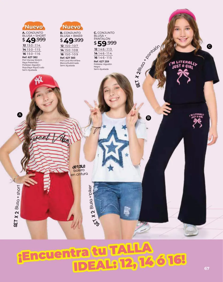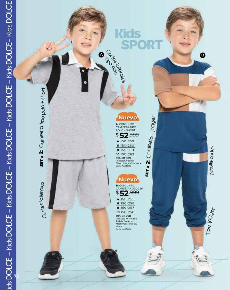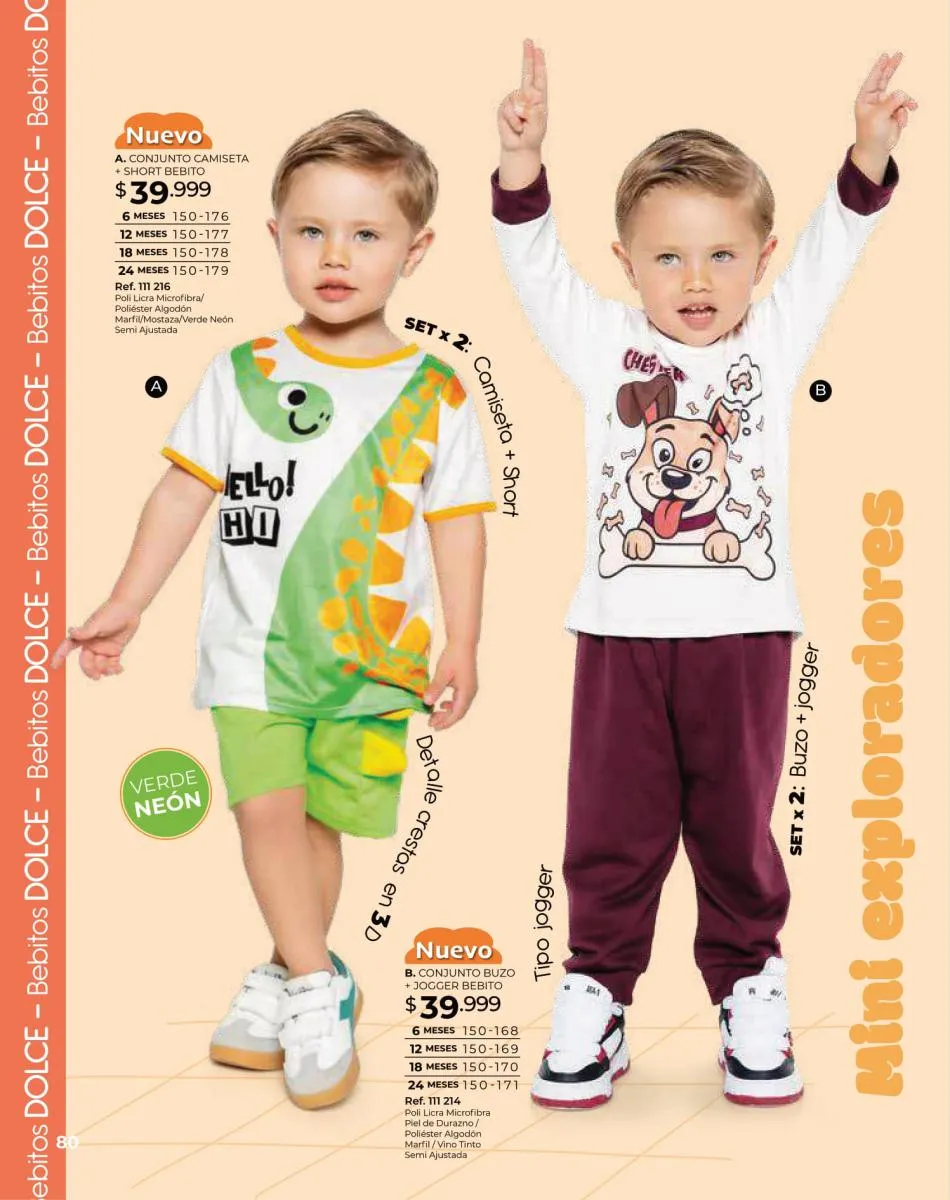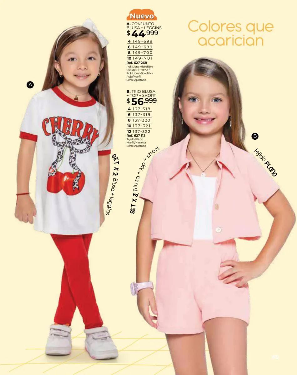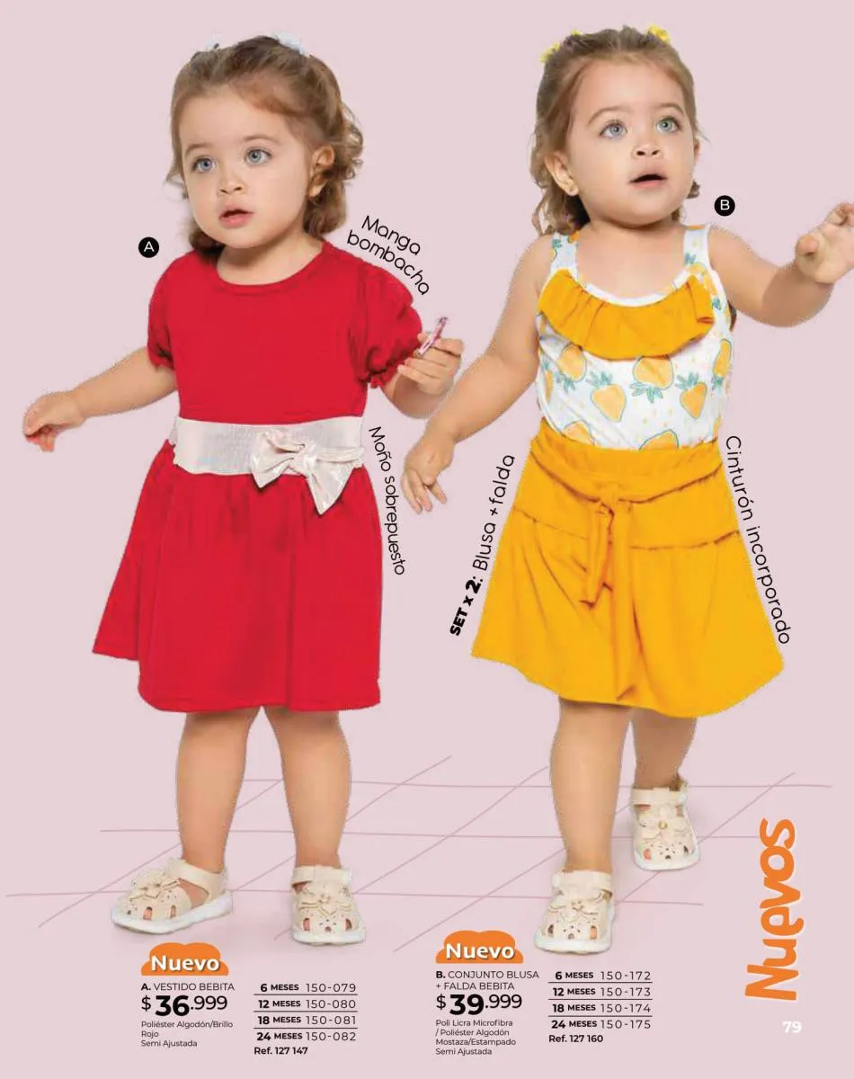 Para las bebitas el catálogo Dolce Colombia te trae un precioso mameluco en color palo rosa con detalle de pompones en pecho con mangas en boleros con bordes blancos y conjunto de blusa blanca estampada + short rosado con puntos blancos ambos en tallas 6/24 meses. Pag. 96.