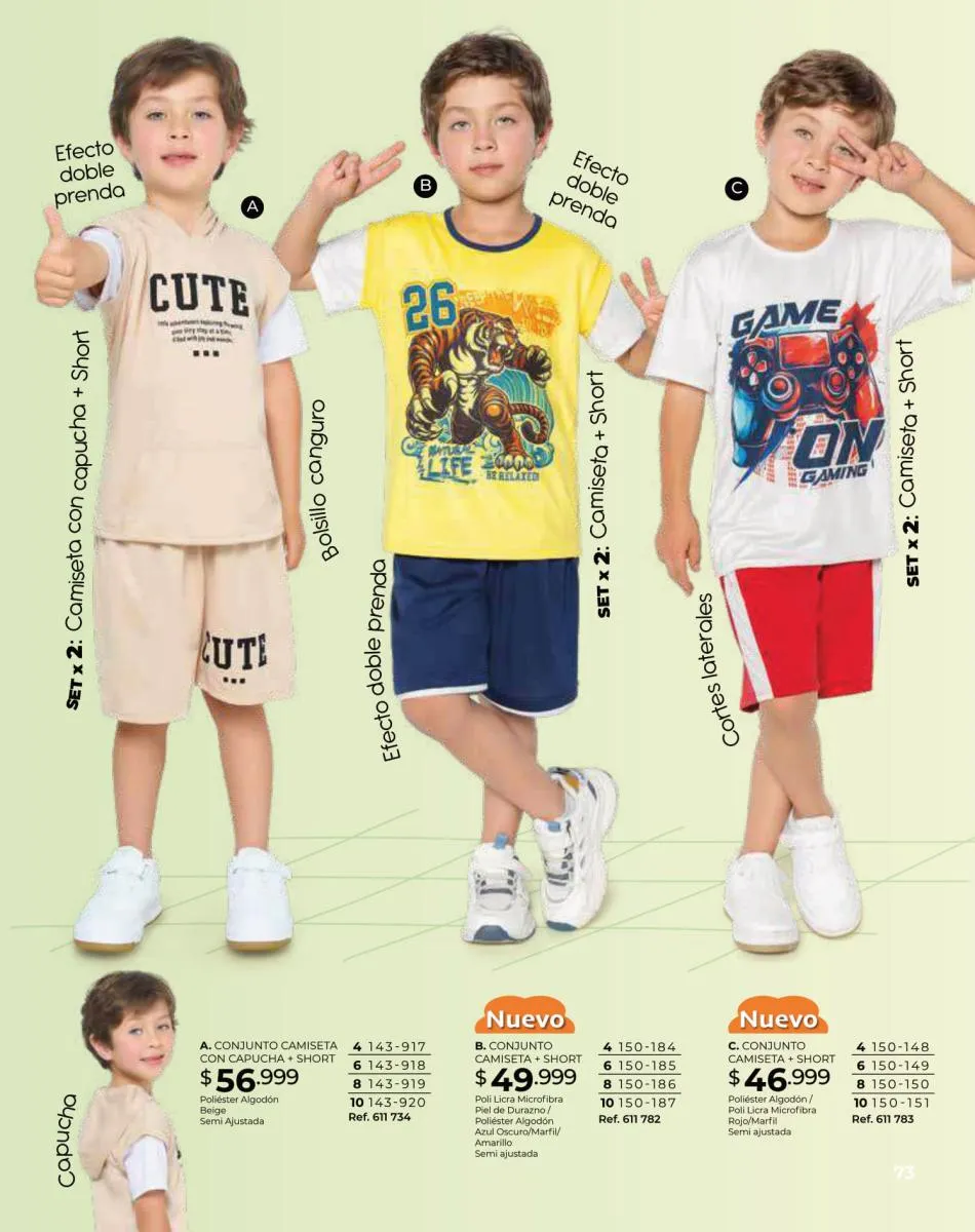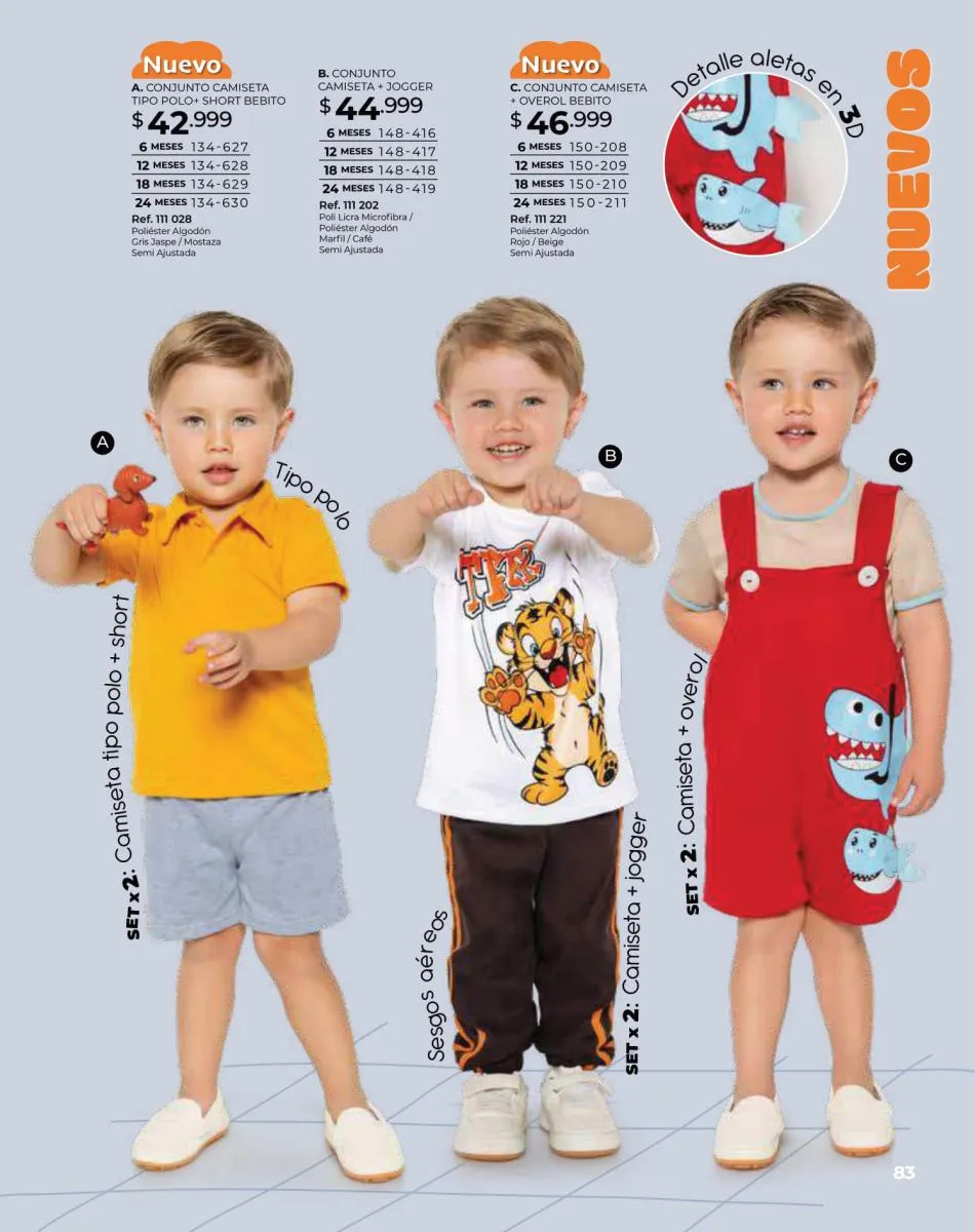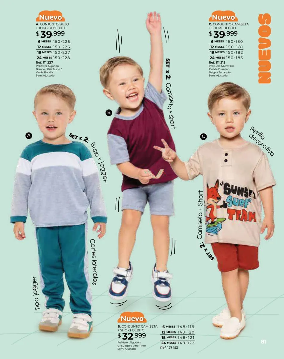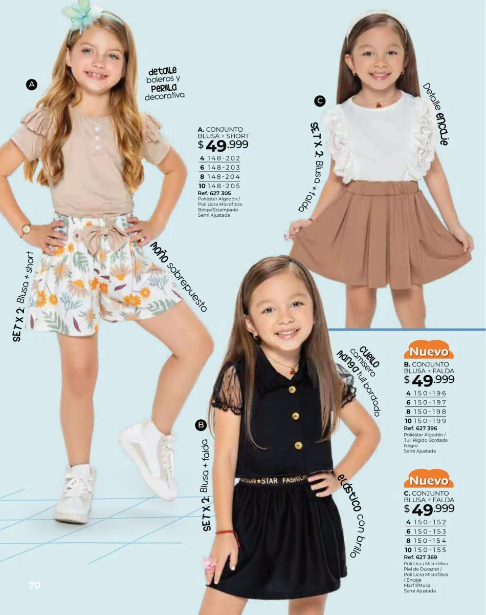 Para las bebitas el catálogo Dolce Colombia te trae un precioso mameluco en color palo rosa con detalle de pompones en pecho con mangas en boleros con bordes blancos y conjunto de blusa blanca estampada + short rosado con puntos blancos ambos en tallas 6/24 meses. Pag. 96.