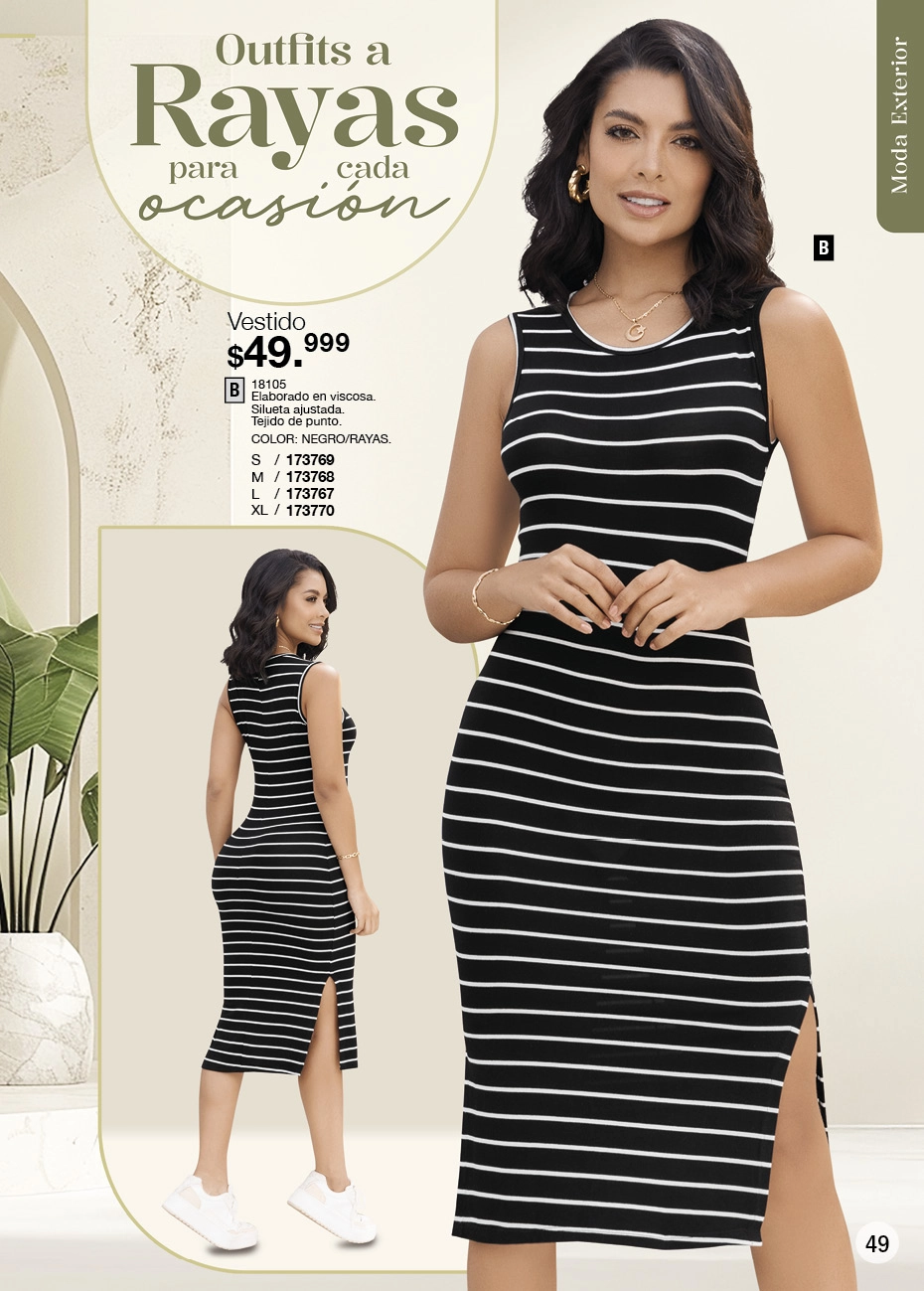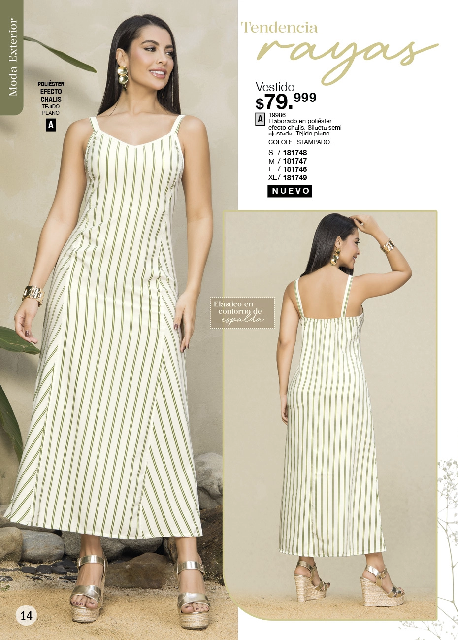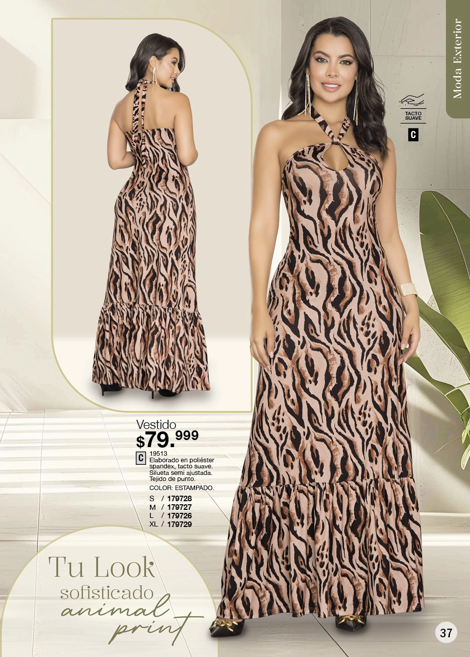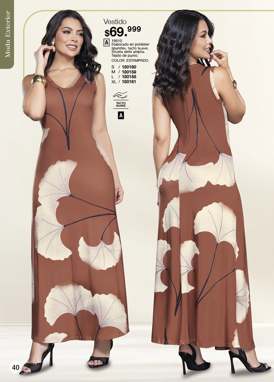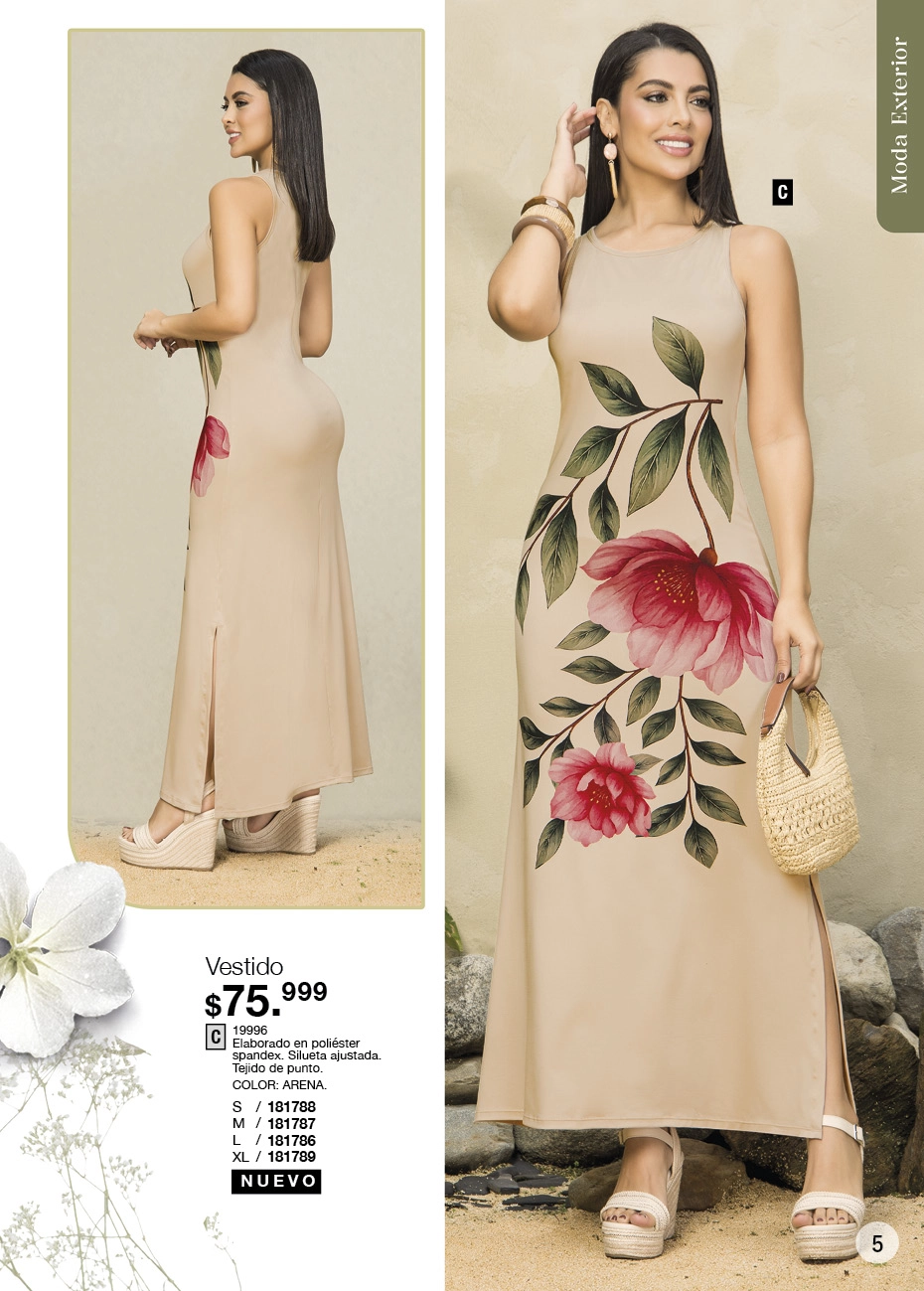 - Maxi vestido color azul oscuro con estampado floral blanco sin mangas con detalle de ajuste de nido de abejas en espalda y ruedo con doble boleros. En esta misma página se encuentra el vestido estilo blusón en color azul oscuro, de mangas largas que ajustan con elástica en puño y cinturón ajustable, lo puedes usar como una sola prenda o combinado con jeans blanco. Ambos vestidos en talla S/XL. Pag. 34.