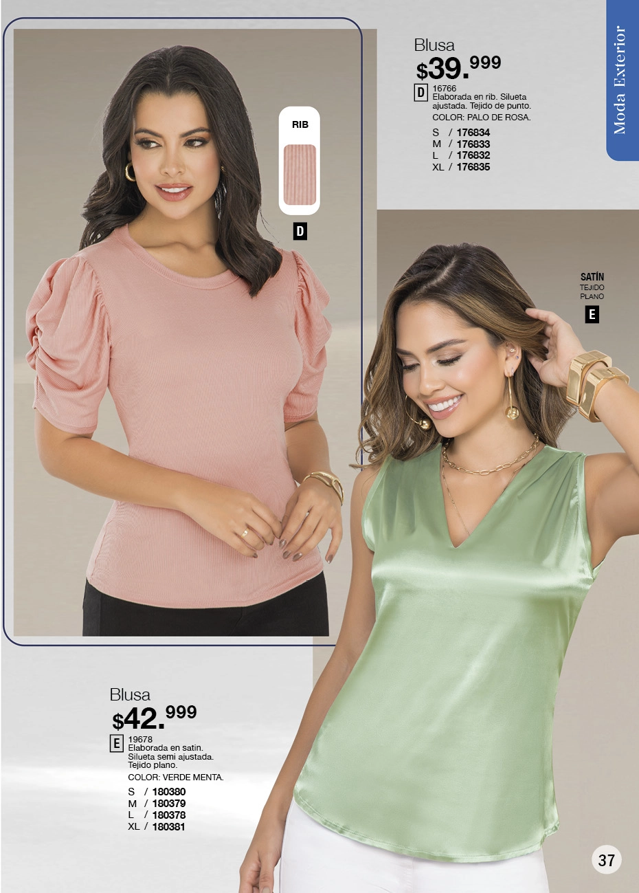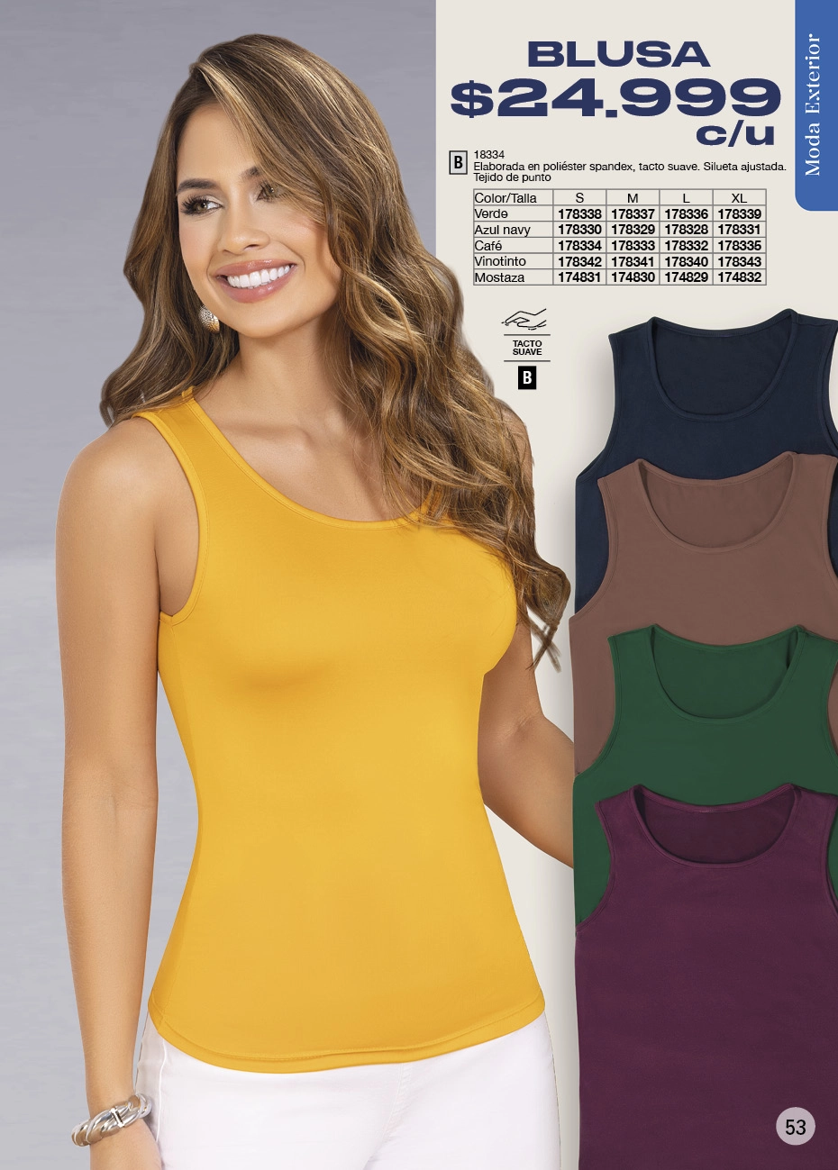 - Blusas en colores: negro, blanco y mostaza con detalle de mangas en boleros y cierre de cuello en herradura. Talla S/XL.