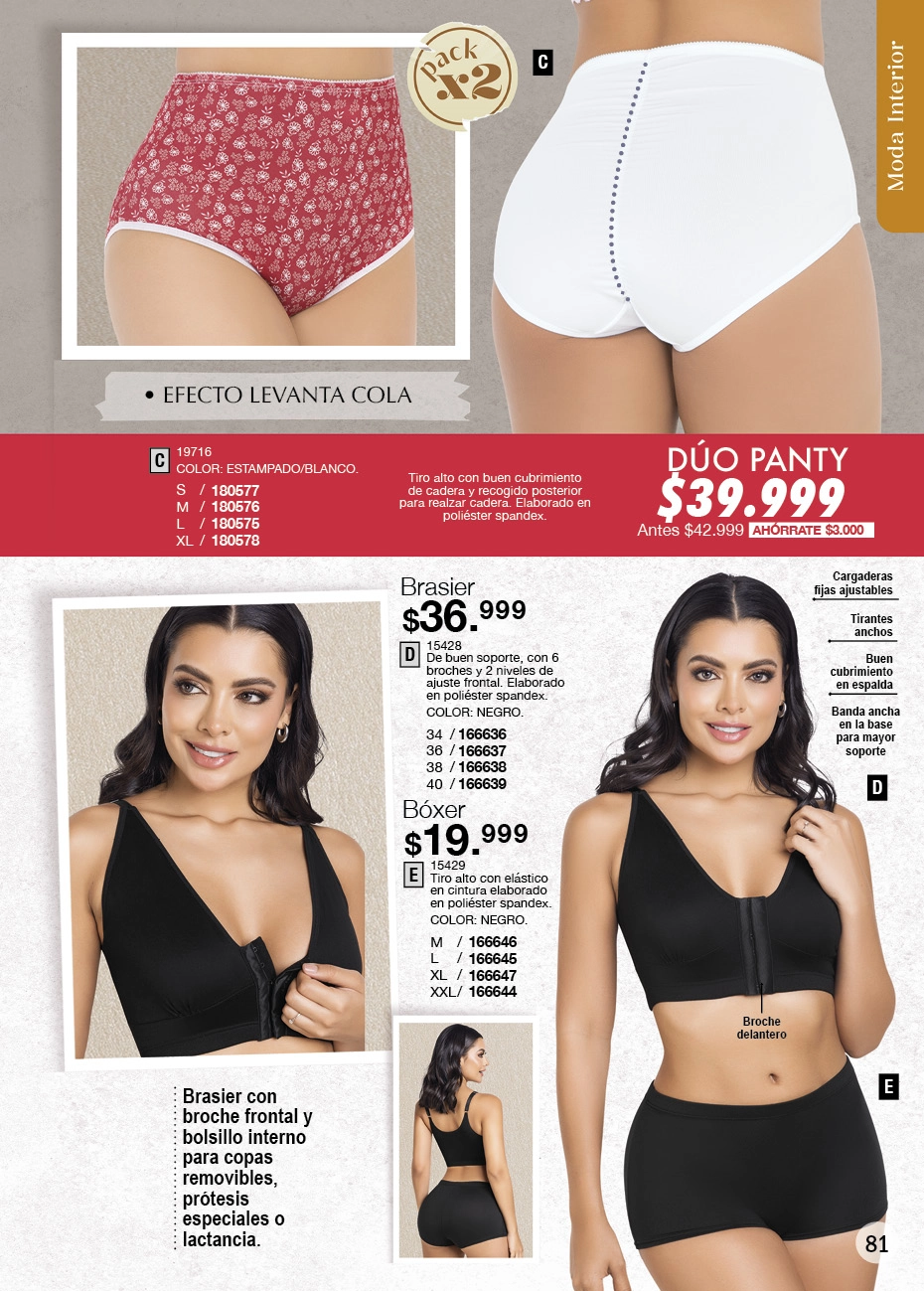 - La línea moldeadora te trae: cachetero faja con control de abdomen y caderas, en colores piel y negro y en la misma página el short íntimo con control de abdomen y sistema levanta colita.