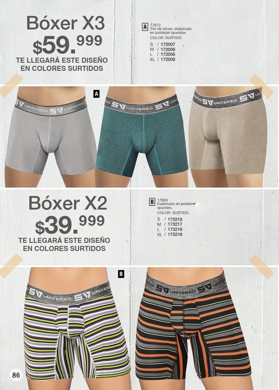 - Pack de tres bóxers en colores estampados y sólidos en todas las tallas.
