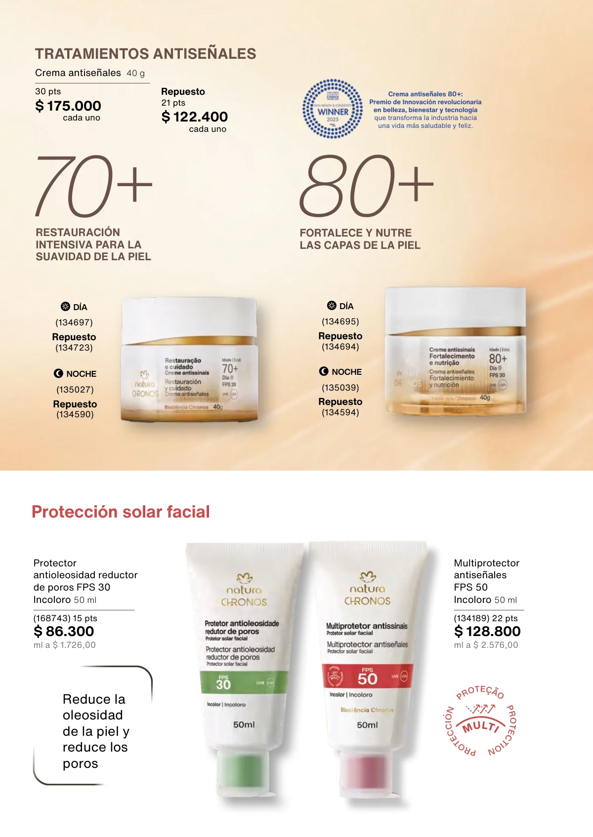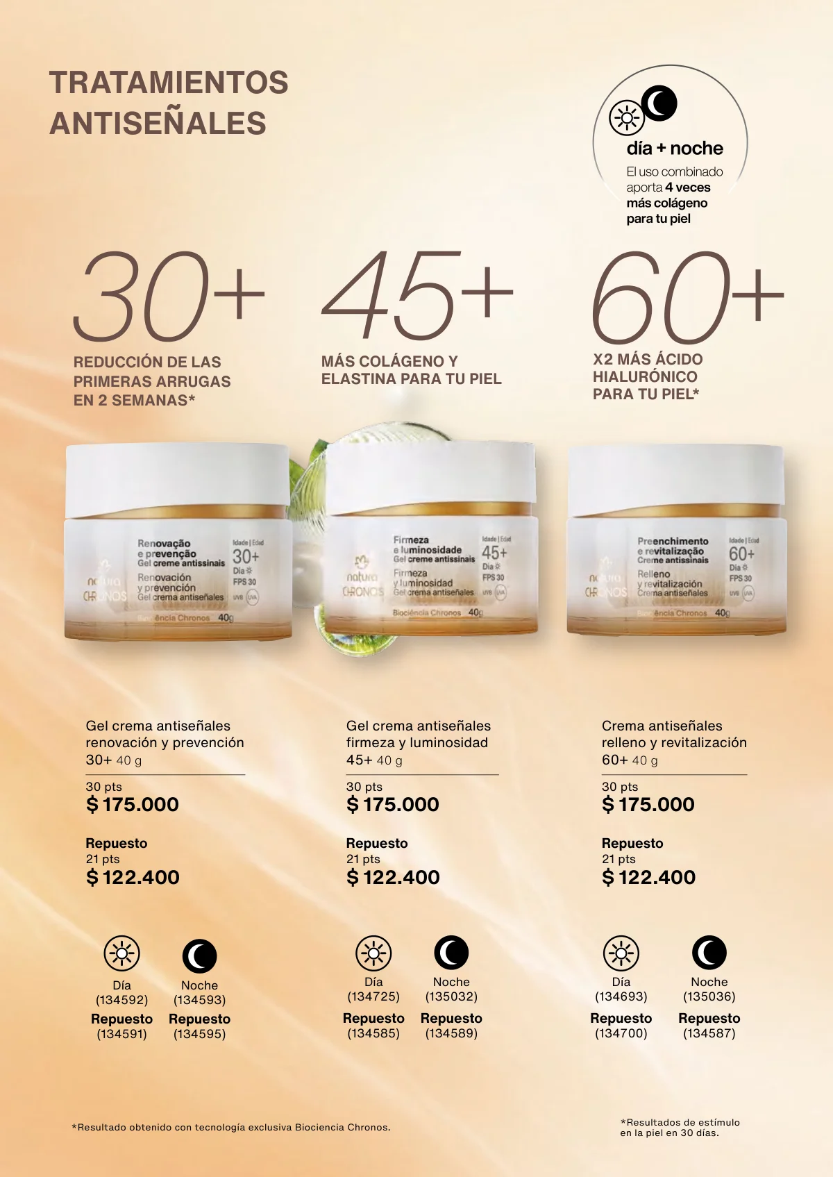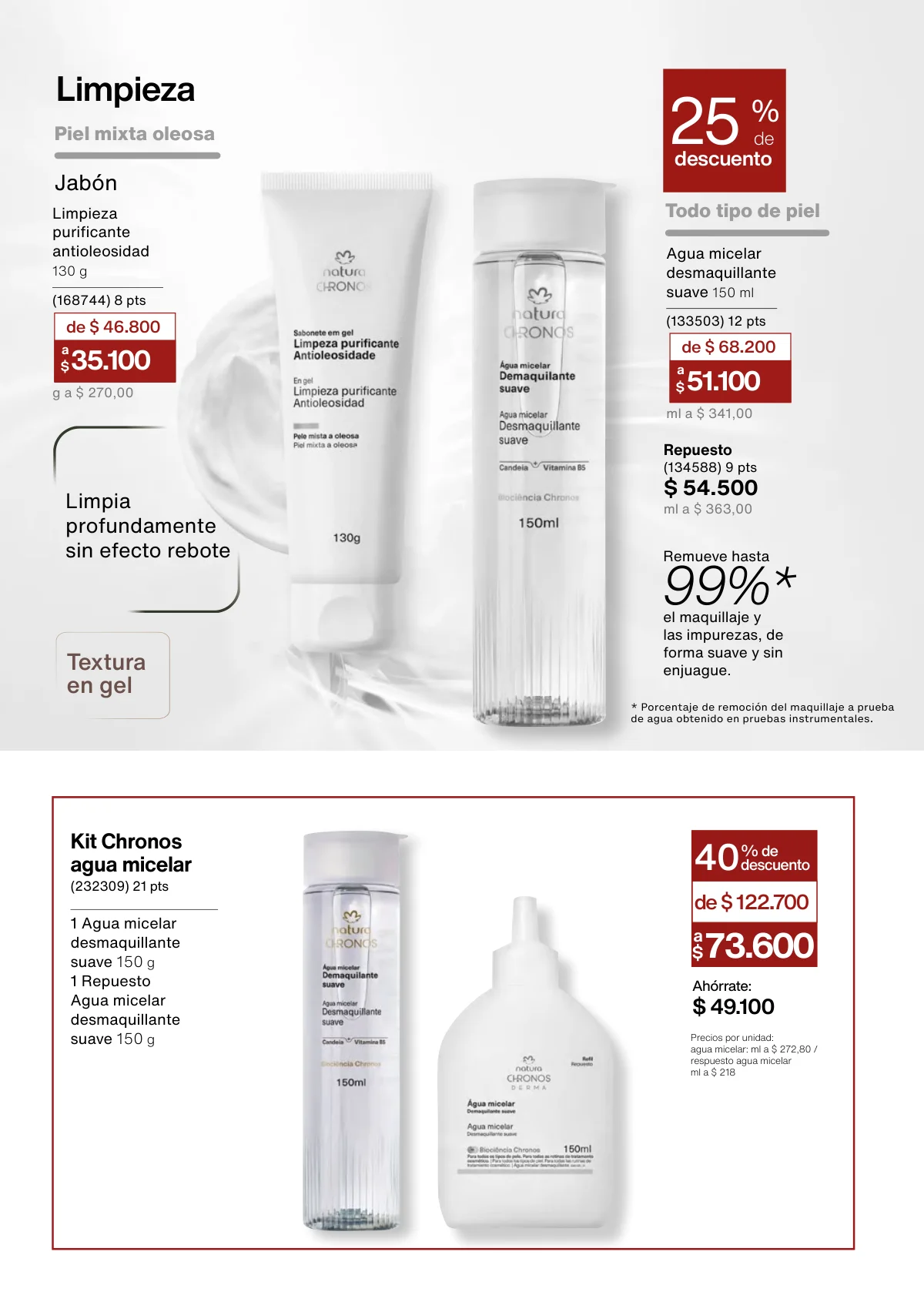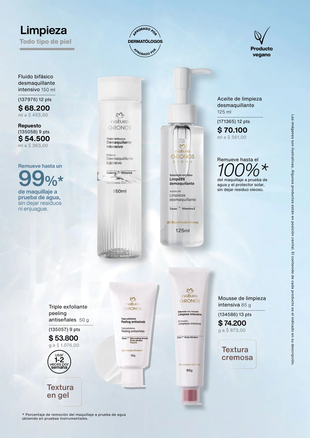 Porque la belleza se manifiesta en la piel en el catálogo Natura Ciclo campaña 1 2026 Colombia, Chronos presenta la línea limpieza y tonificación que mantiene tu piel libre de oleosidad, impurezas y residuos.