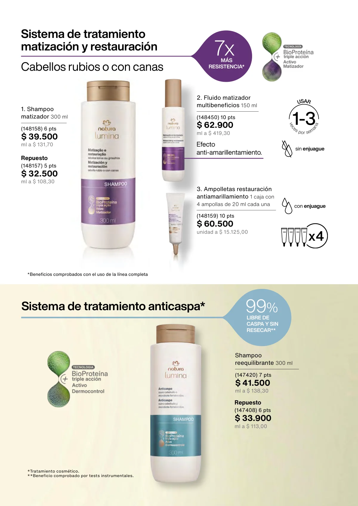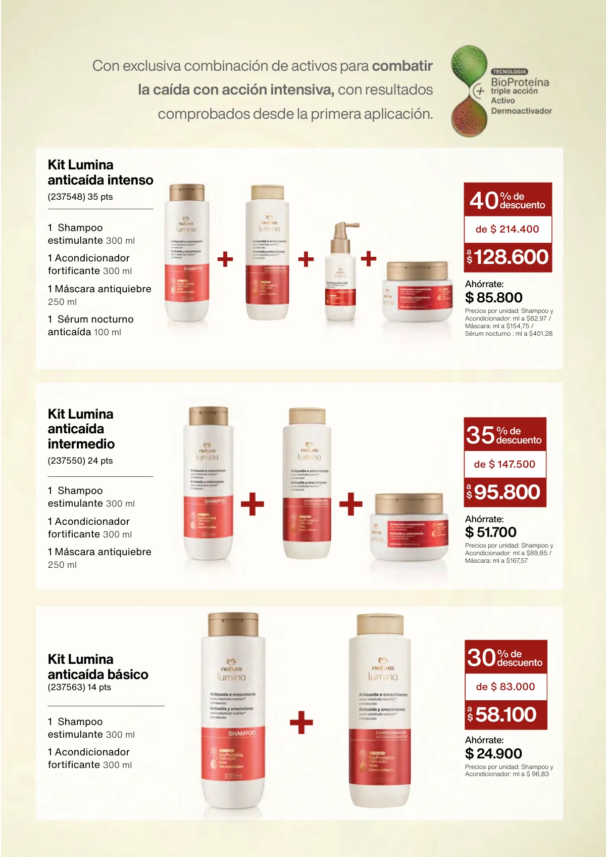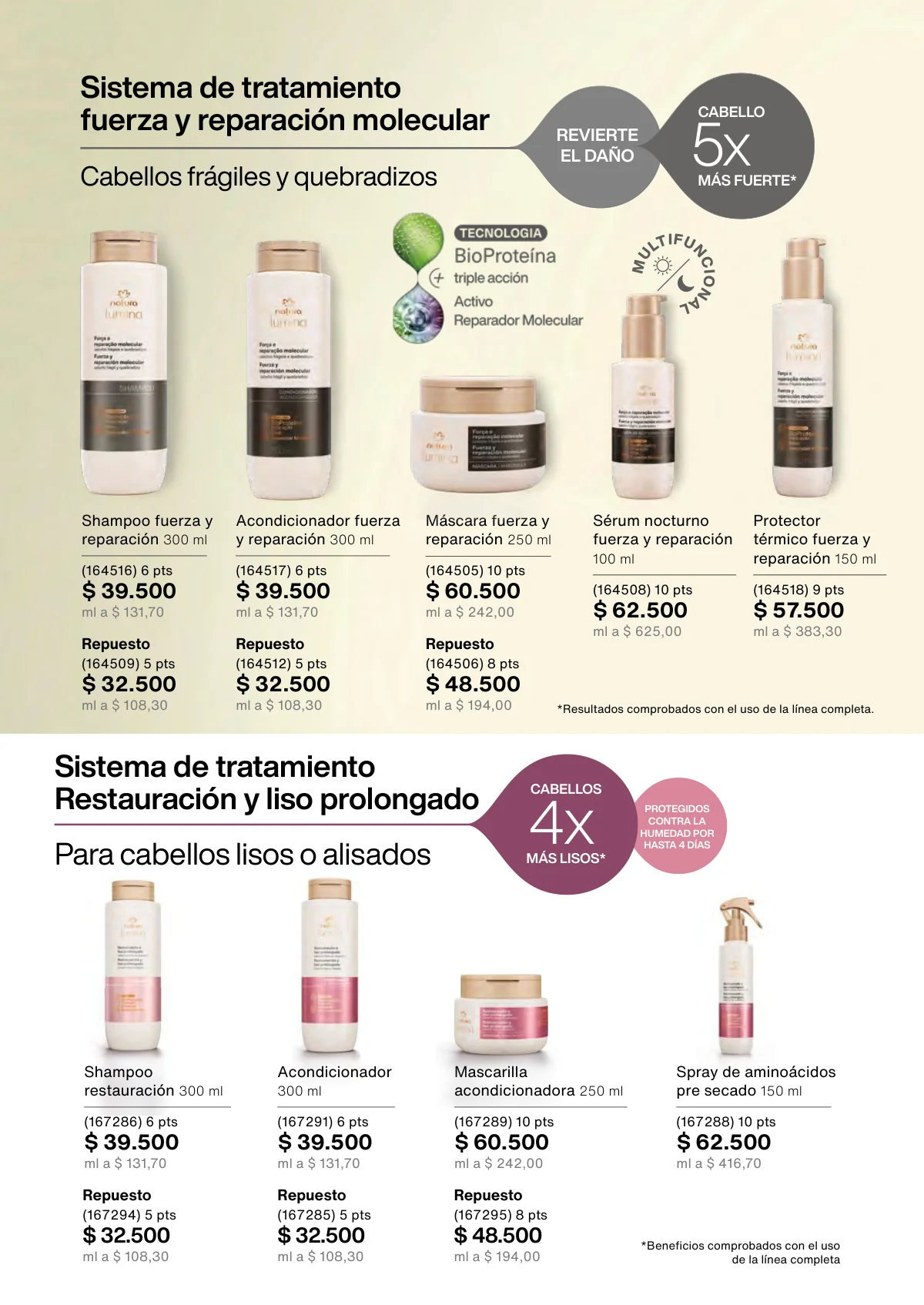 • Revitalización post química: Shampoo y acondicionador de 300ml; máscara intensiva de 250ml; kit choque restaurador.