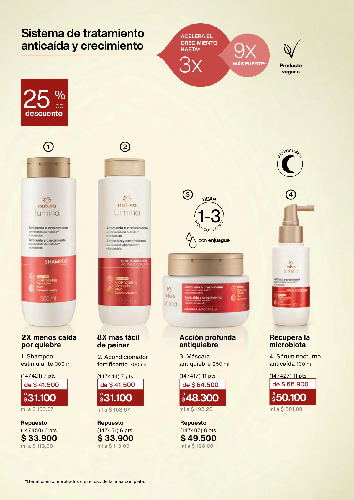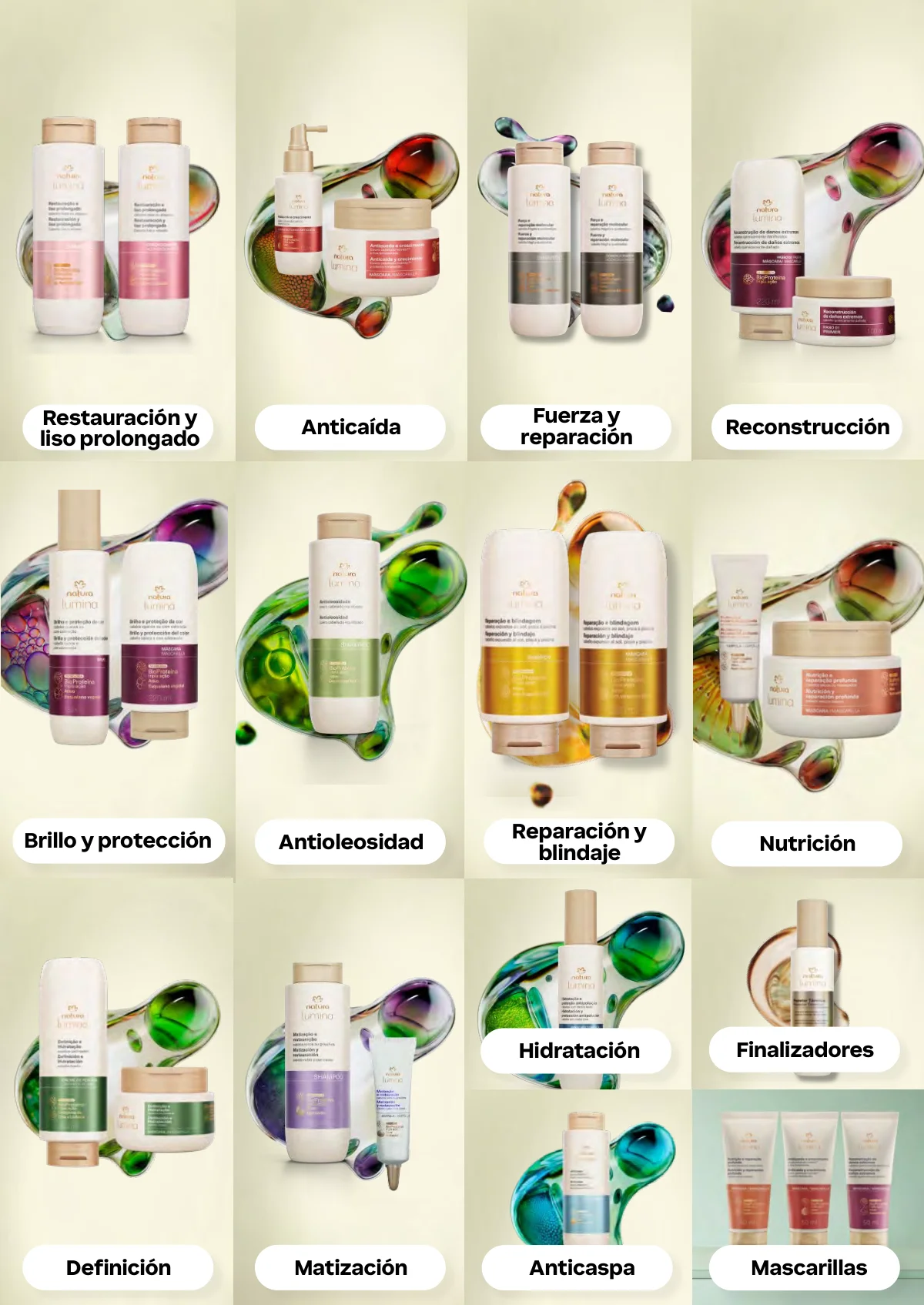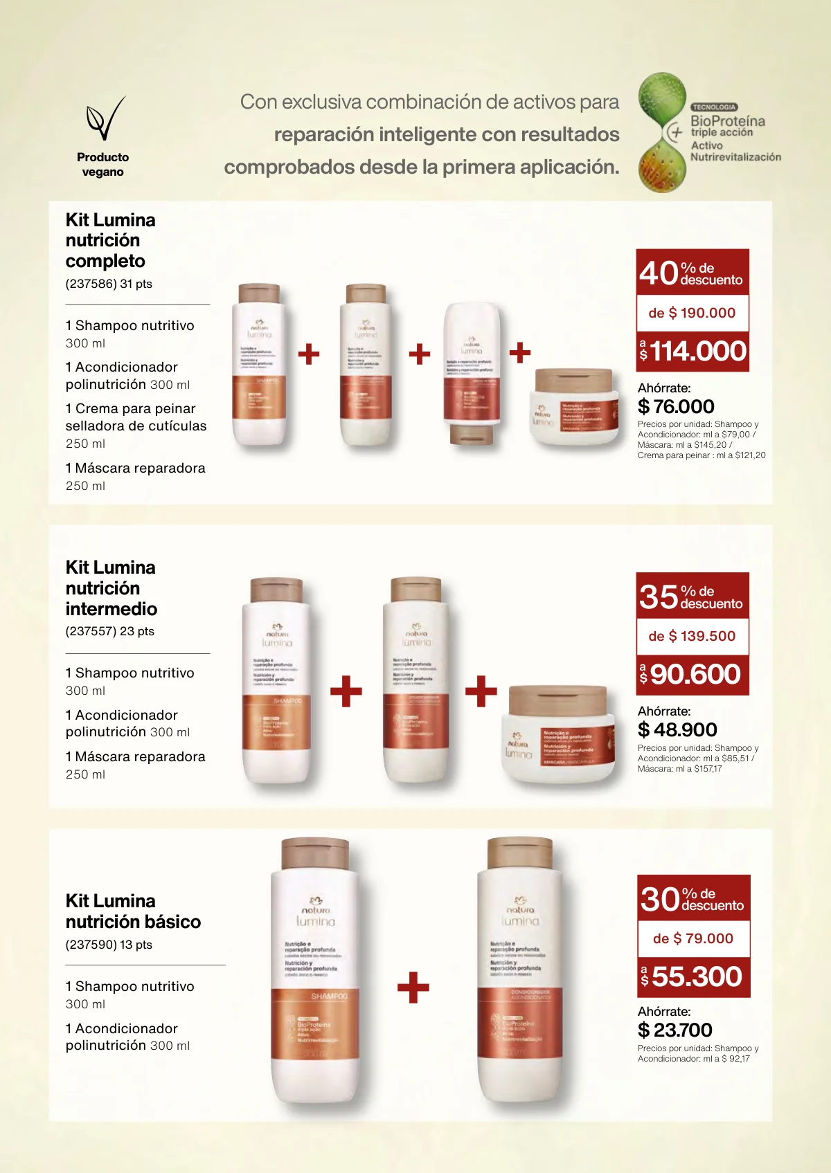 • Revitalización post química: Shampoo y acondicionador de 300ml; máscara intensiva de 250ml; kit choque restaurador.