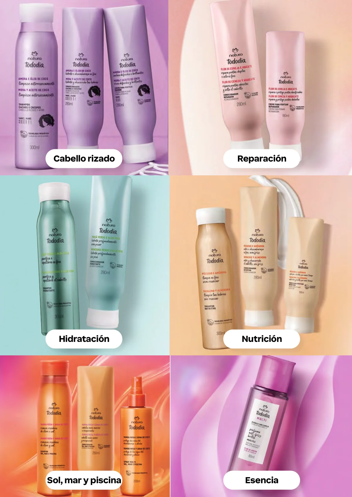• Nutrición y brillo: Shampoo y acondicionador de 300ml; mascara de tratamiento capilar de 250g; oleo de tratamiento capilar sin enjuague de 10ml.