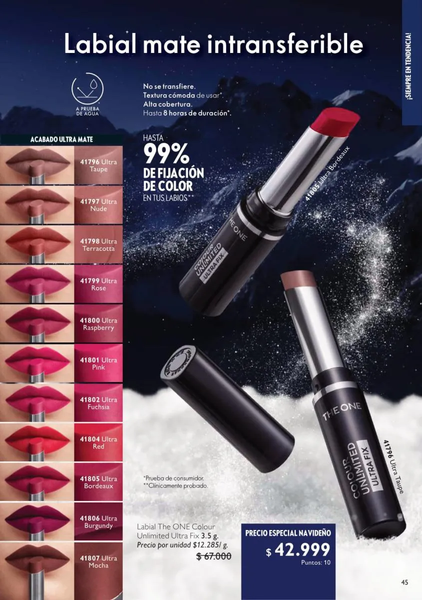 Y a un 35% off puedes llevar los tonos de labial intransferible más hermosos para unos labios absolutamente tentadores. (pág. 102).
