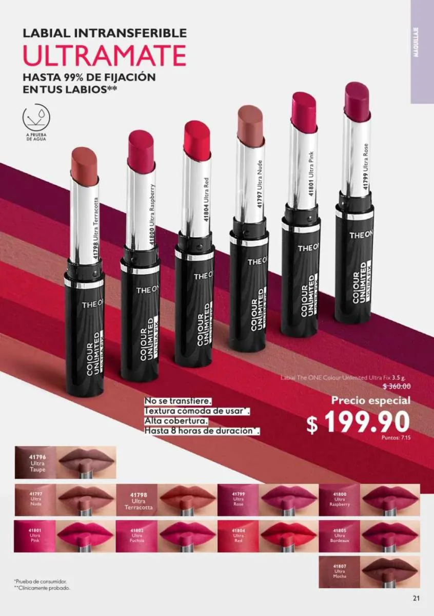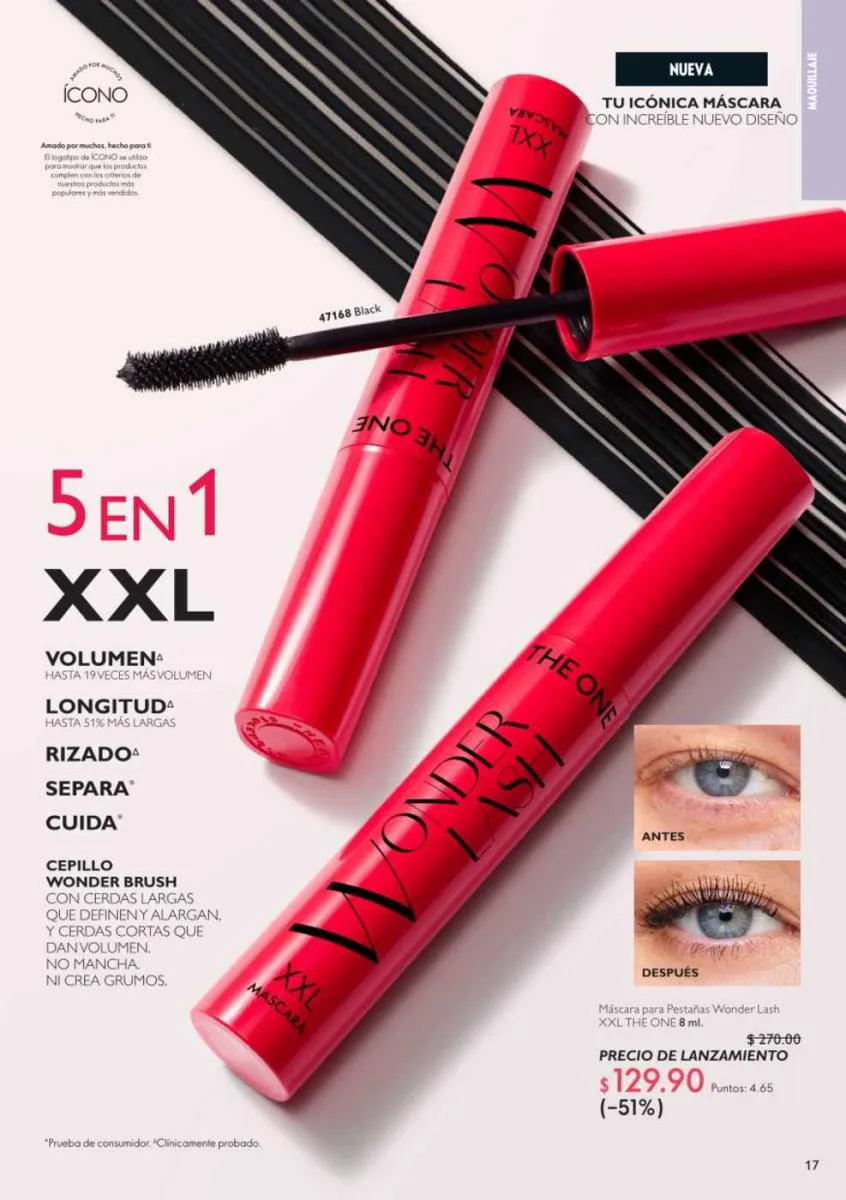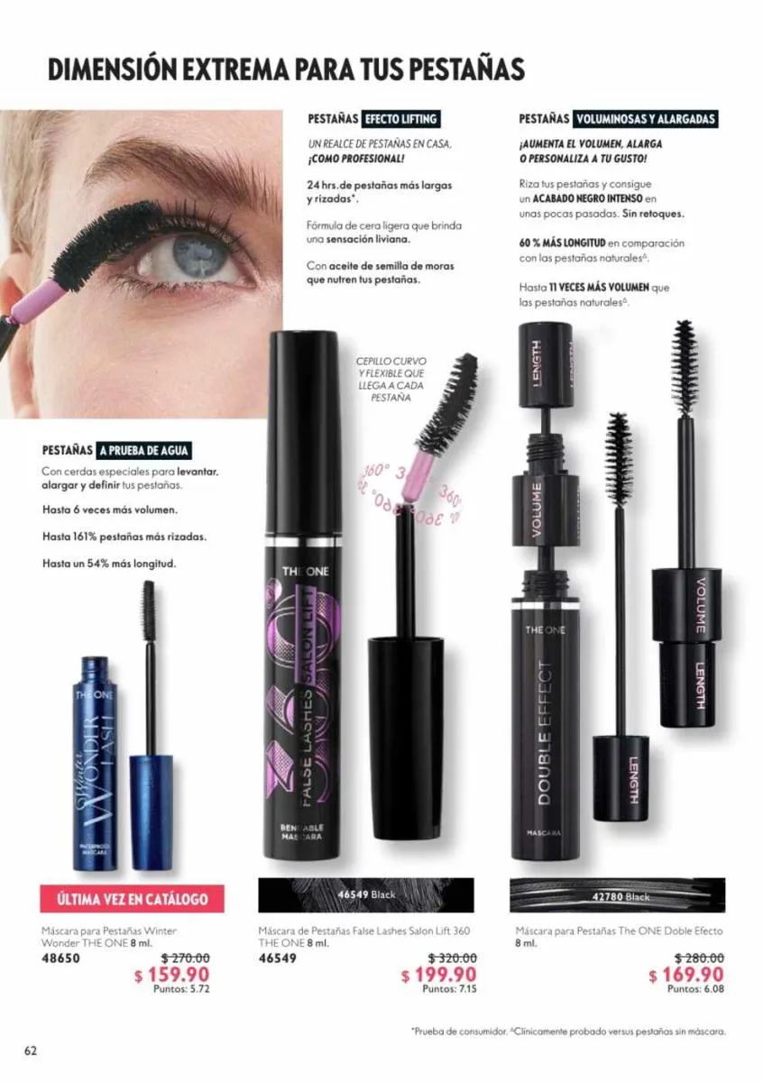 - Mascara de pestañas The ONE Lash de 8 ml, alarga y levanta las pestañas a prueba de agua, contiene vitamina E.