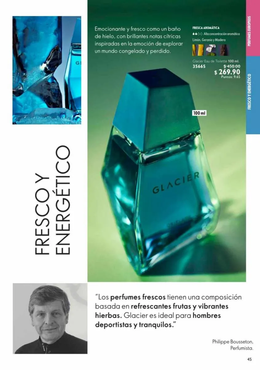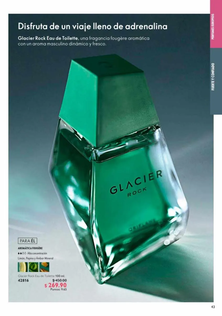 - Eau de toilette masculino de 100ml, Glacier Fire, fragancia amaderada: menta, limón negro, maderas vibrantes, intensidad alta.