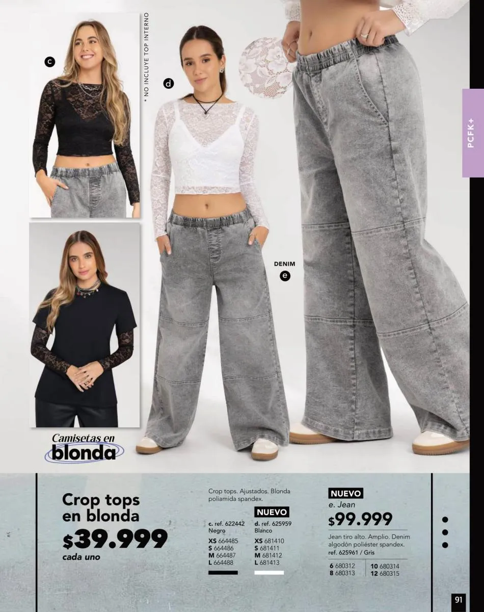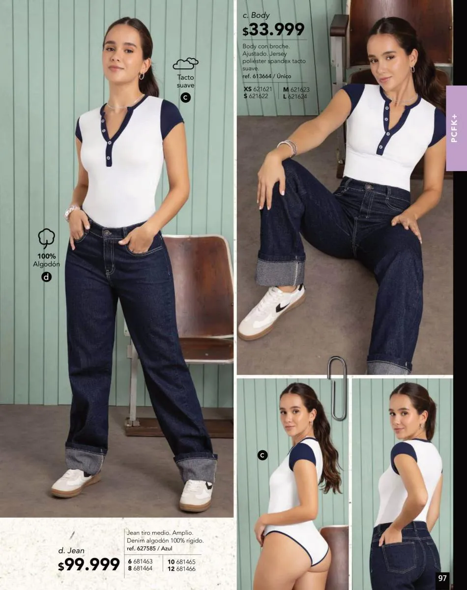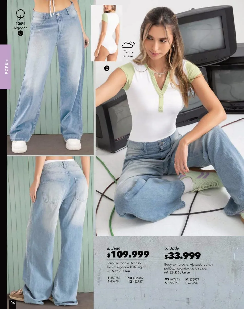 - Jean Bourbon relaxed tiro alto, pierna y bota amplia, elaborado en Denim 100% algodón, talla 28/36. Pag 97.