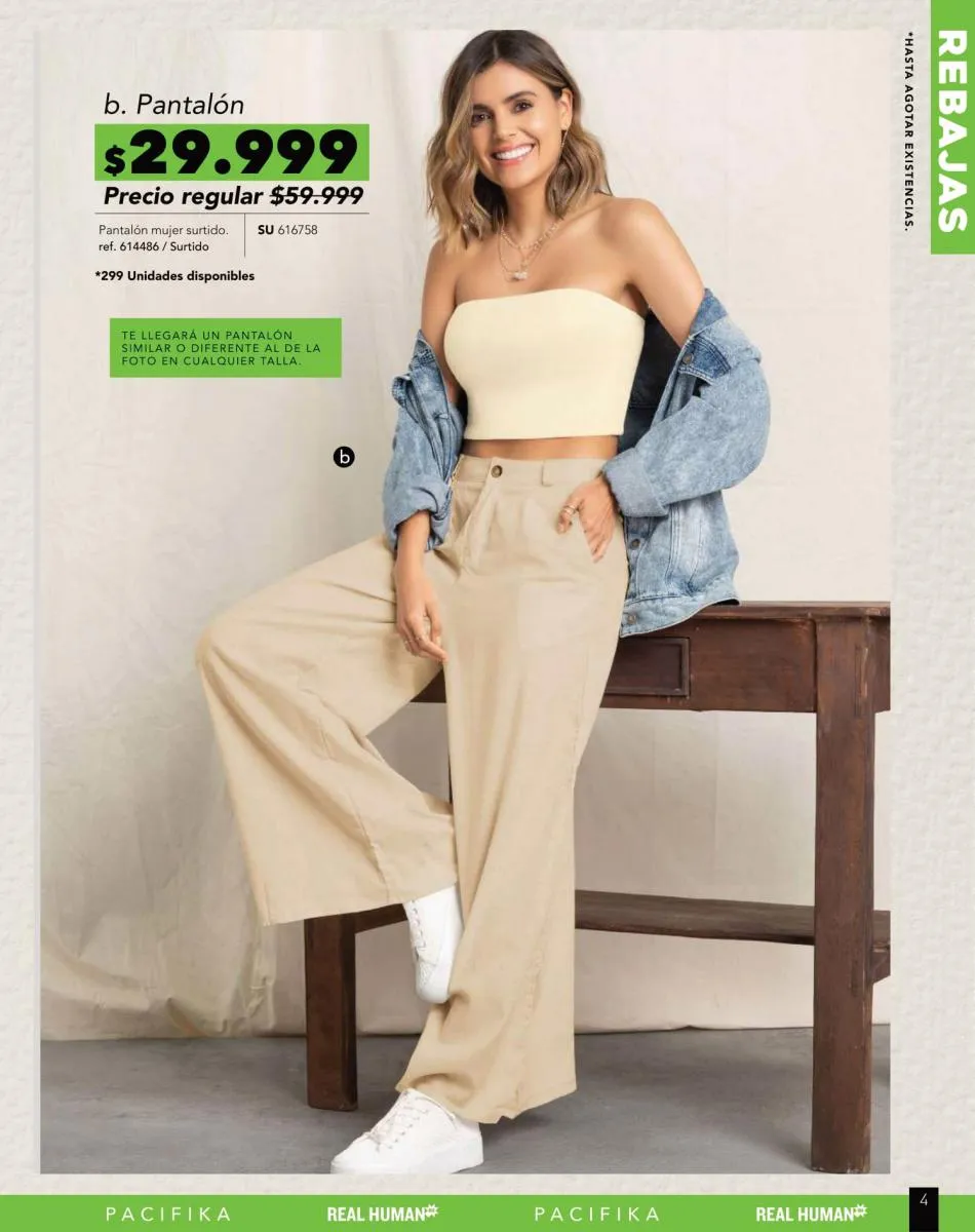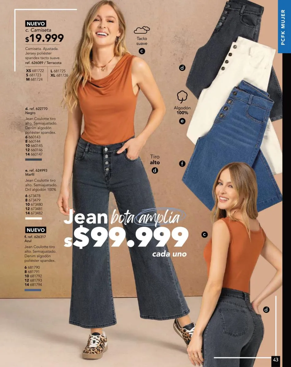 - Jean Madison mom fit, tiro súper alto con pierna amplia y bota recta, elaborado en Dril 100% algodón, modelo disponible en color beige, talla 6/14. Pag 12.