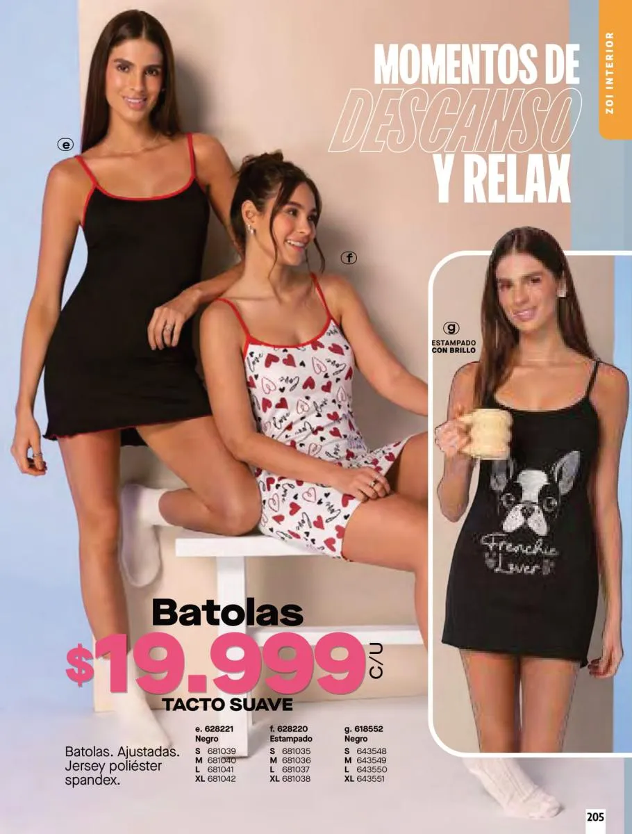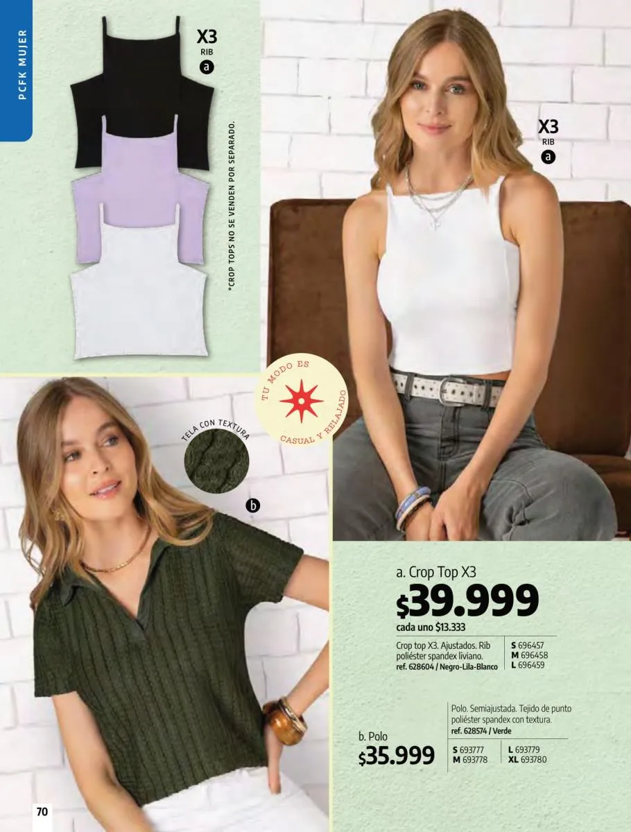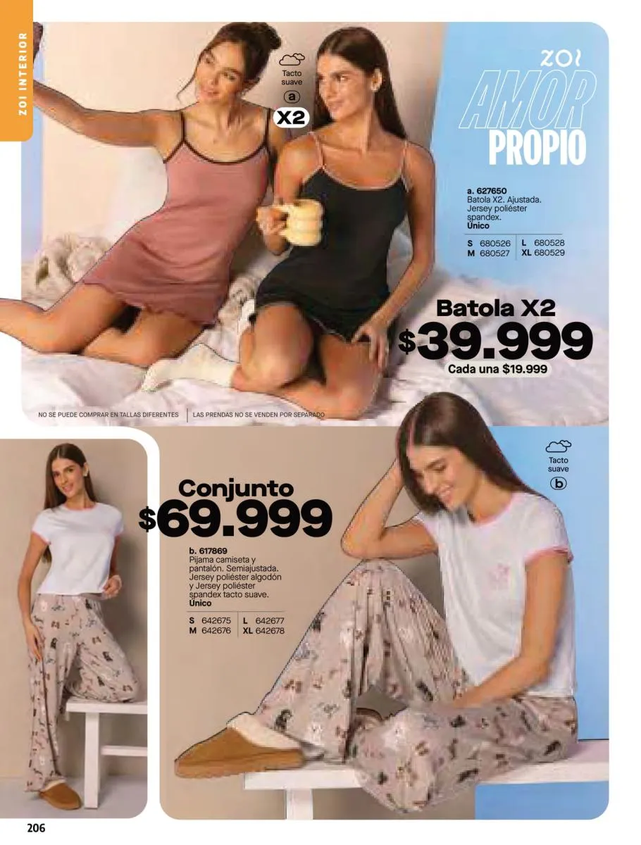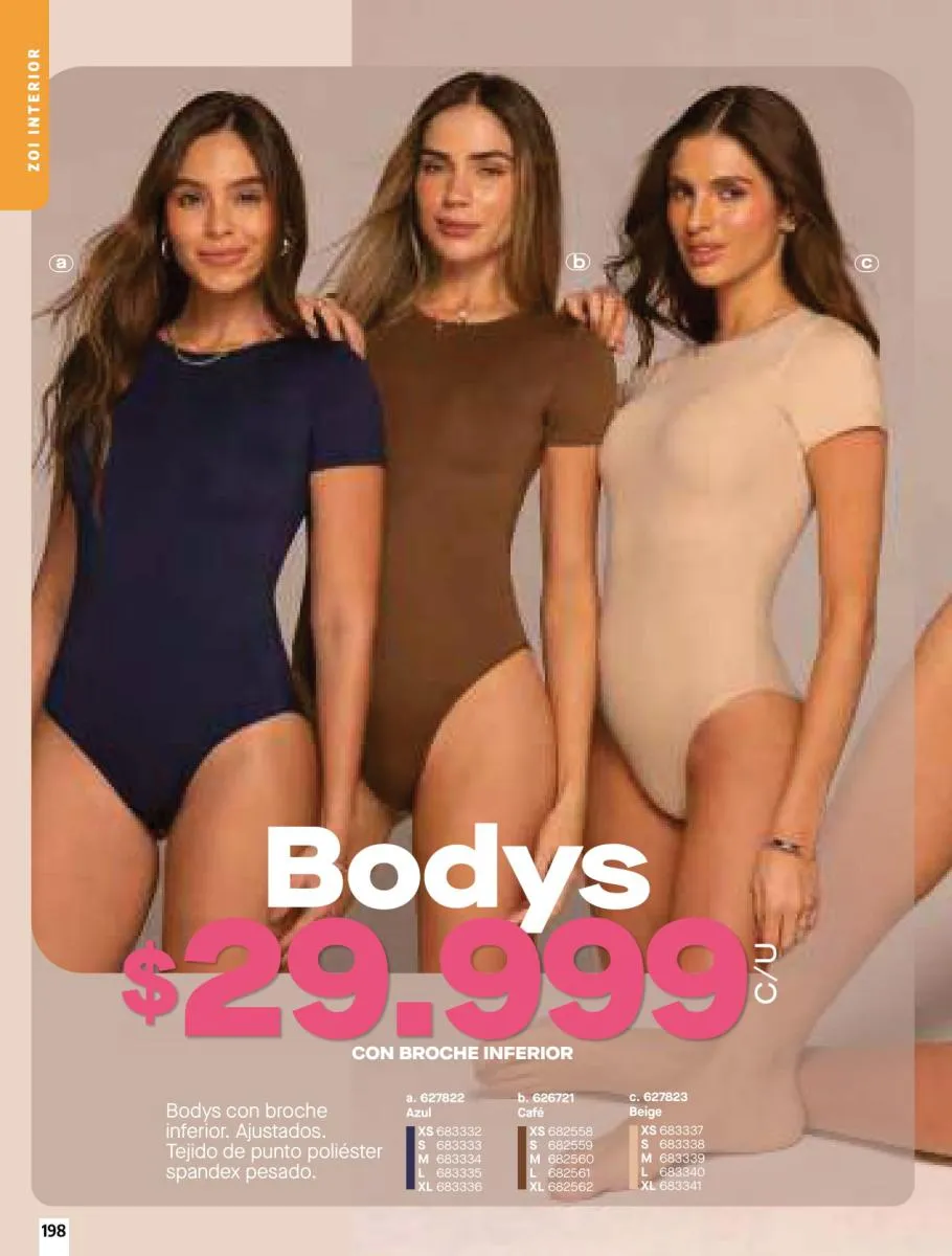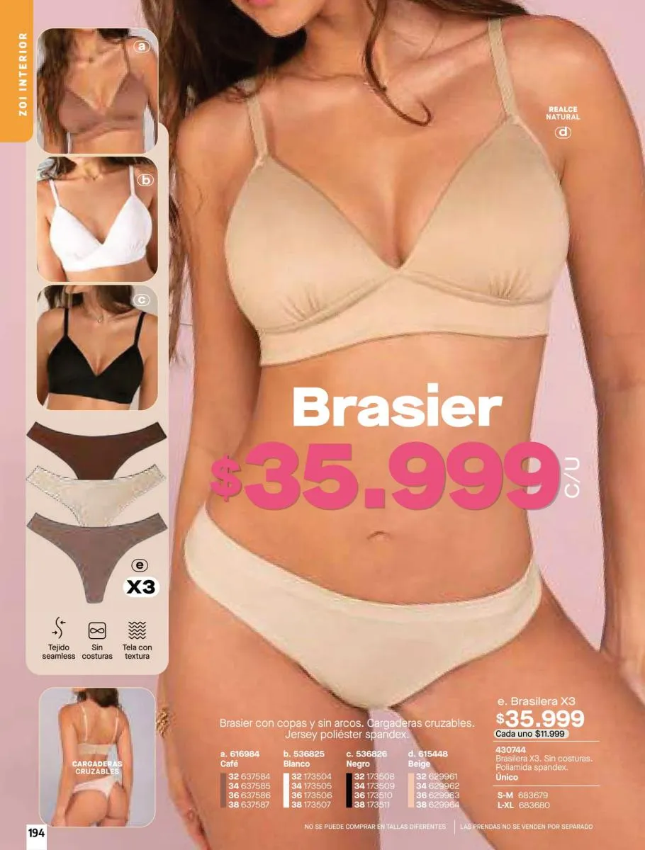 • Brassier con copa sin varilla, elaborado en tela Jersey poliéster algodón stretch, disponible en colores: Azul claro, azul oscuro y con diseño de estampado floral, talla 32/38. Pag 67.
