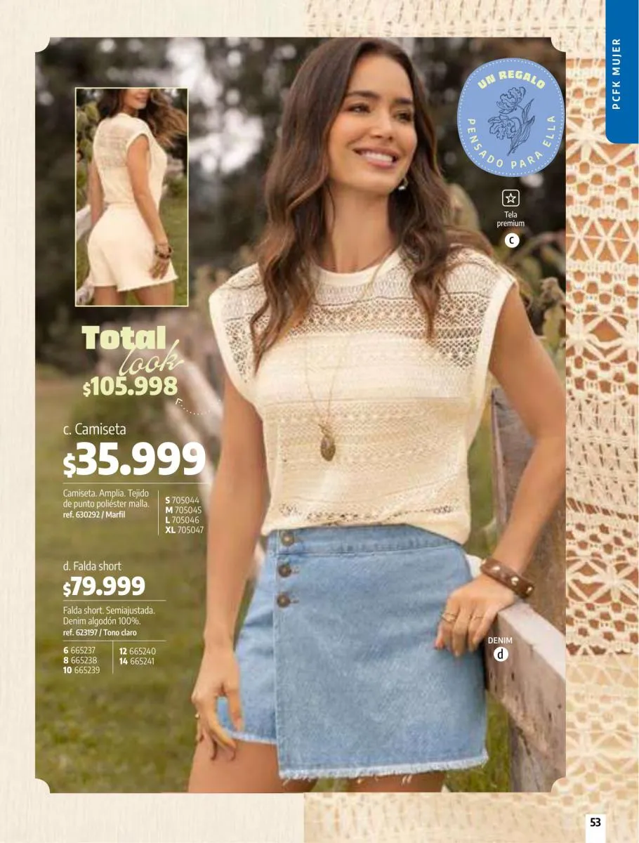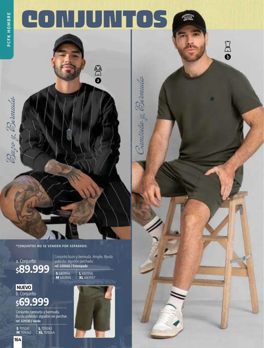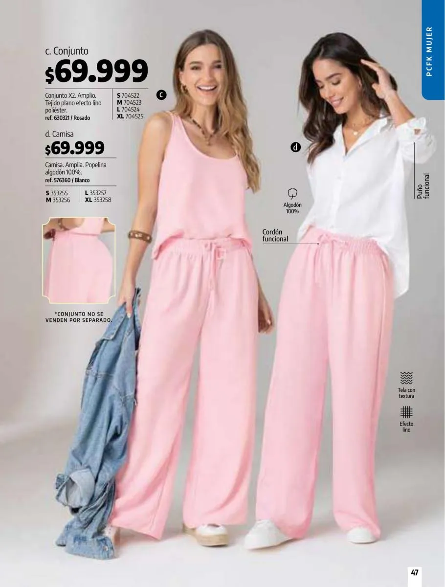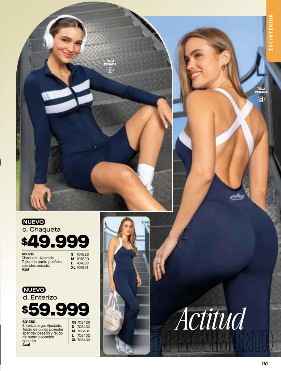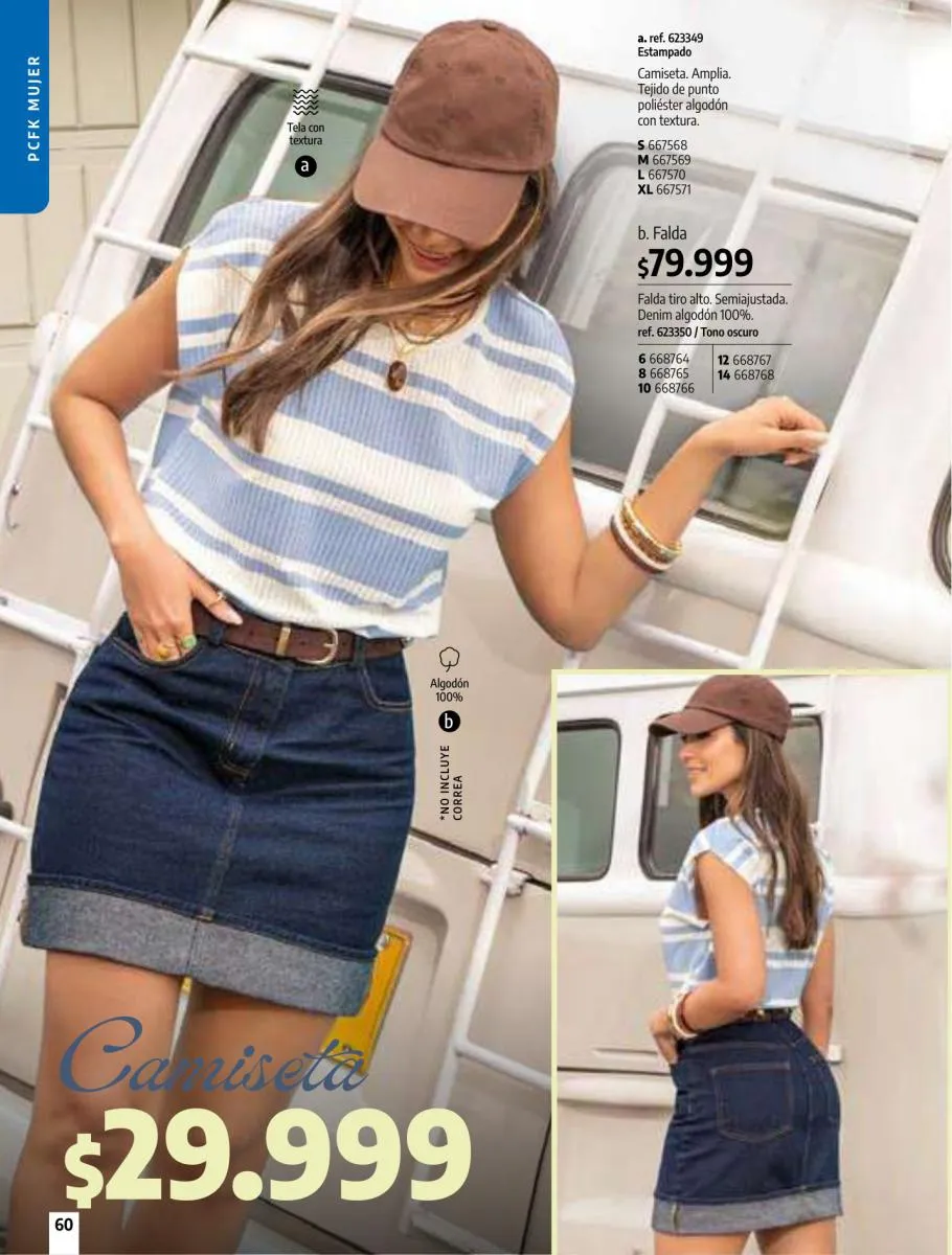 - Conjunto para niña, conformado por: camiseta y short, elaborados en burda liviana poliéster y algodón sin perchar, disponible en color azul, talla 6/14 y conjunto Mujer conformado por camiseta y short ambas piezas elaboradas en burda liviana poliéster y algodón sin perchar, silueta semi ajustada, en color azul, talla XS/XL. Pag 117.
