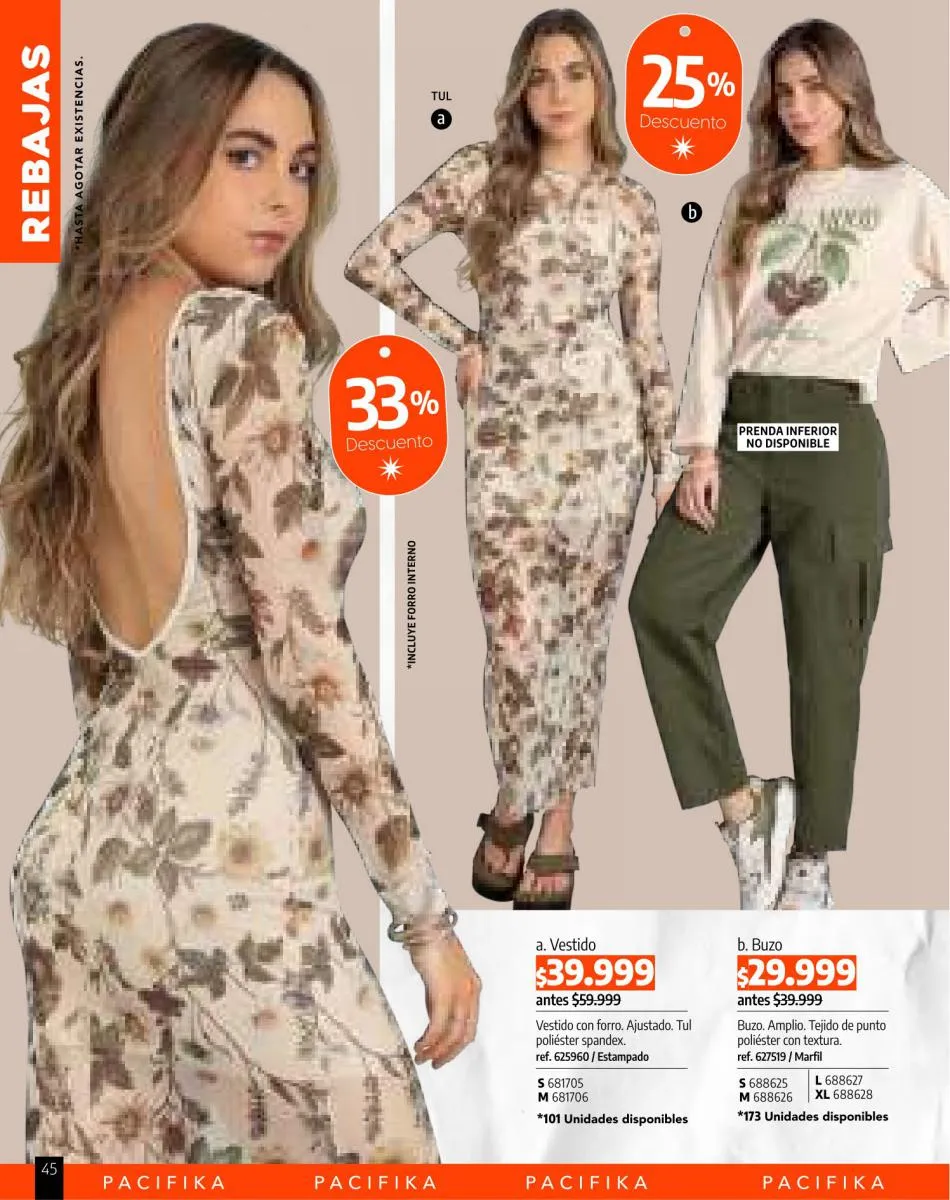 - Maxi vestido manga sisa, elaborado en Chalis viscosa, silueta amplia, con diseño floral estampado, talla XS/XL. Pag 7.