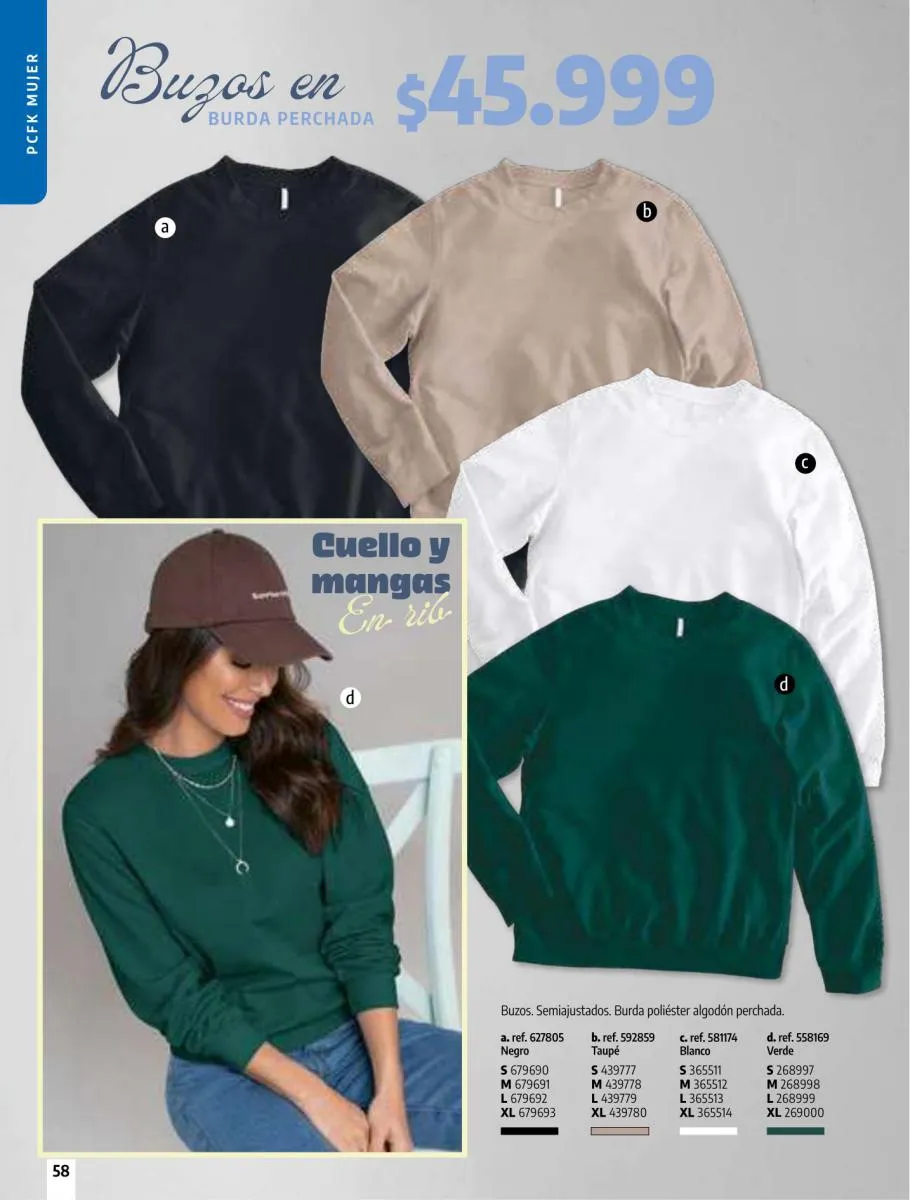 - Kimono largo manga sisa, elaborado en Chalis viscosa, silueta amplia, un regalo ideal para mamá, disponible en color verde, talla XS/XL. Pag 15.