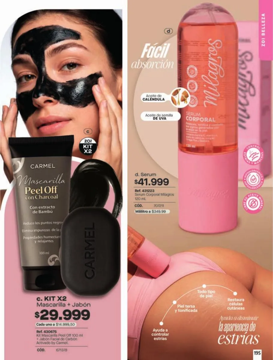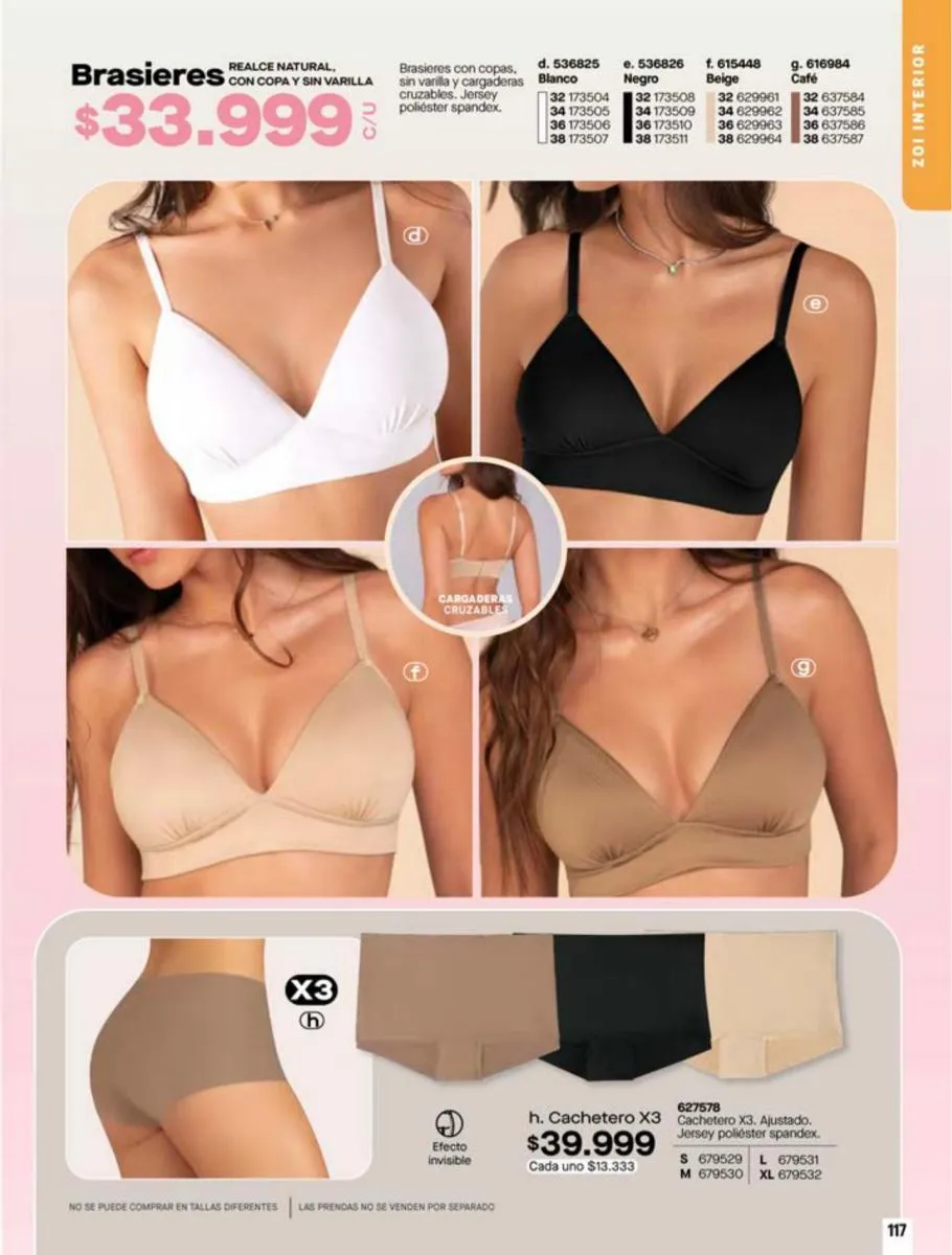 - Dúo de Brassier con copa de realce interno, elaborado en Jersey poliéster algodón stretch, disponible en colores: Blanco/negro, talla 32/38. Pag 63.