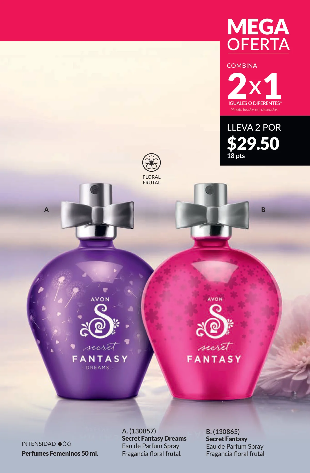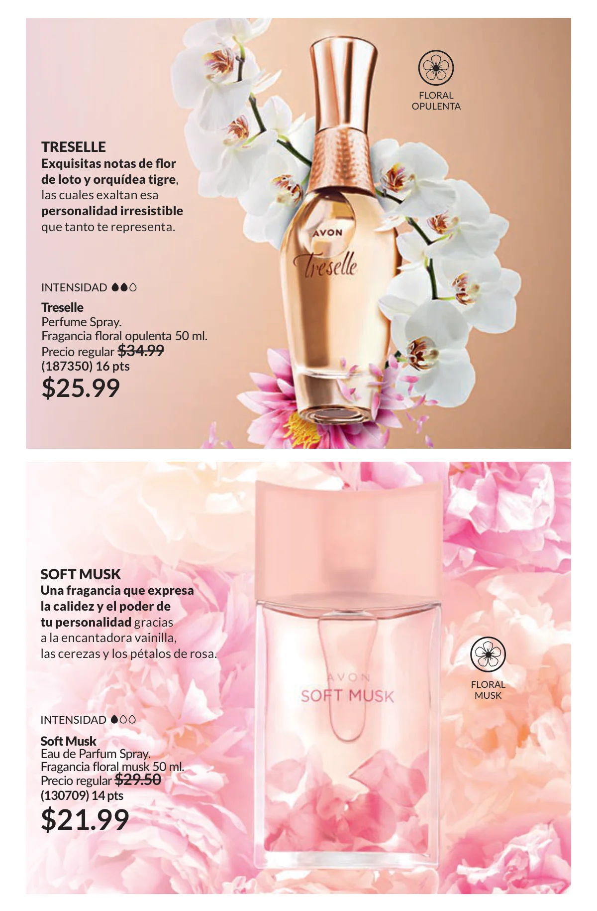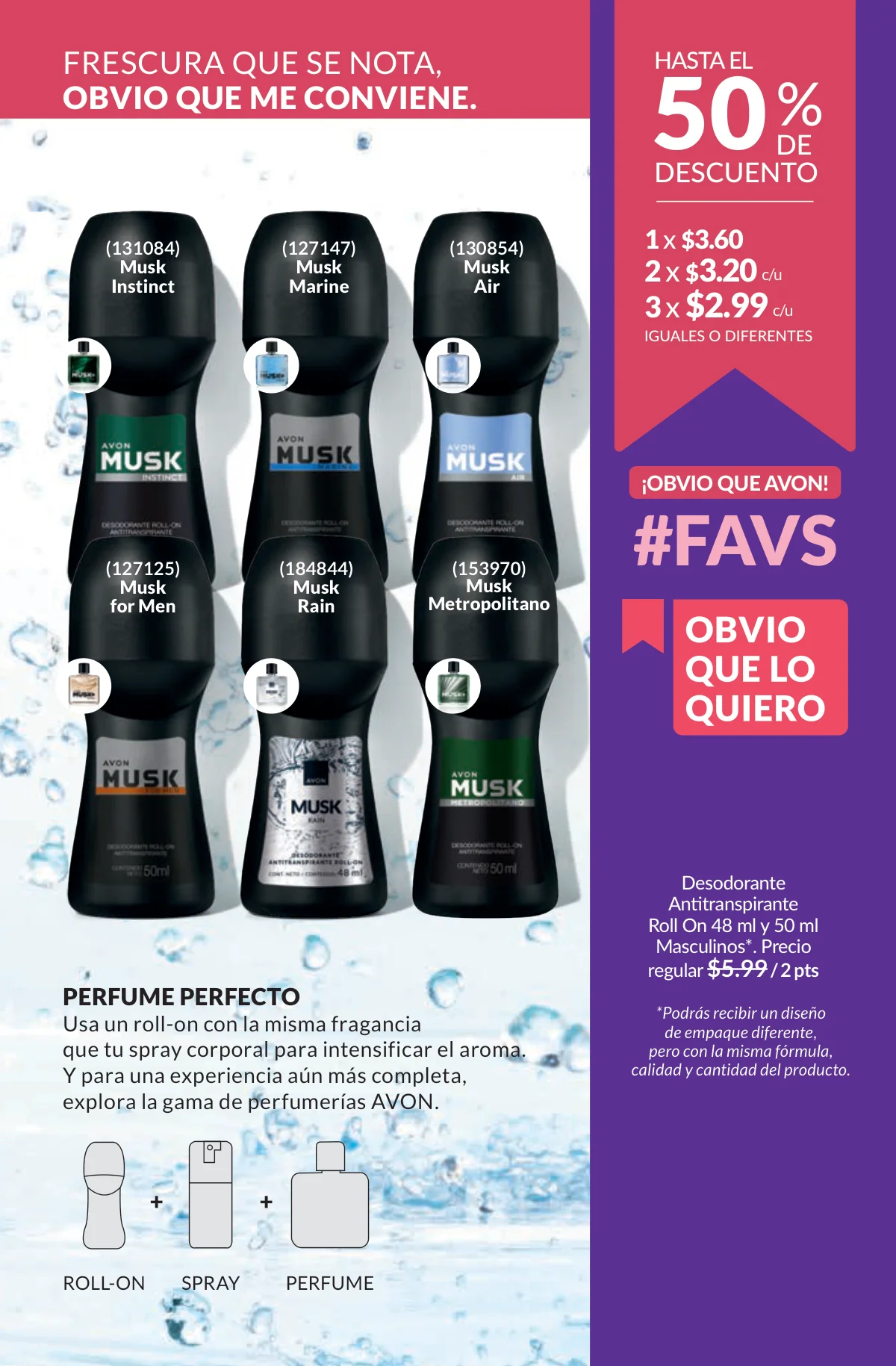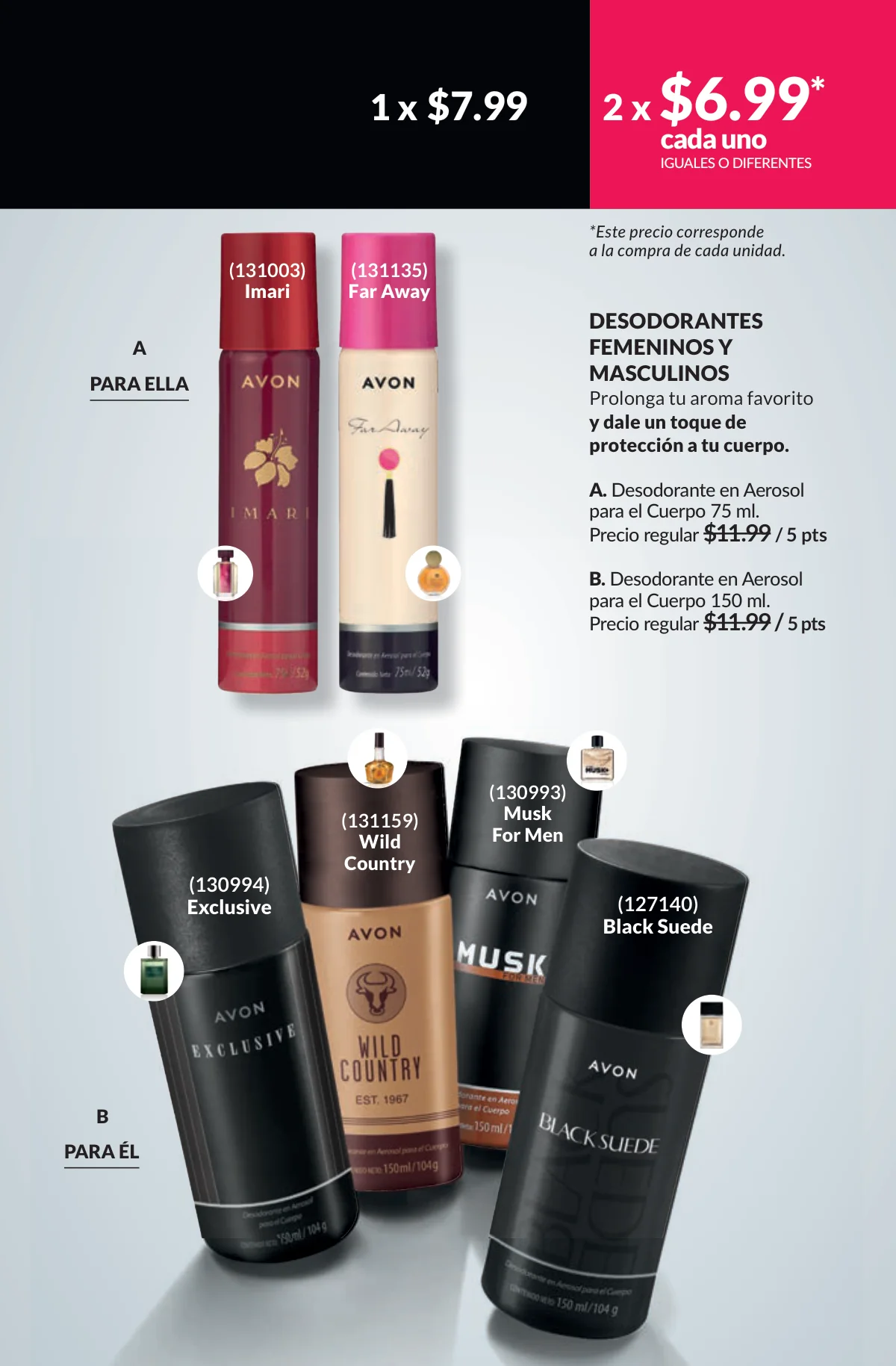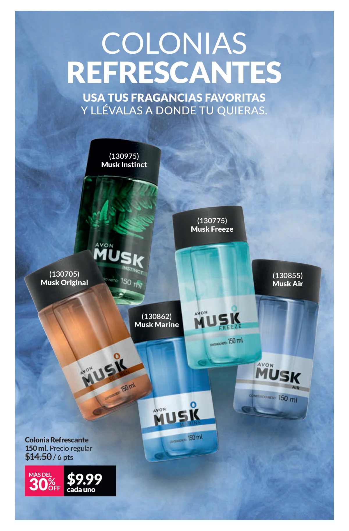 En este mes, las fragancias no quedan por fuera de las promociones de esta Avon campaña 1 2026. Hay muchas especiales para ellas/ellos: Fantasy (30%), Imari y Soft Musk, Far Away o las muy varoniles H o Musk, que las consigues con sus presentaciones de desodorantes y colonias.