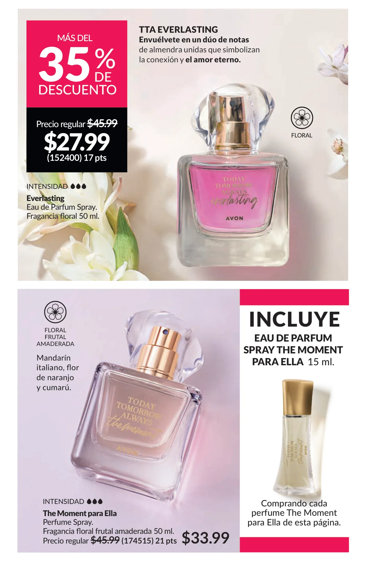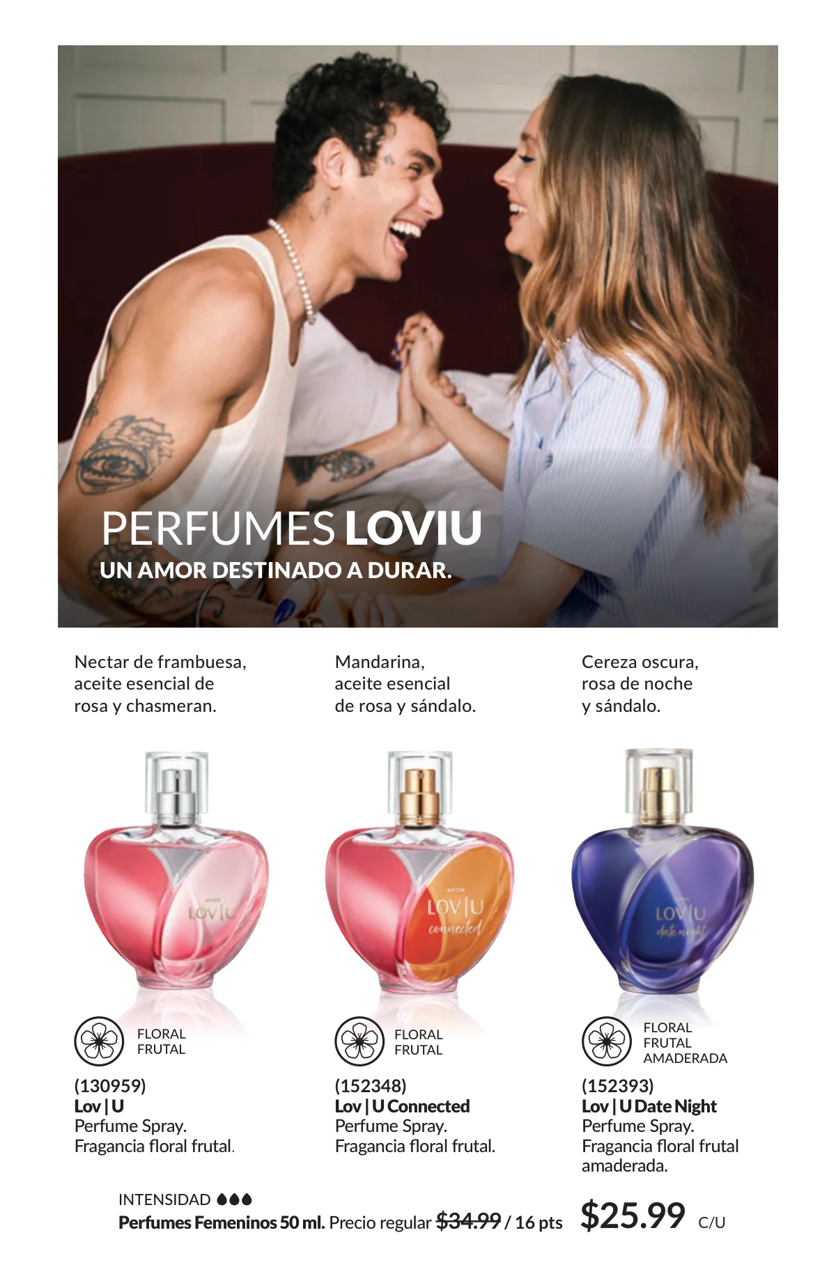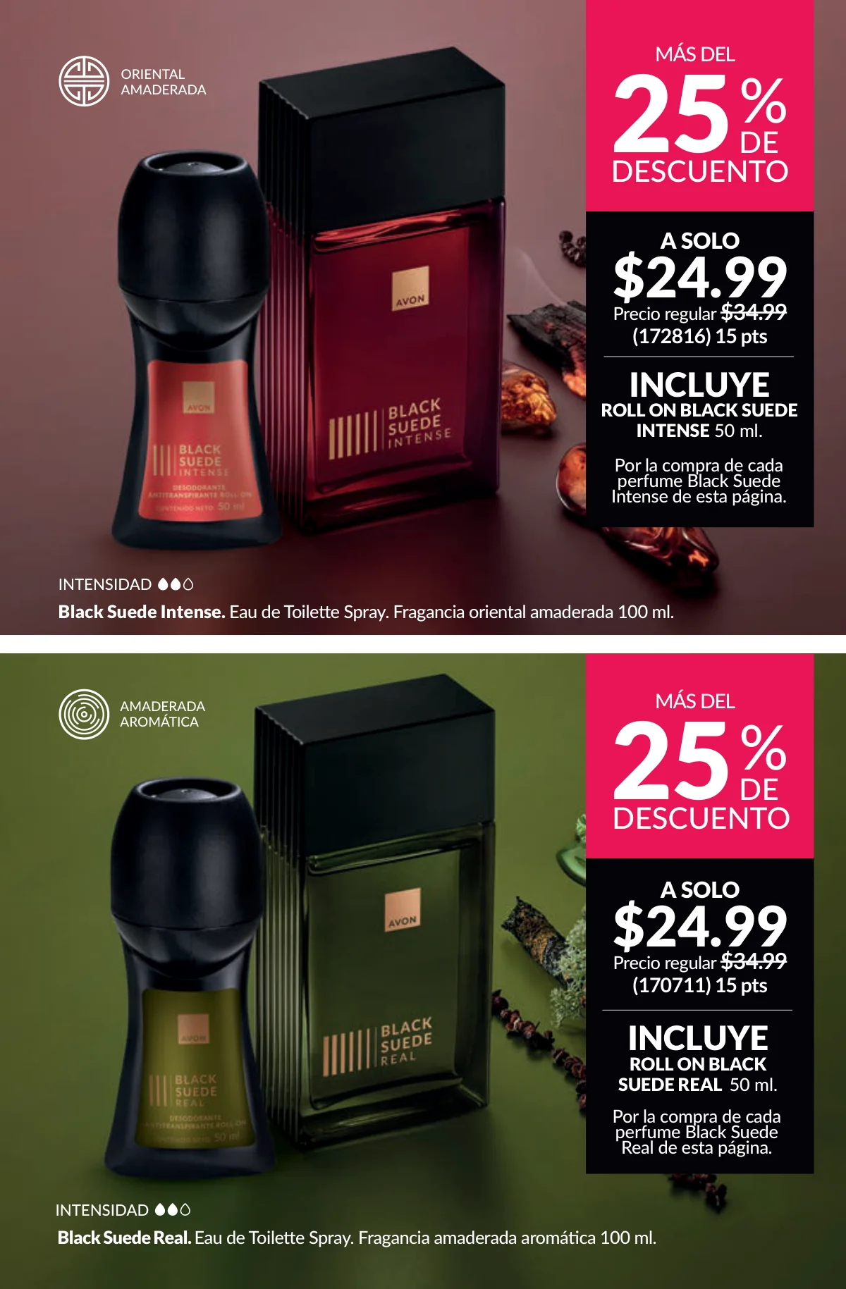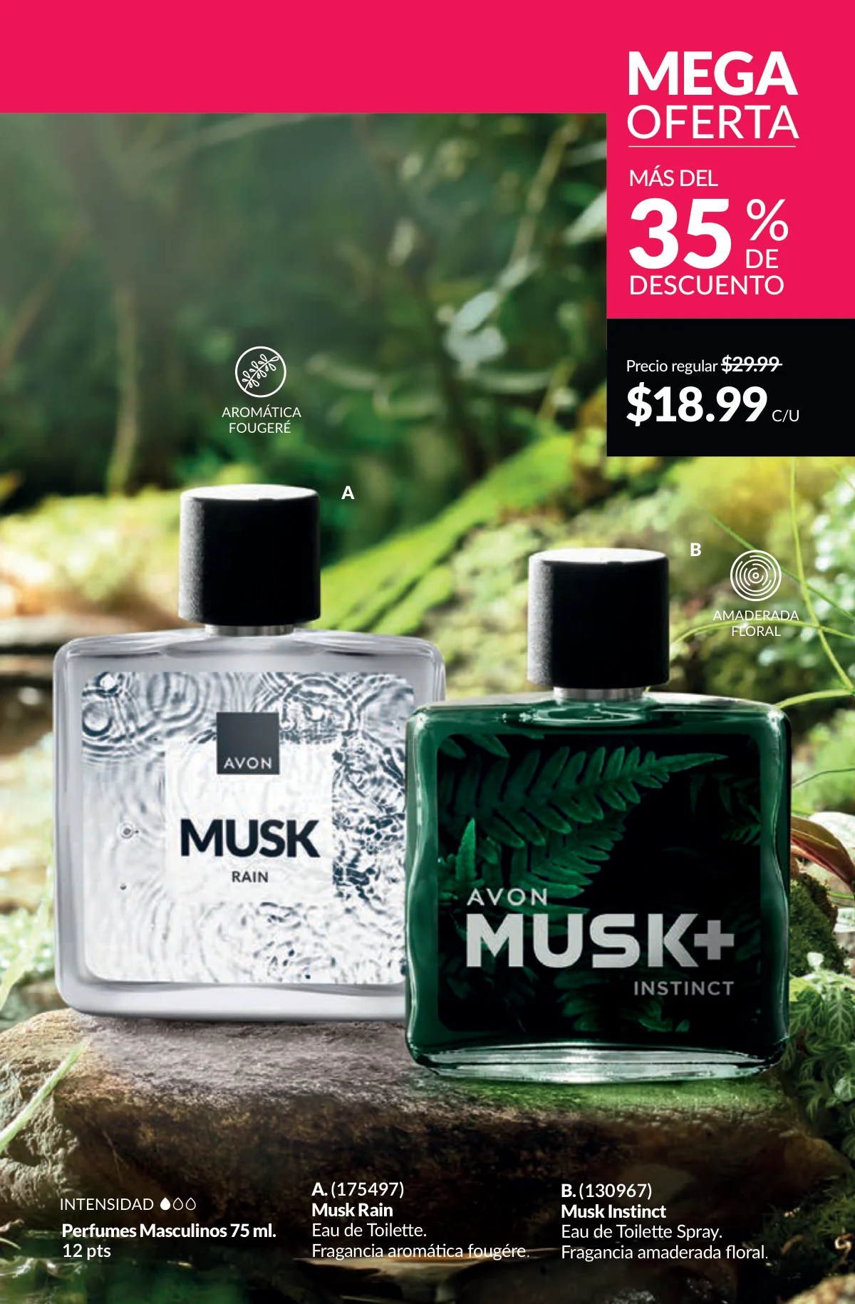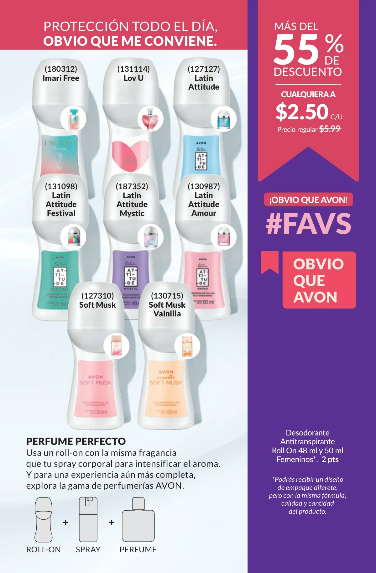 En este mes, las fragancias no quedan por fuera de las promociones de esta Avon campaña 1 2026. Hay muchas especiales para ellas/ellos: Fantasy (30%), Imari y Soft Musk, Far Away o las muy varoniles H o Musk, que las consigues con sus presentaciones de desodorantes y colonias.