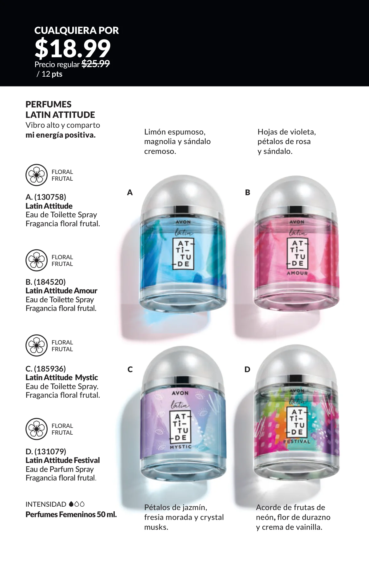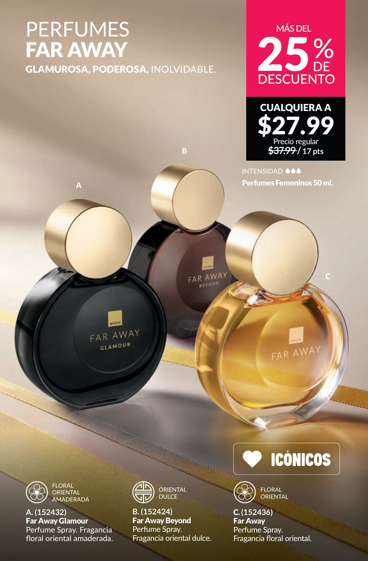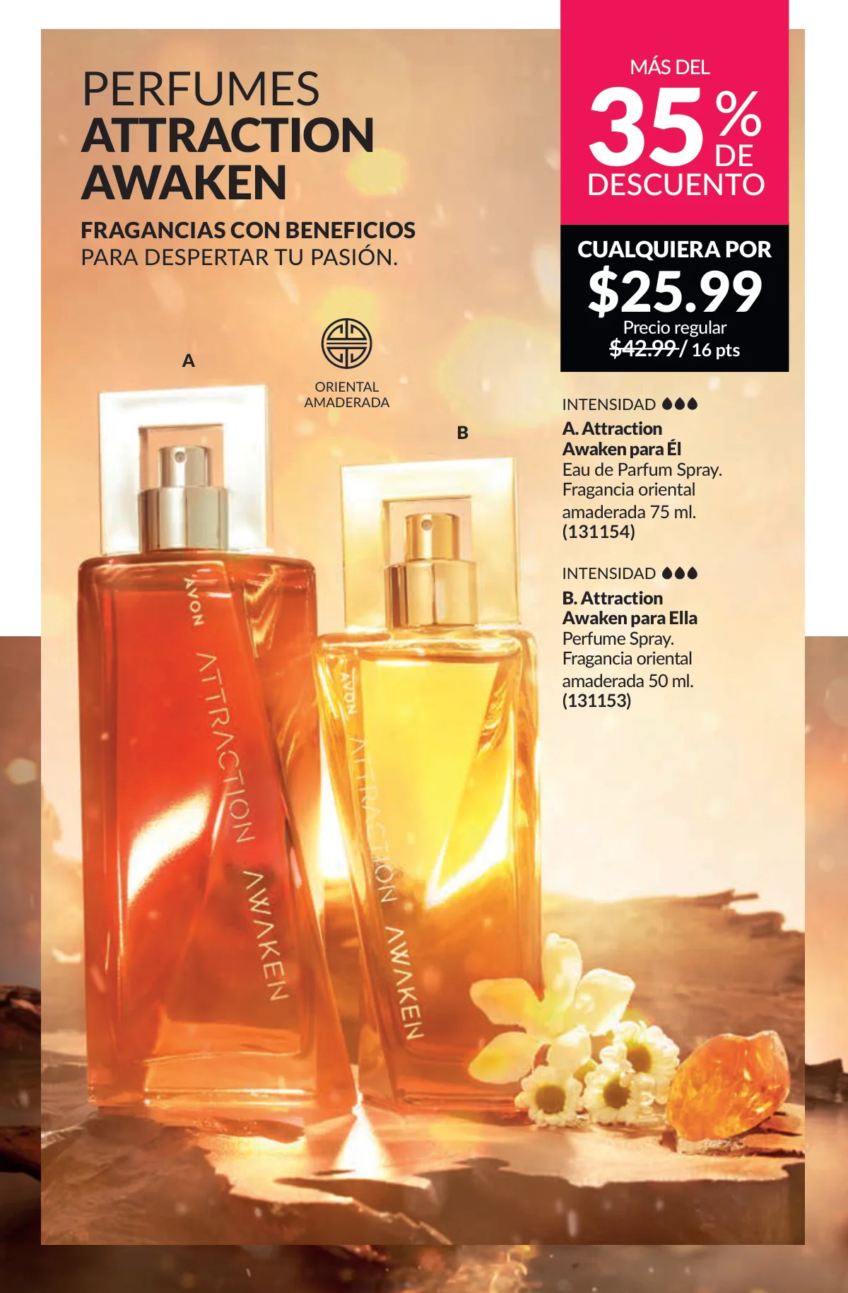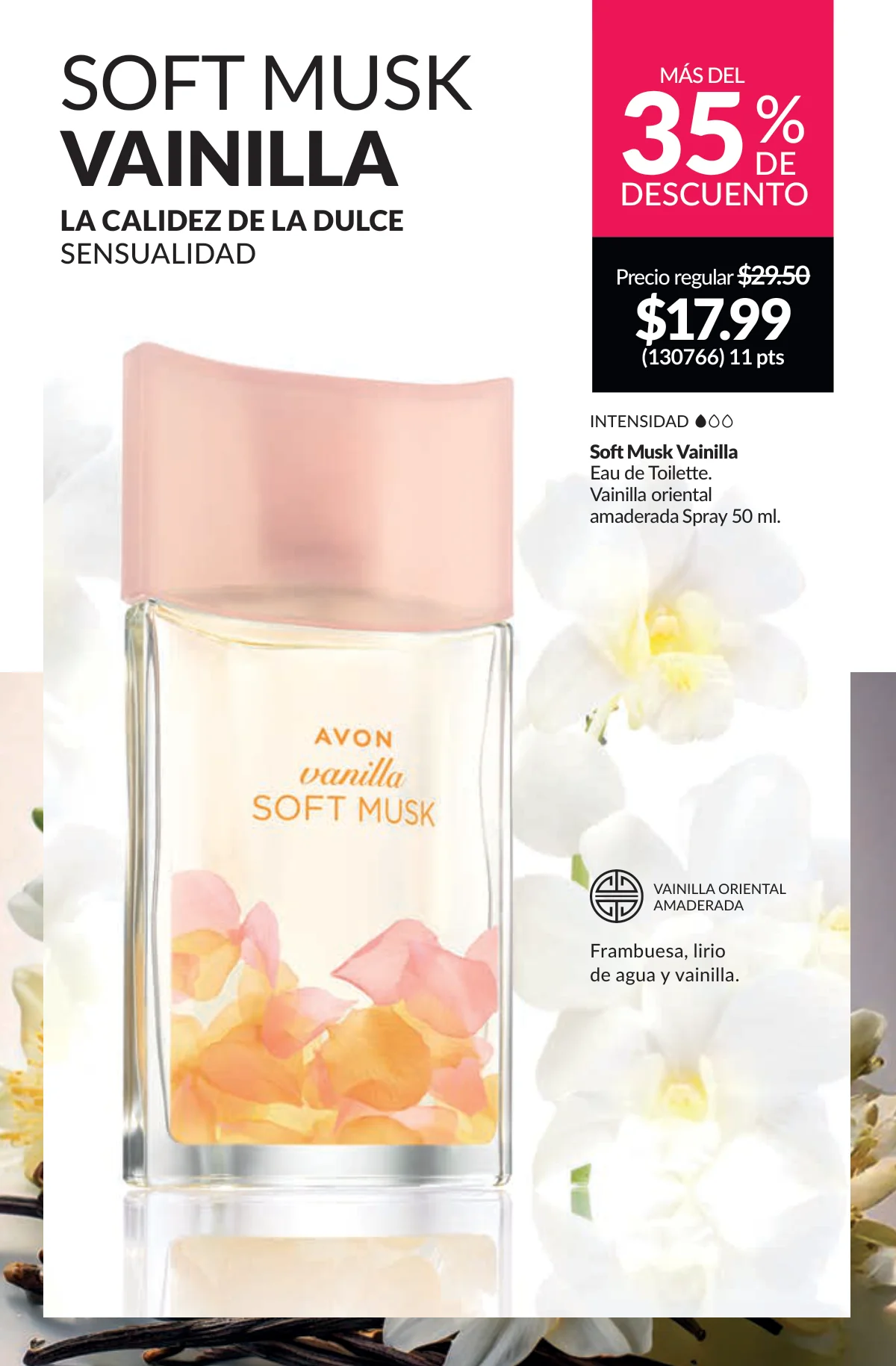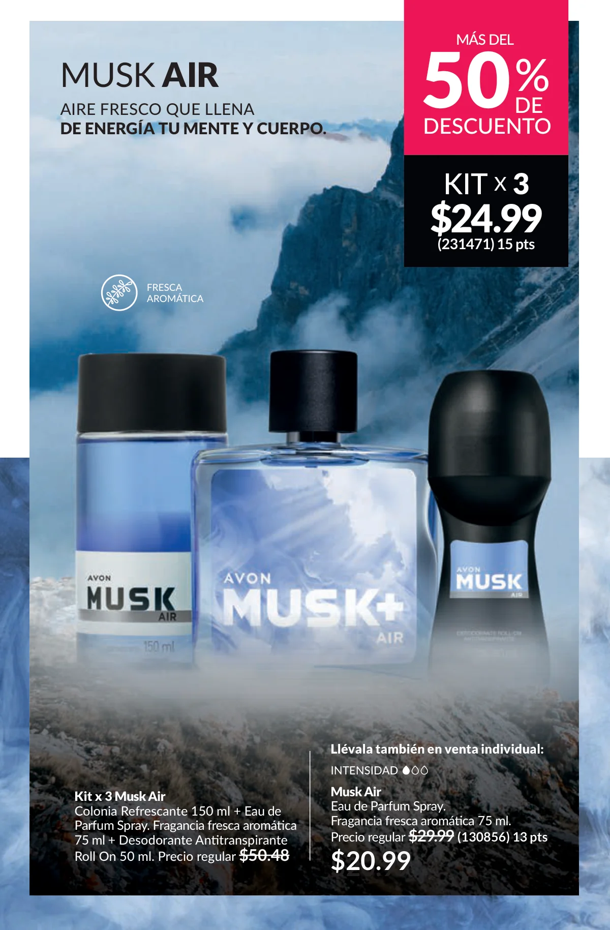 En este mes, las fragancias no quedan por fuera de las promociones de esta Avon campaña 1 2026. Hay muchas especiales para ellas/ellos: Fantasy (30%), Imari y Soft Musk, Far Away o las muy varoniles H o Musk, que las consigues con sus presentaciones de desodorantes y colonias.