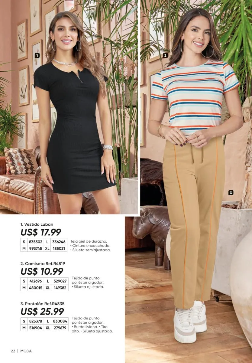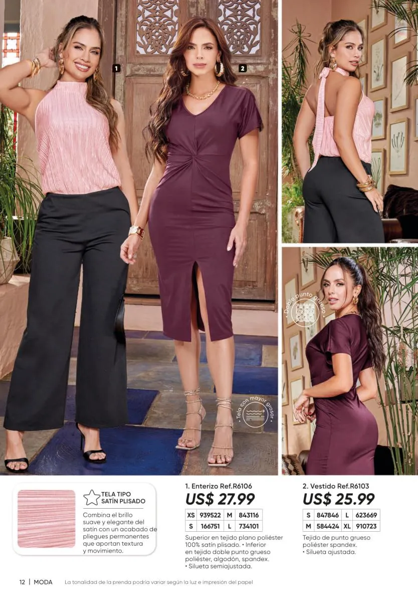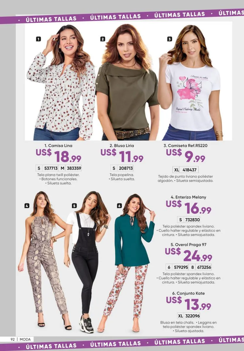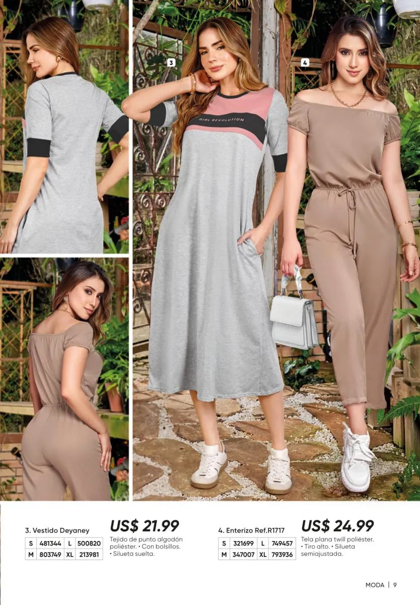 1. Estampados floreados: son una moda que siempre está presente y puedes conseguirla en vestidos como el Ligia de la página 7, en enterizos como el Marcela (pág. 11) o en una variedad de blusas.