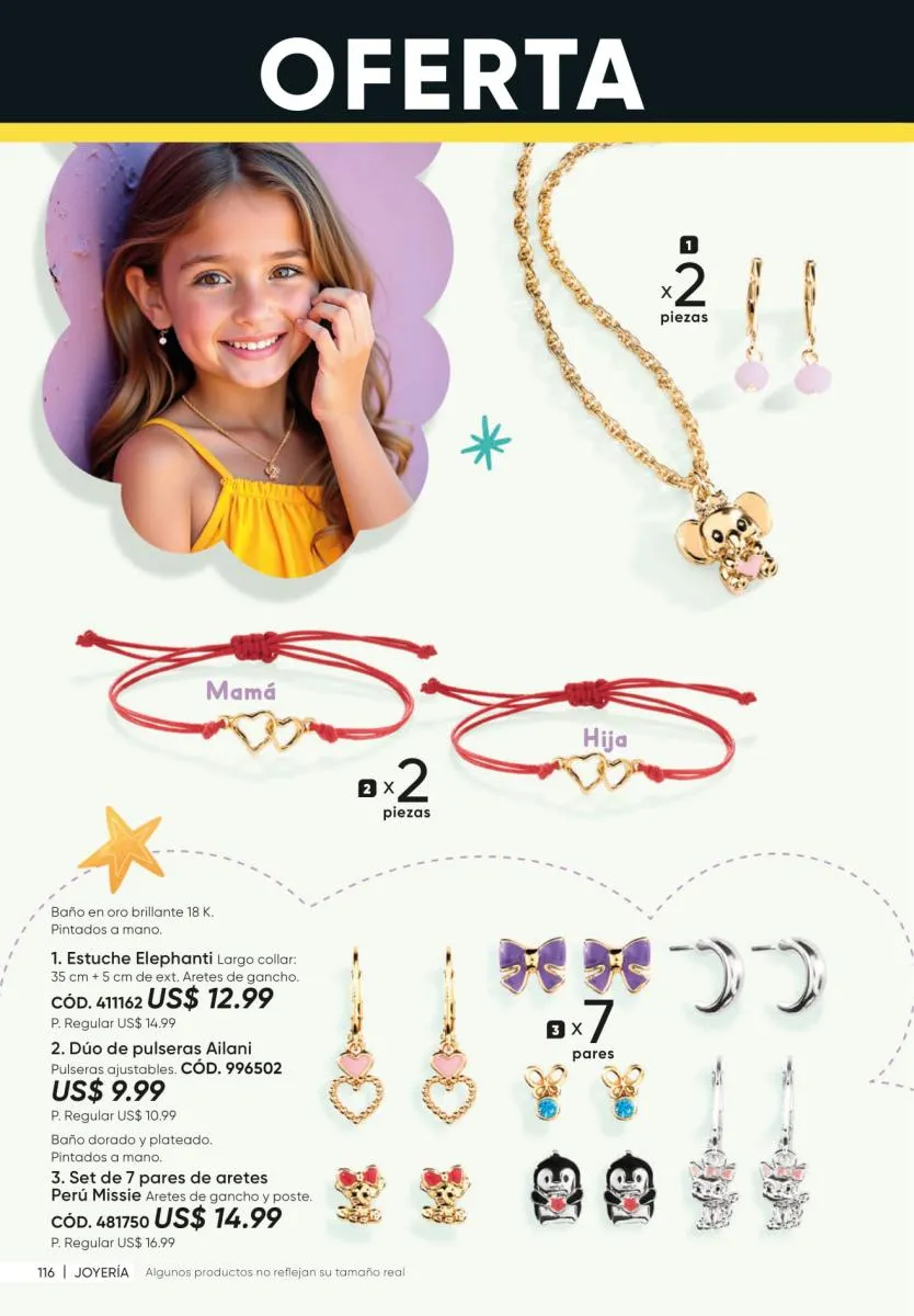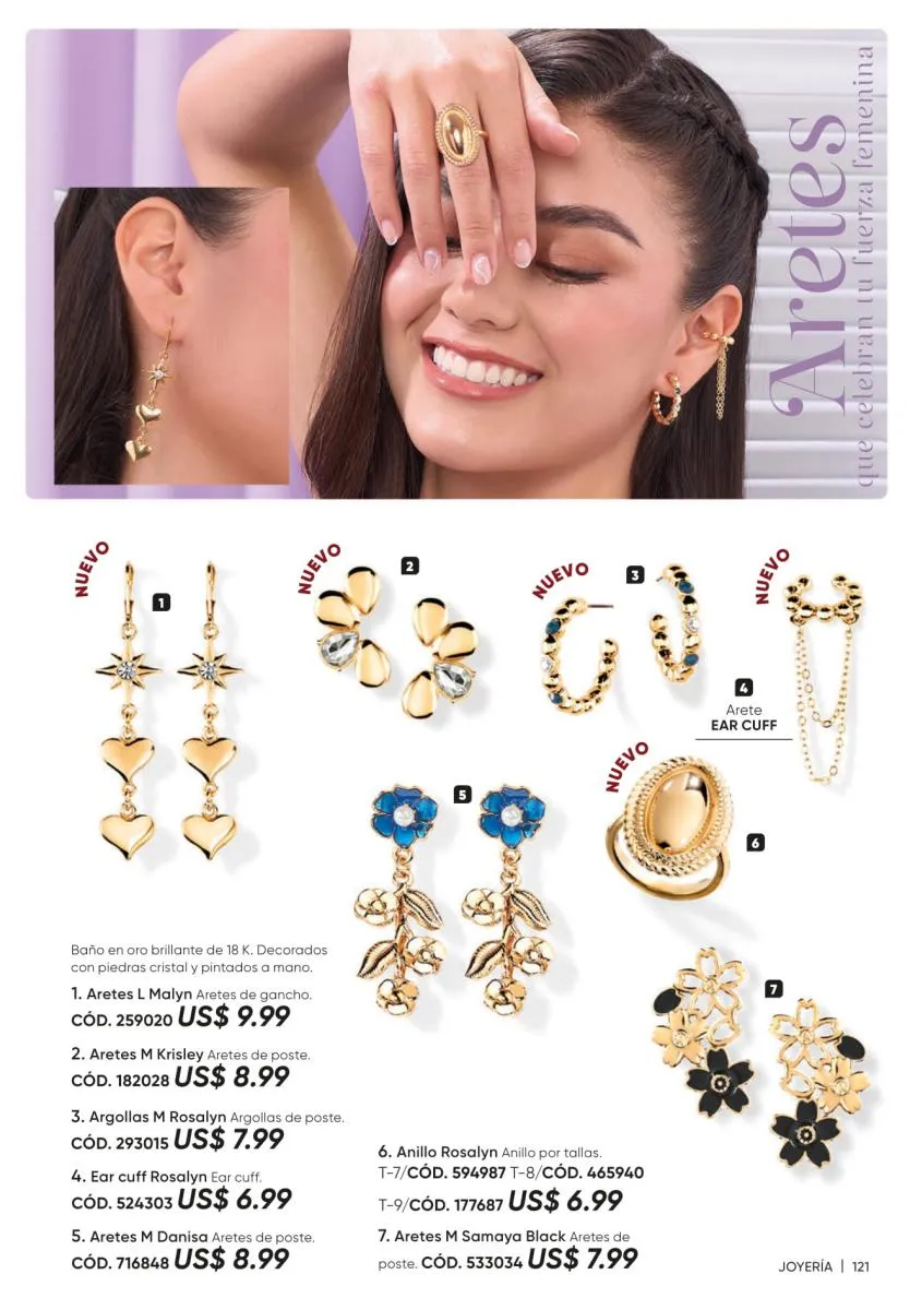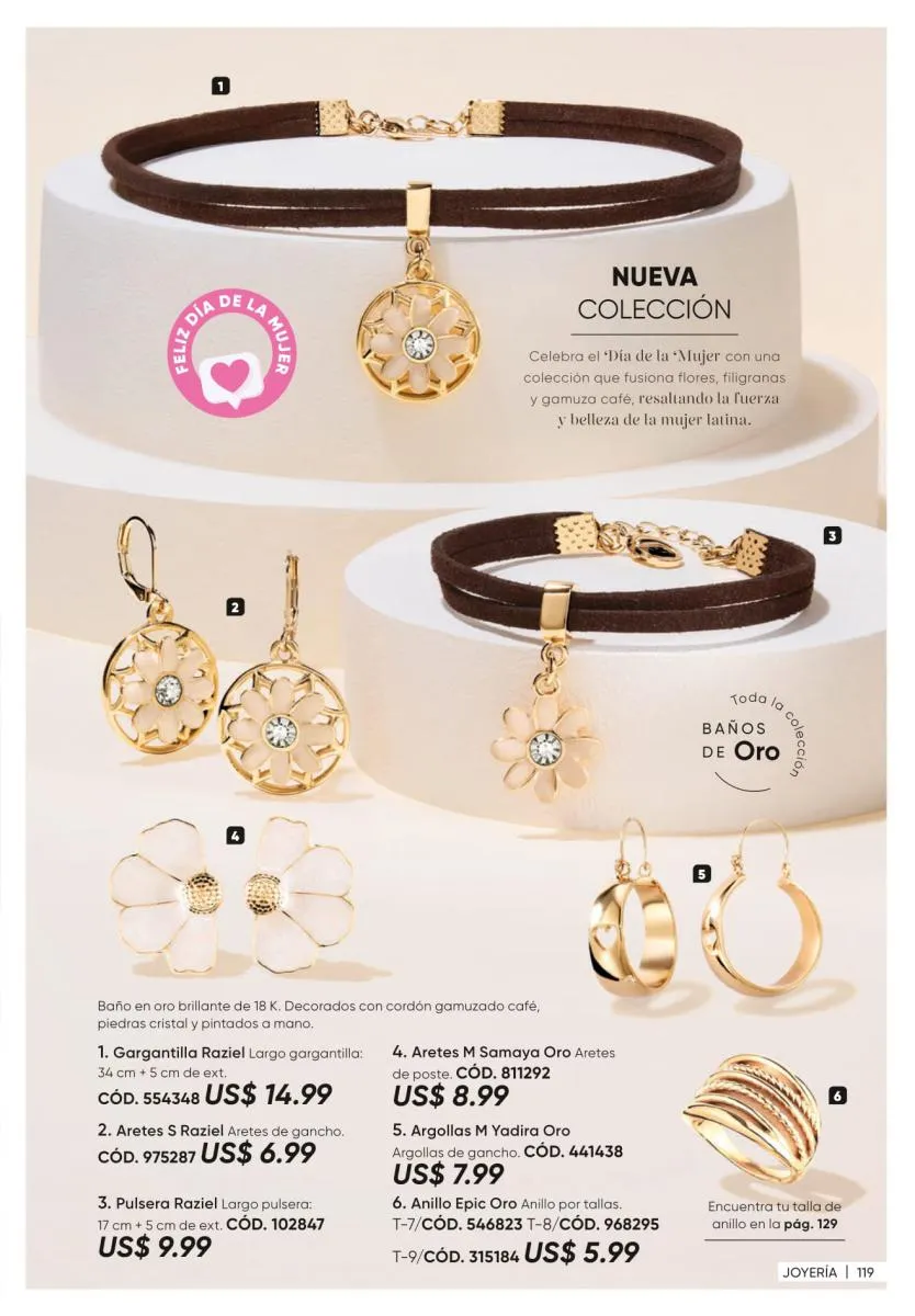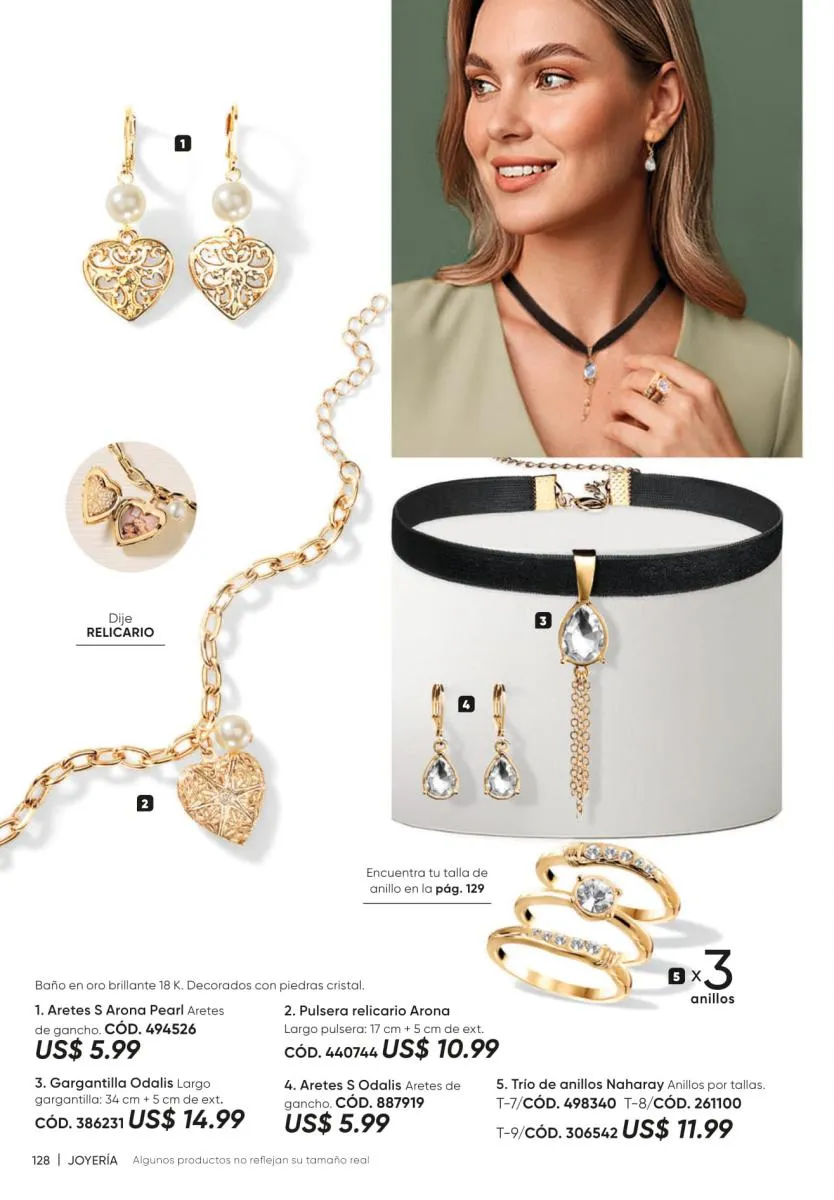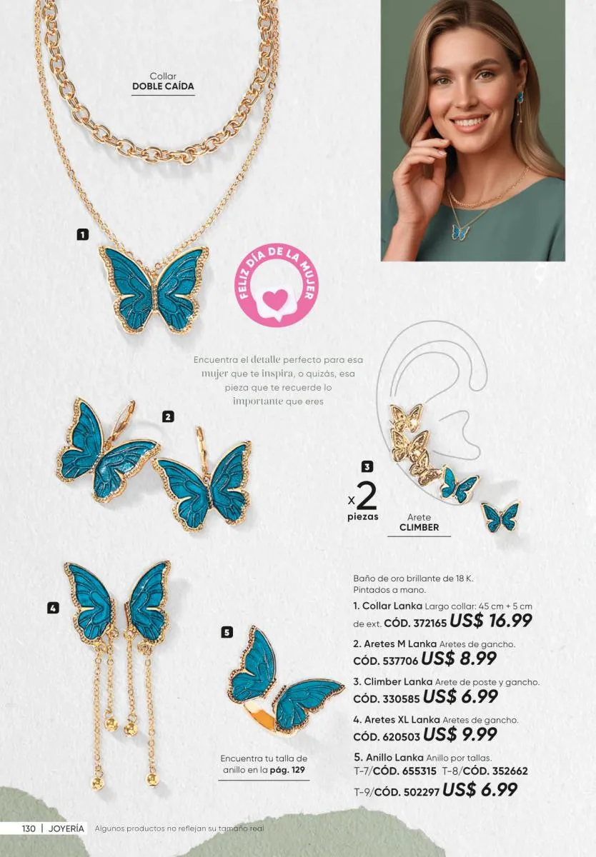 • La nueva colección de joyería Rosette Gold de collar, aretes y pulseras. Todos en tonos verdes con detalles de hoja. (Pág. 125).