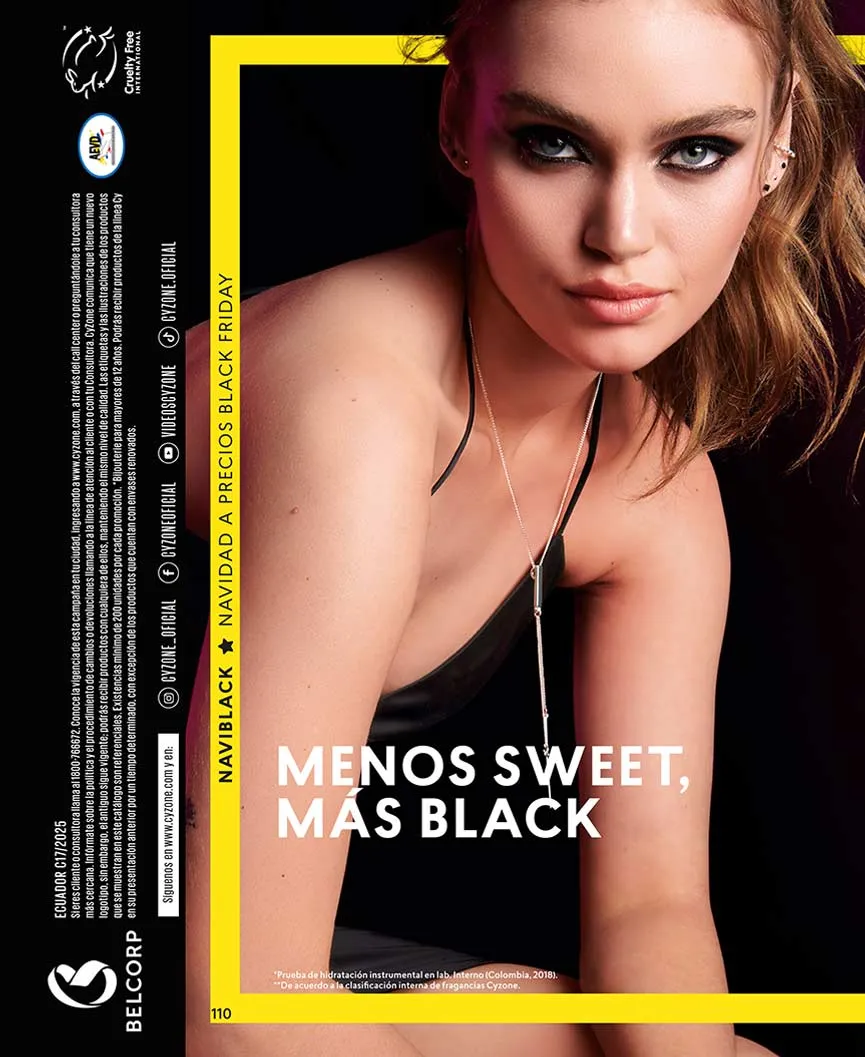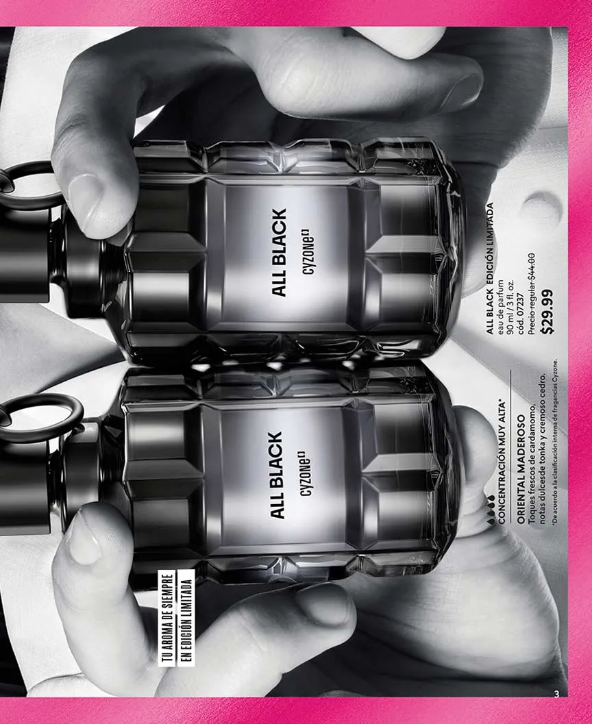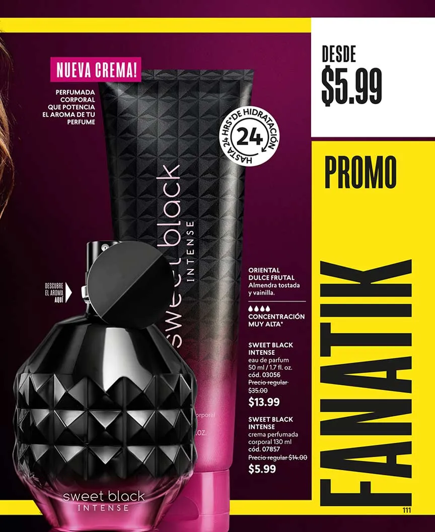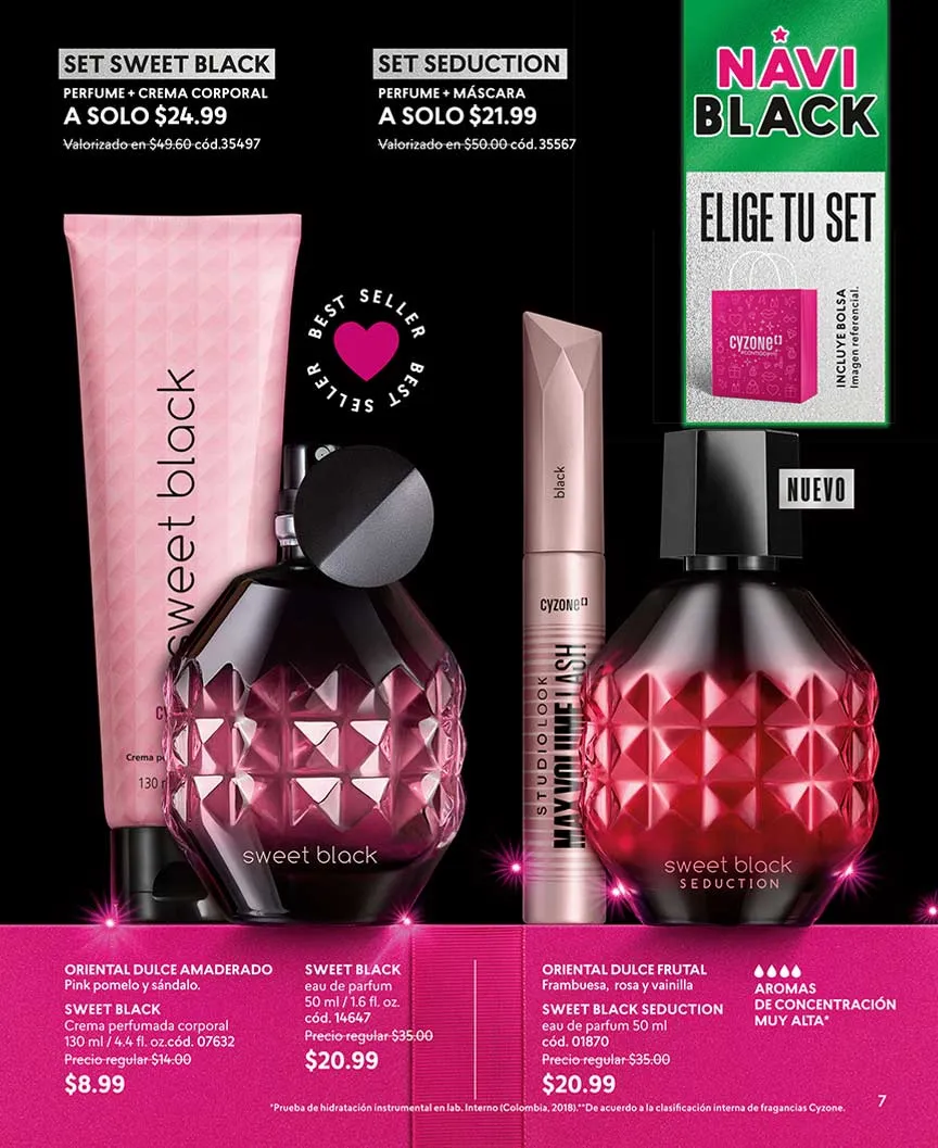 - Siéntete sensual y capaz de todo con el increíble Sweet Black Eau de Parfum que desborda un aroma oriental dulce y sensuales toques de pink pomelo con extractos de sándalo con una muy alta concentración. Pag 4.