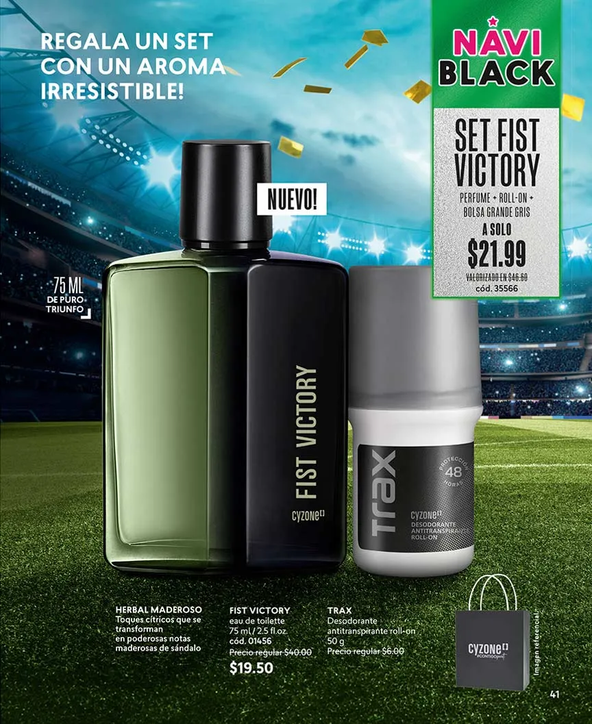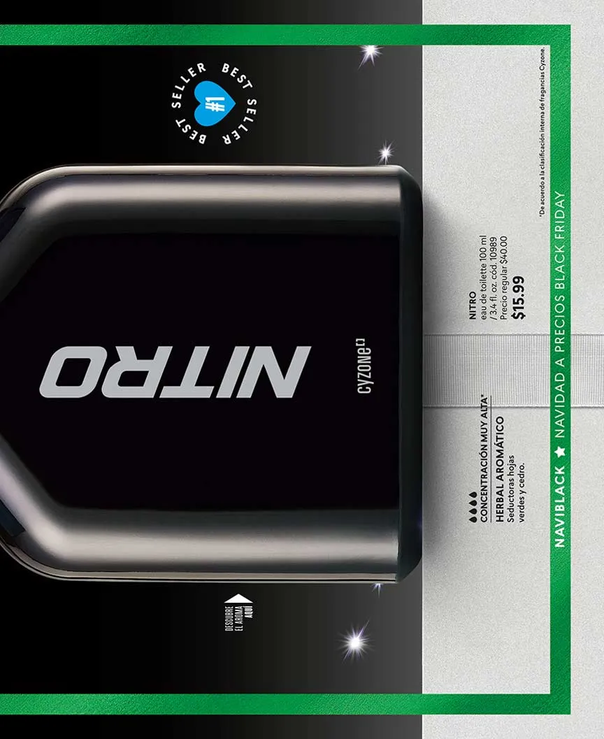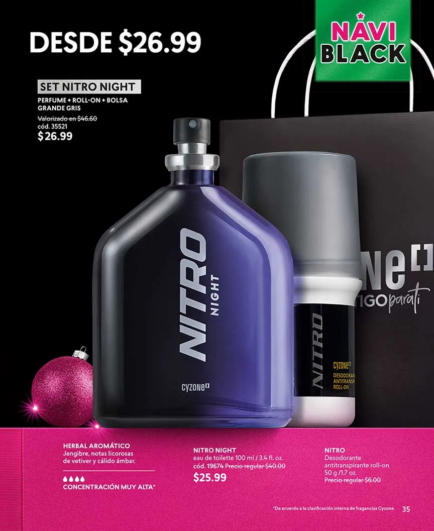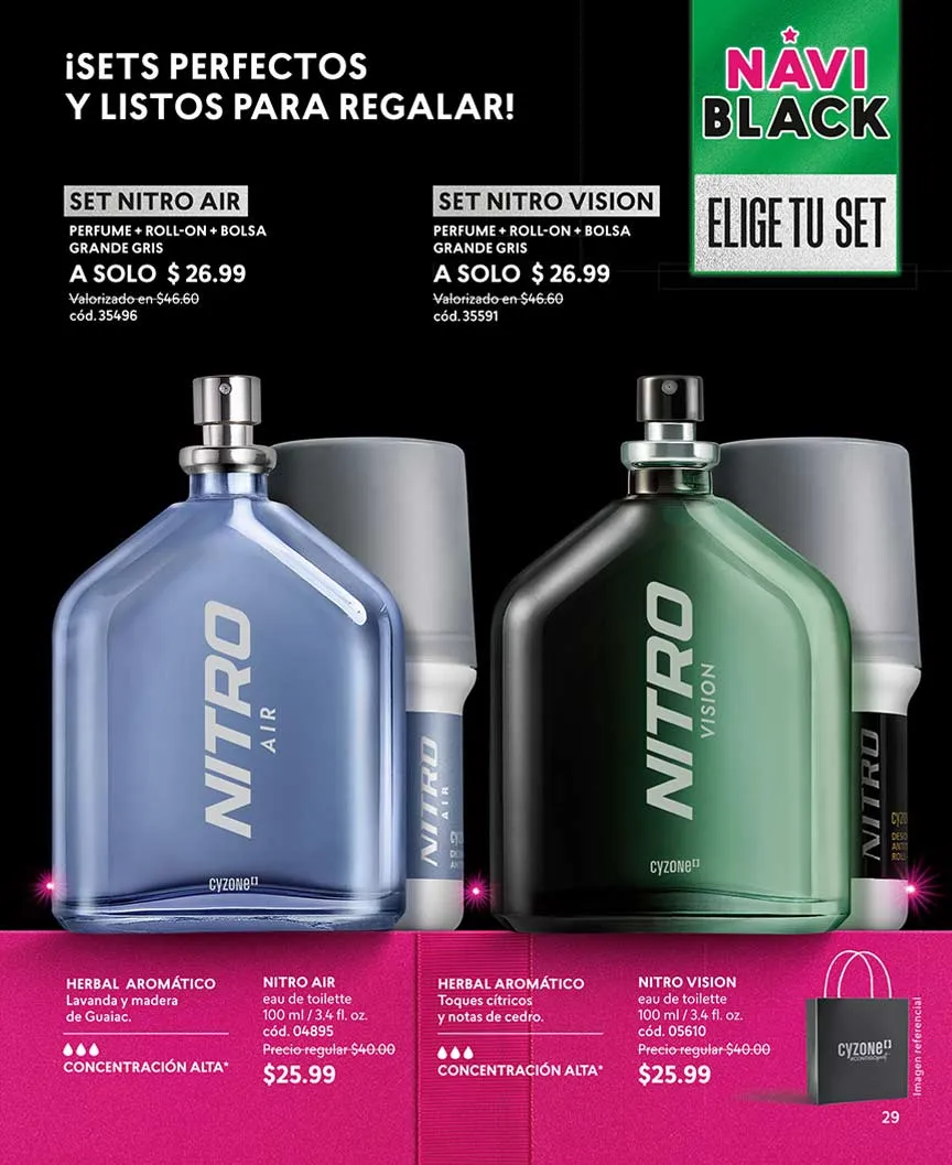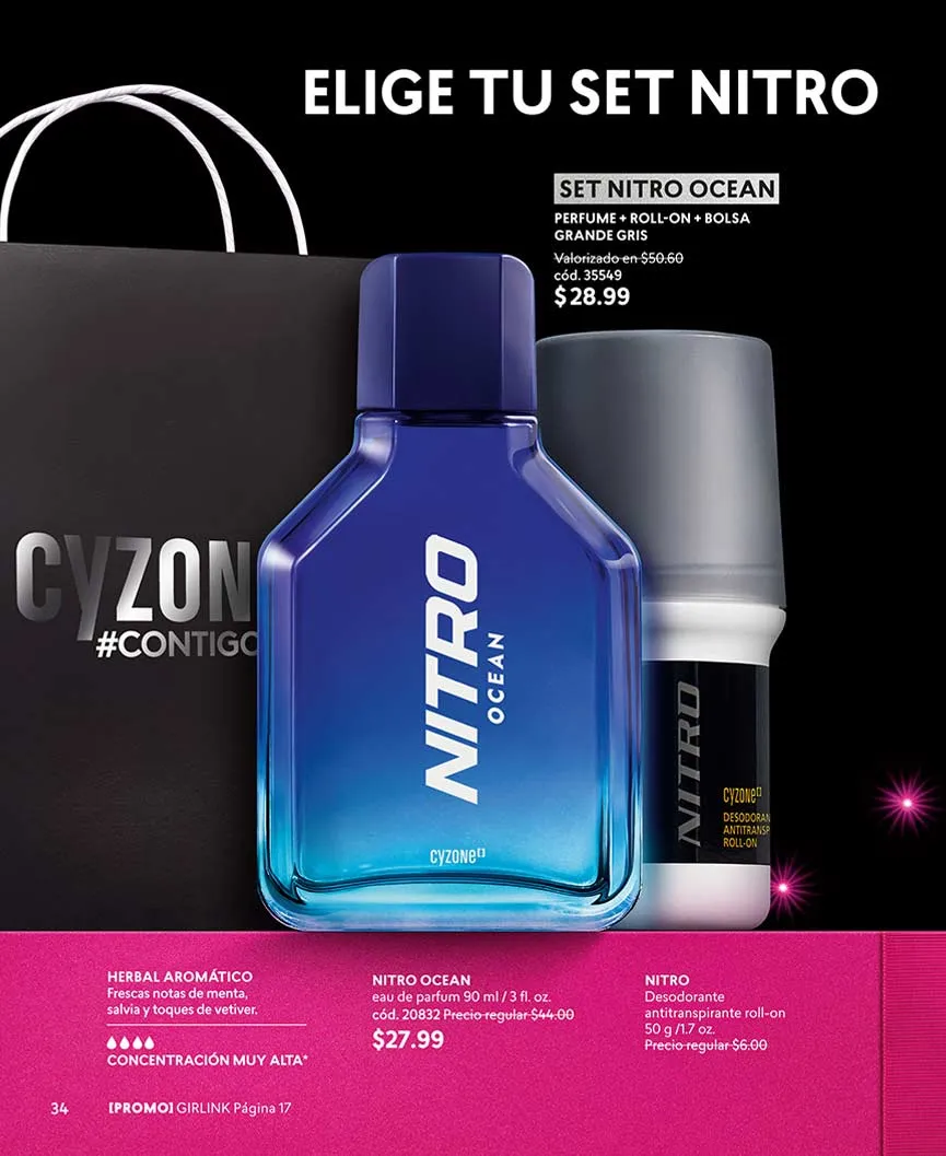 - Tenemos un set especial y exclusivo para que él se sienta imponente. Set Nitro Ultimate: Fragancia Nitro Ultimate Eau de Parfum de alta concentración + Trax en su presentación So close como una Colonia desodorante + Bolsa grande gris ideal para obsequiar. Pag 20.