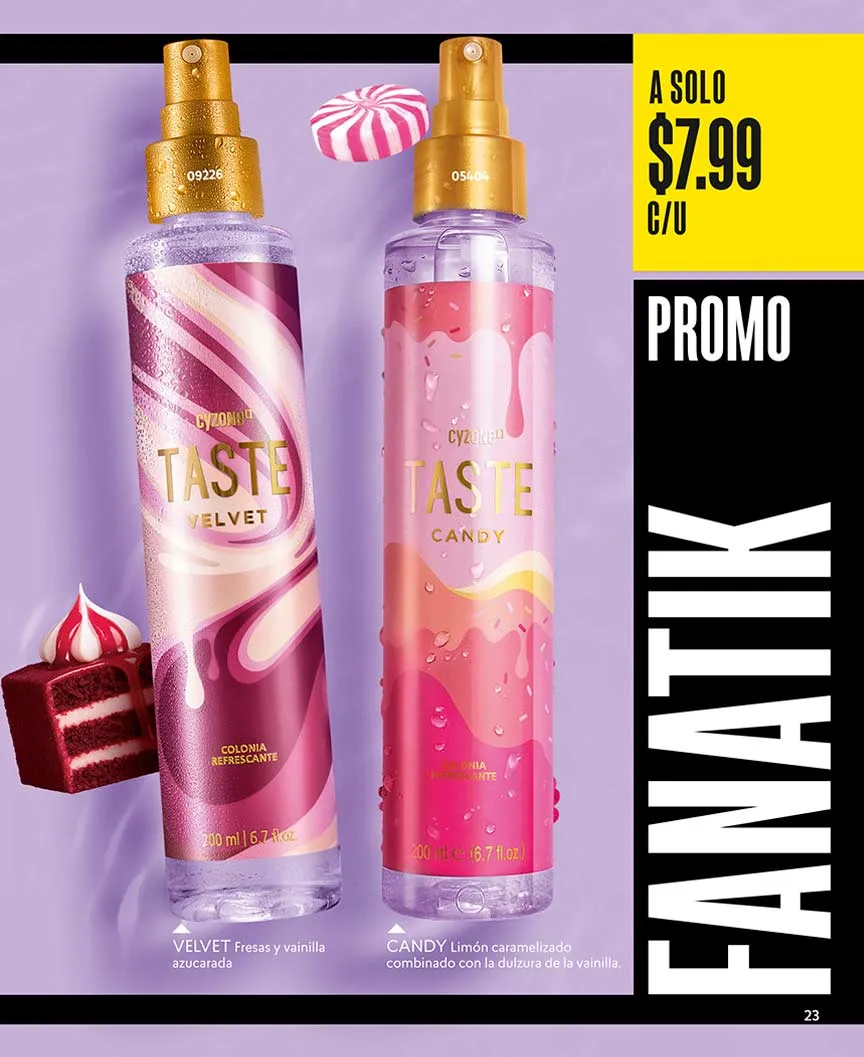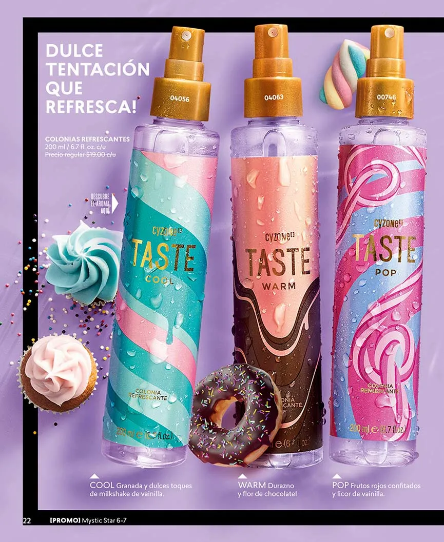 - Si los aromas dulces son tus preferidos; las fragancias concentradas en las Colonias refrescantes de la línea Taste serán tu adicción. Las podrás encontrar en su presentación: Pop/ Cream/ Snake/ Cool/ Warm