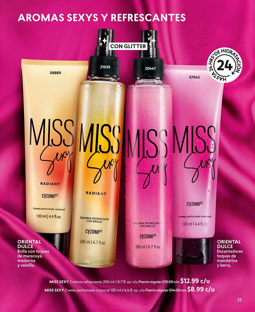 - Libera tu lado seductor y glamuroso con las colonias refrescantes Miss Sexy, esencias florales con Glitters para darle un toque especial y atractivo a tu piel. Disponible en sus presentaciones: