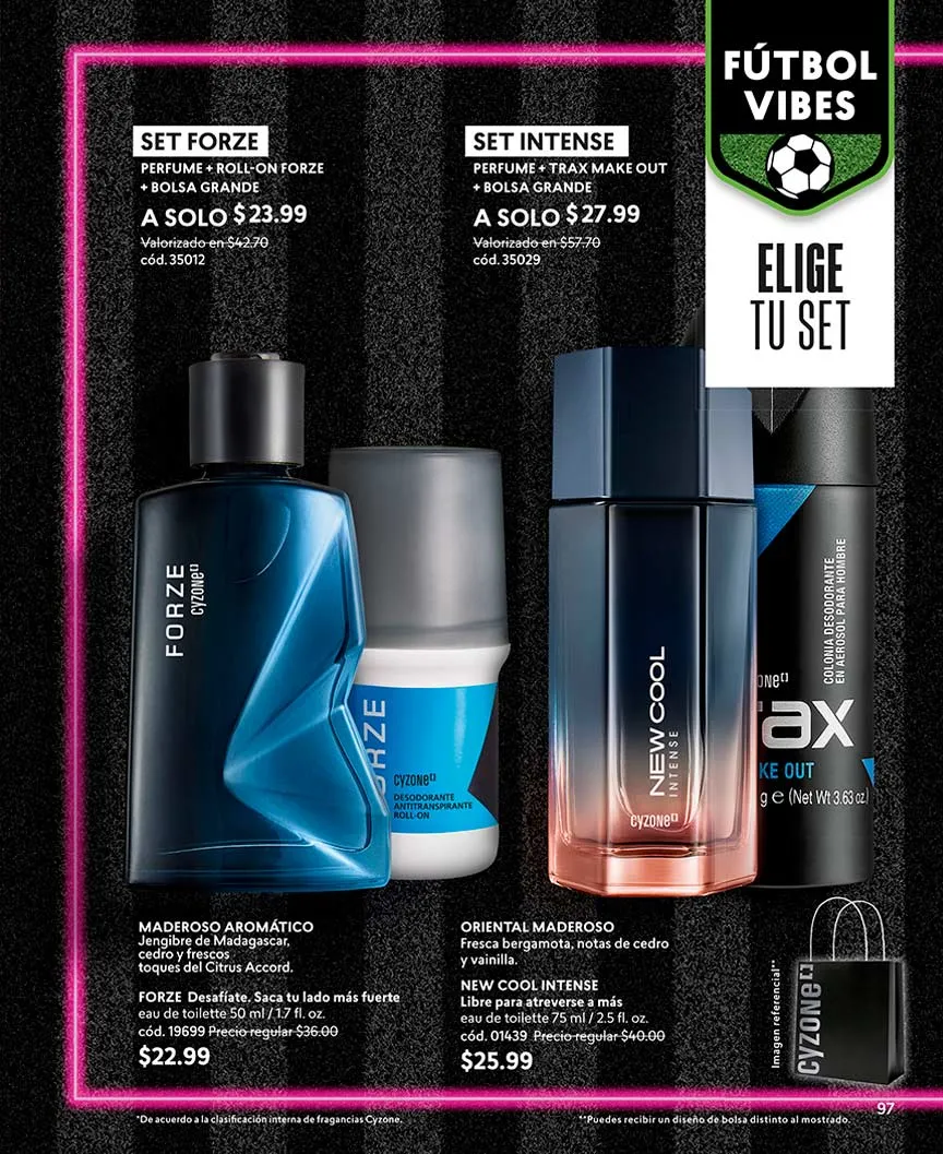 Lleva la frescura contigo a cualquier lugar con las colonias y lociones perfumadas disponibles en el catálogo Cyzone campaña 9 2026. Fragancias ligeras y suaves que crean una explosión de aromas en cada aplicación.