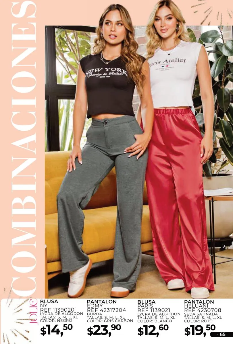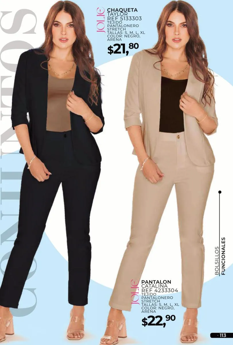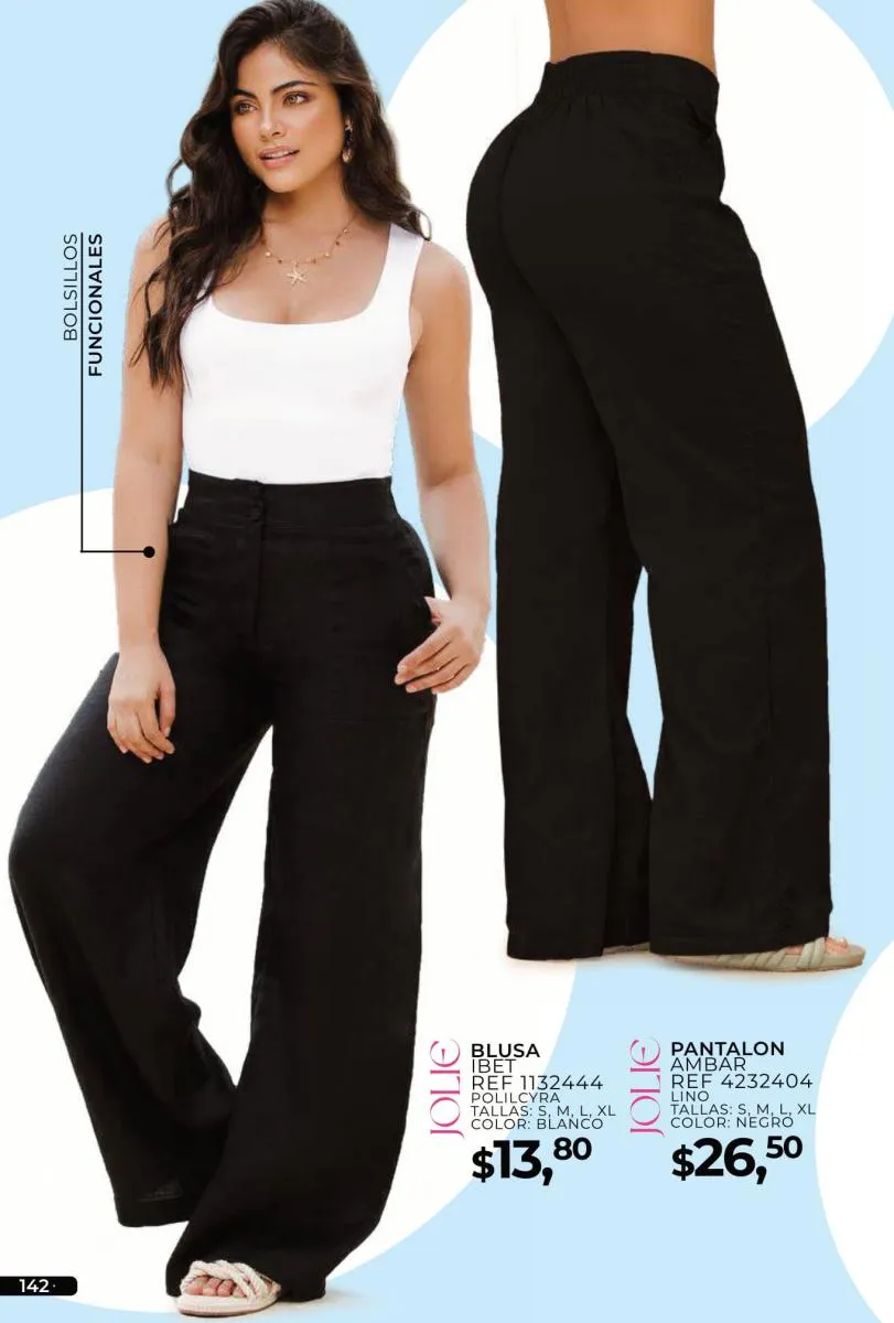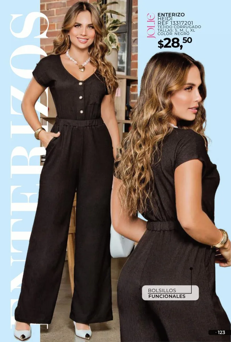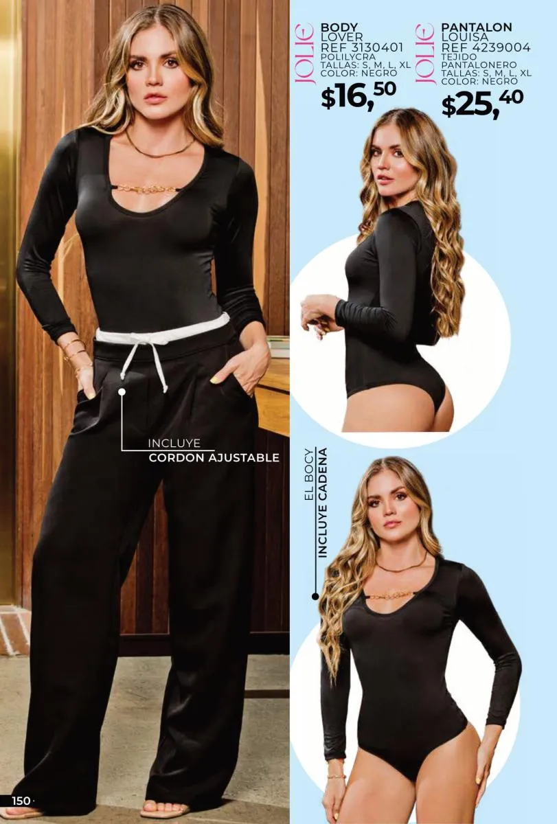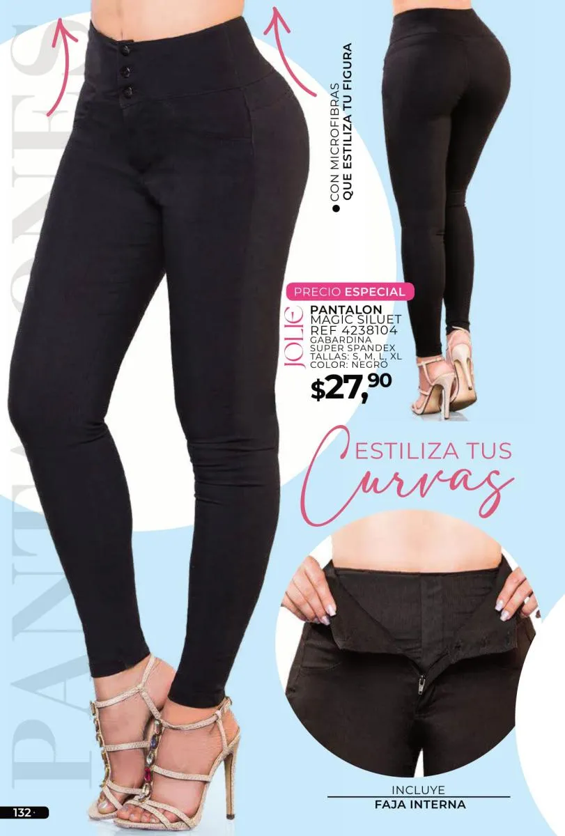 - Para atraer todas las miradas en este mes de aniversario Jolie, el color negro es ideal para ello. Búscalo en un enterizo “Saida” de lycra texturizada y tull (pág. 10) o un pantalón “Anny” en gabardina súper spandex (pág. 13).