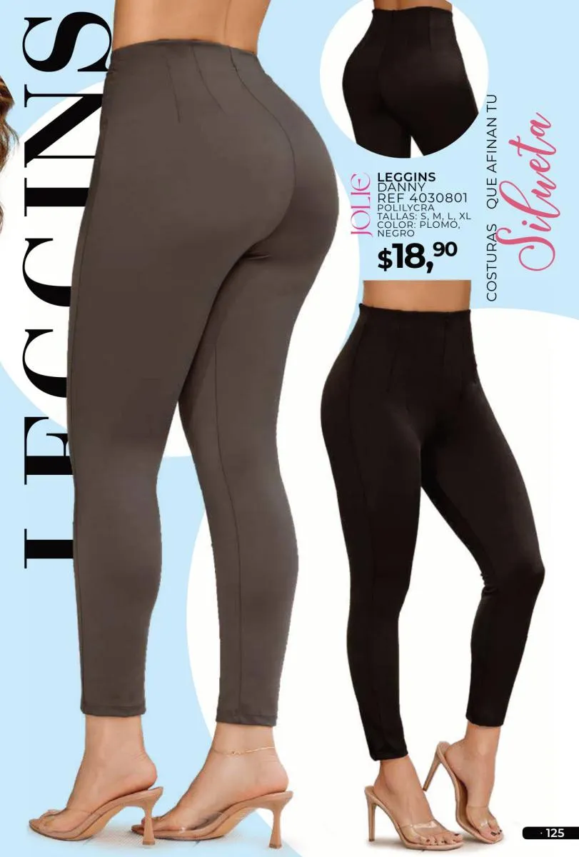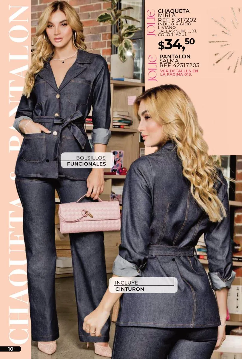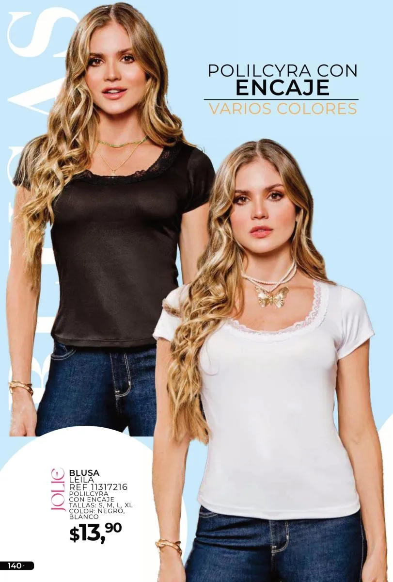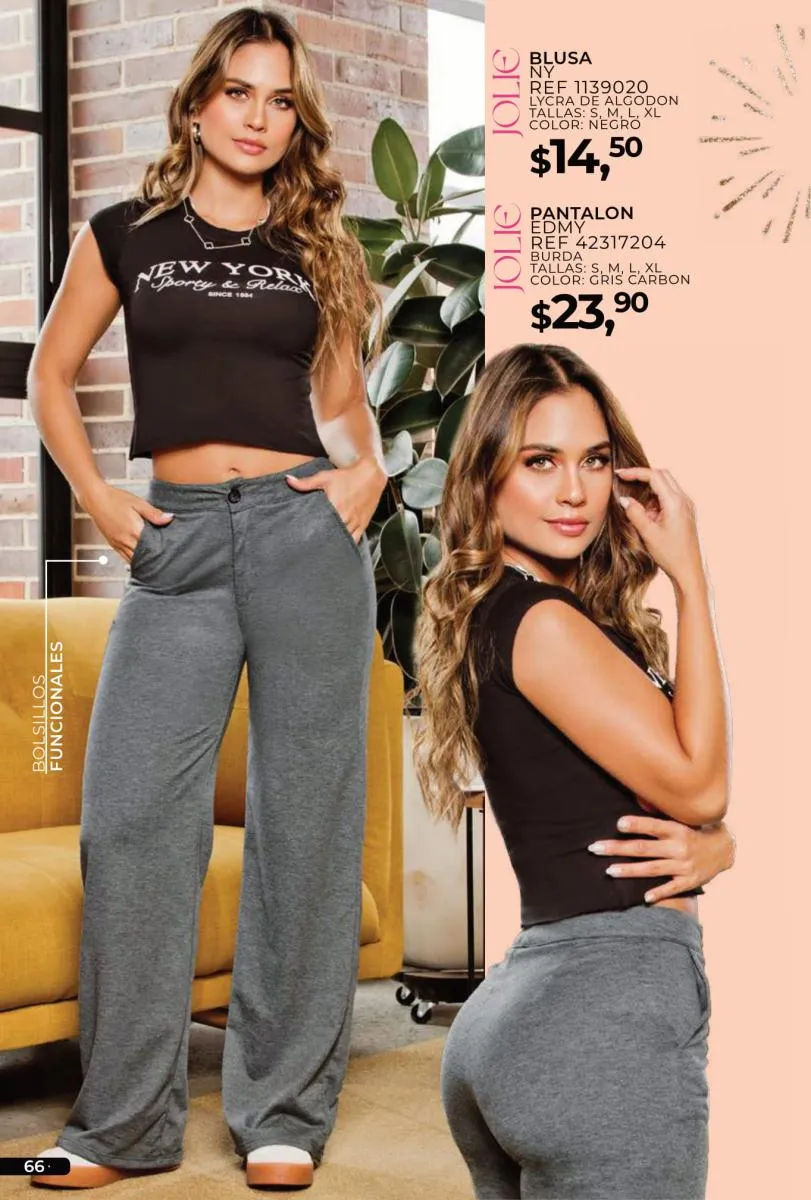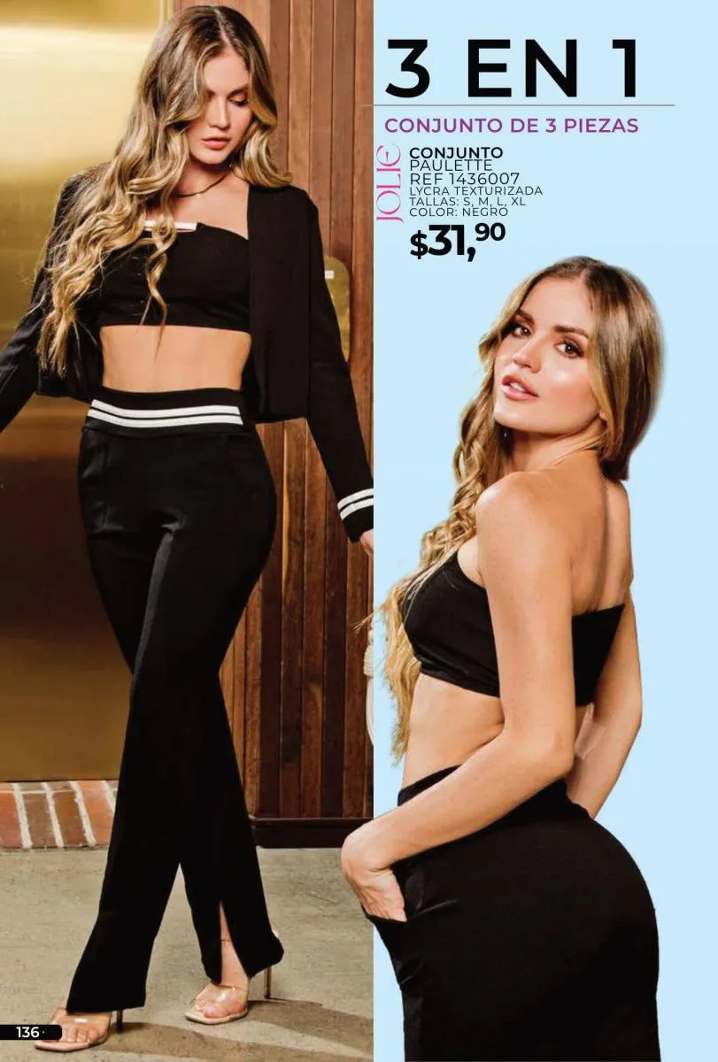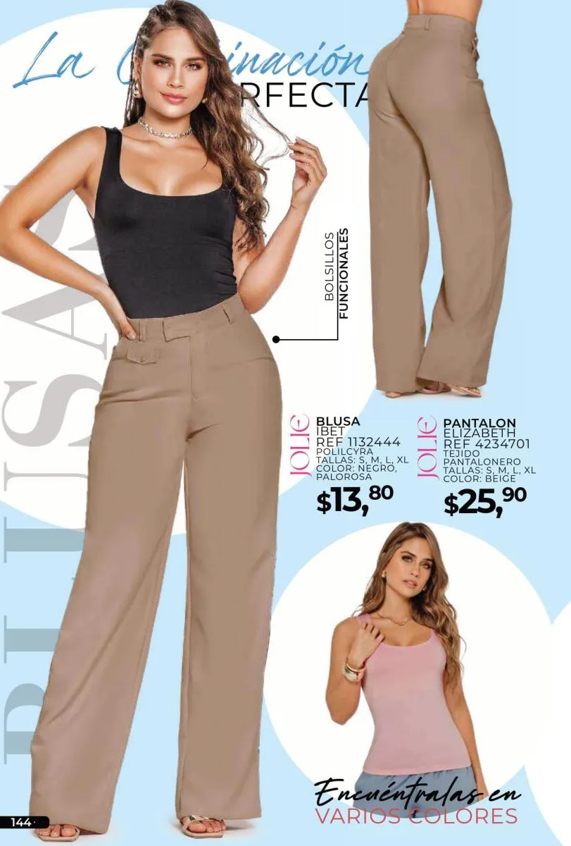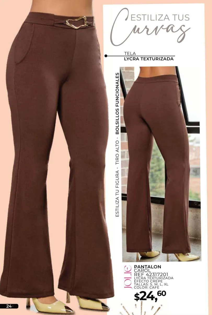 - Para atraer todas las miradas en este mes de aniversario Jolie, el color negro es ideal para ello. Búscalo en un enterizo “Saida” de lycra texturizada y tull (pág. 10) o un pantalón “Anny” en gabardina súper spandex (pág. 13).