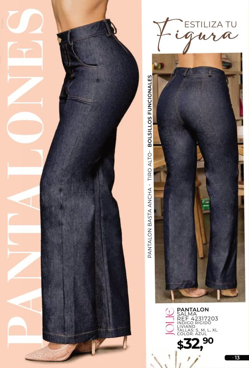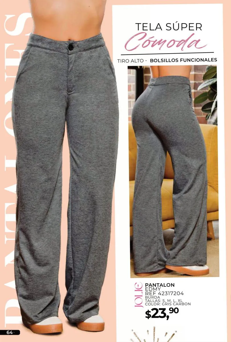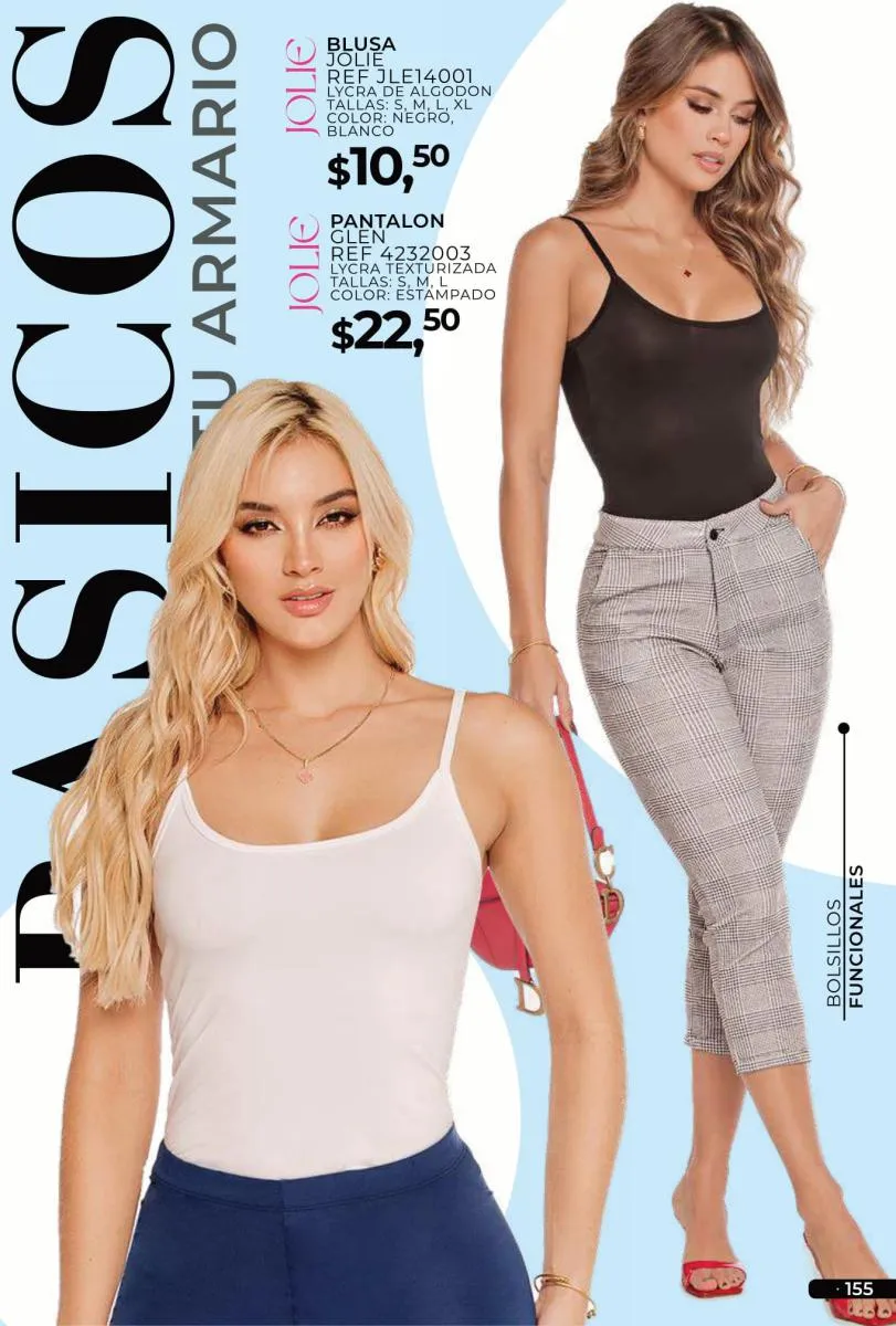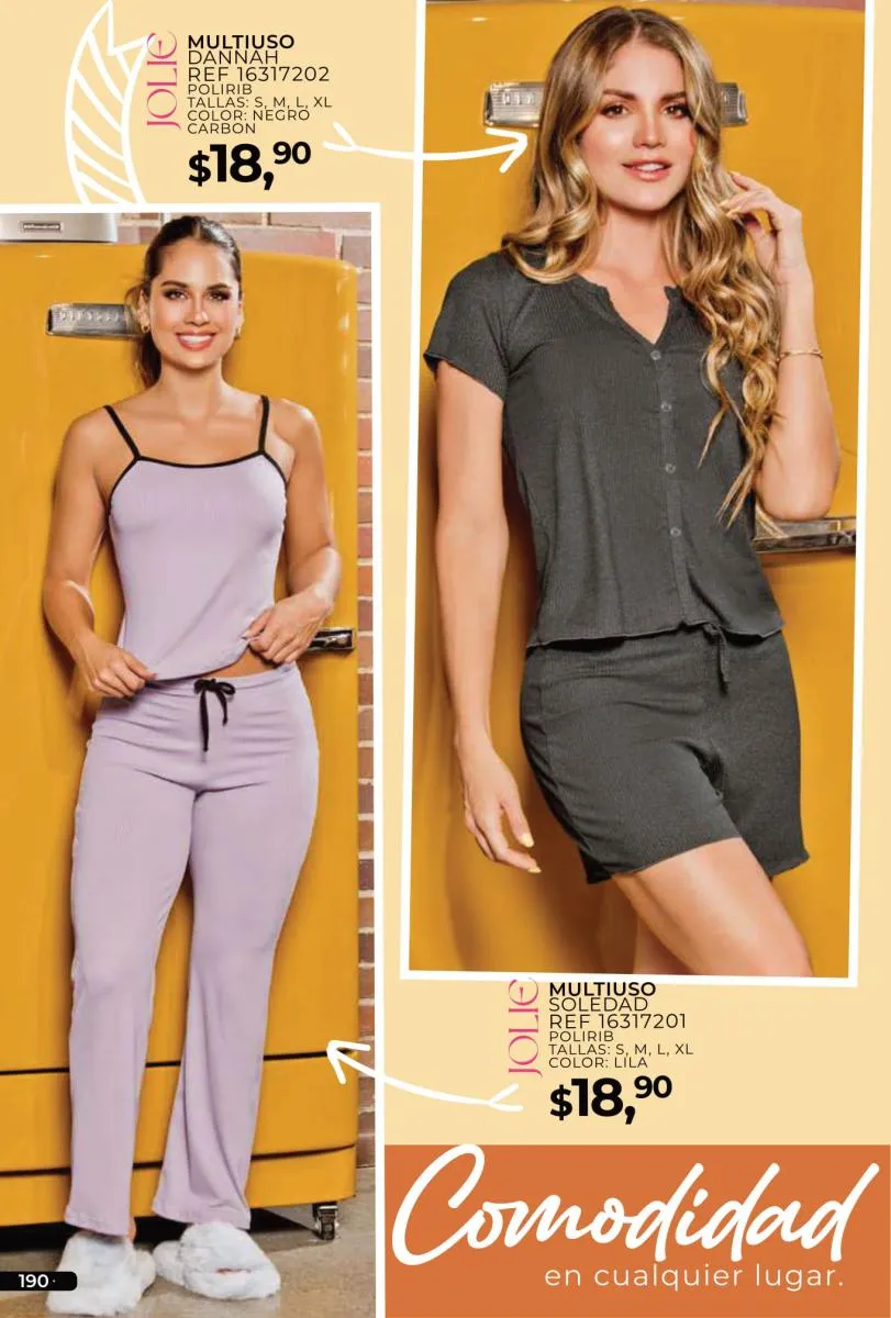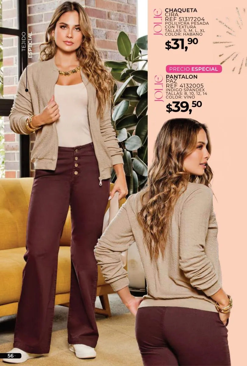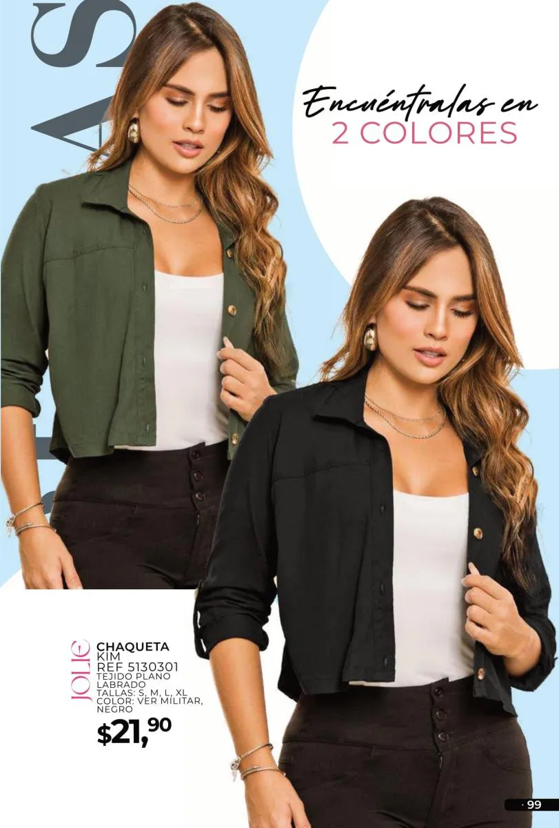 - Para atraer todas las miradas en este mes de aniversario Jolie, el color negro es ideal para ello. Búscalo en un enterizo “Saida” de lycra texturizada y tull (pág. 10) o un pantalón “Anny” en gabardina súper spandex (pág. 13).