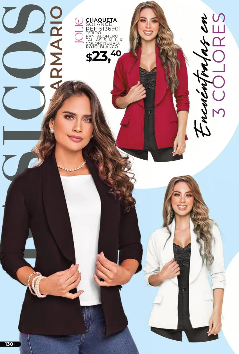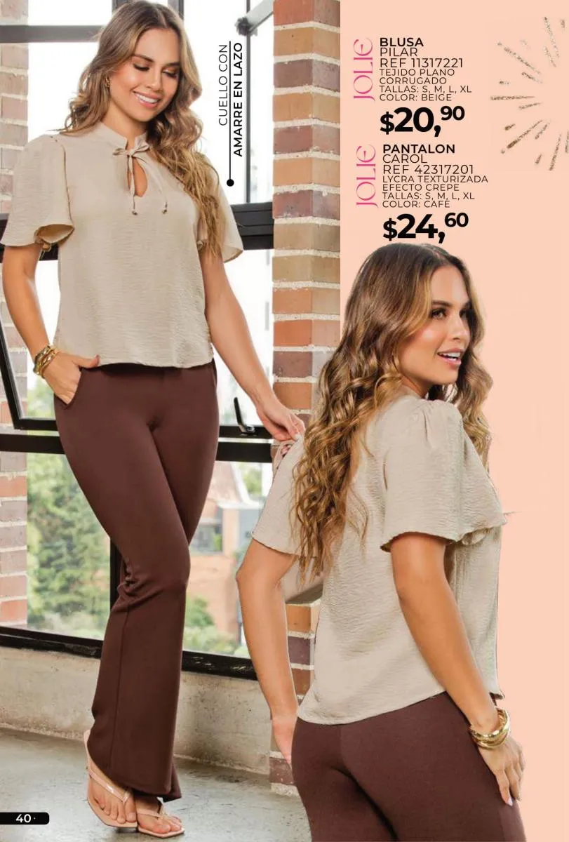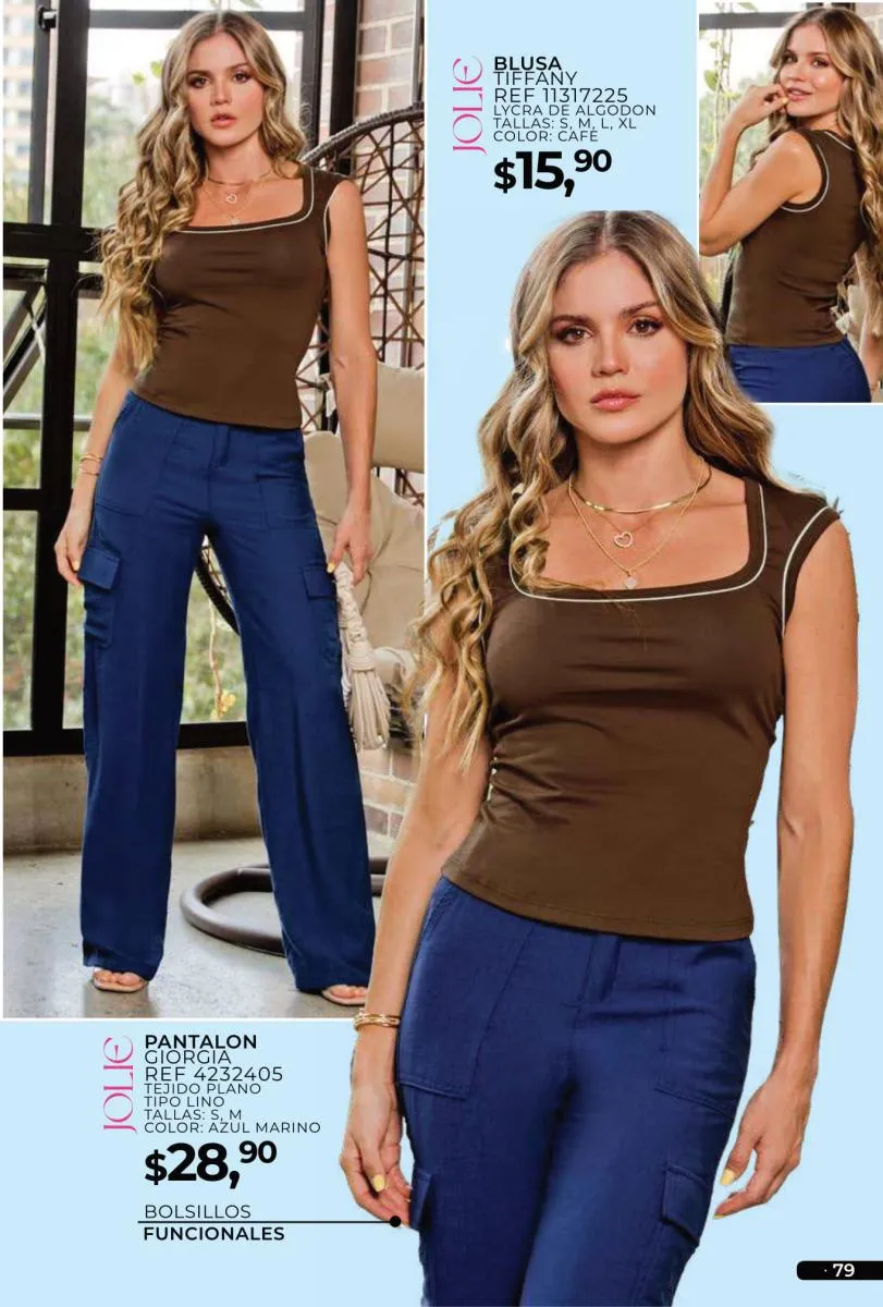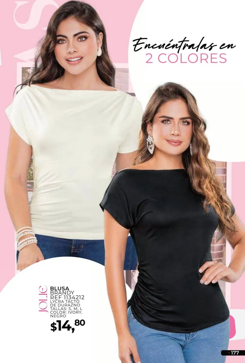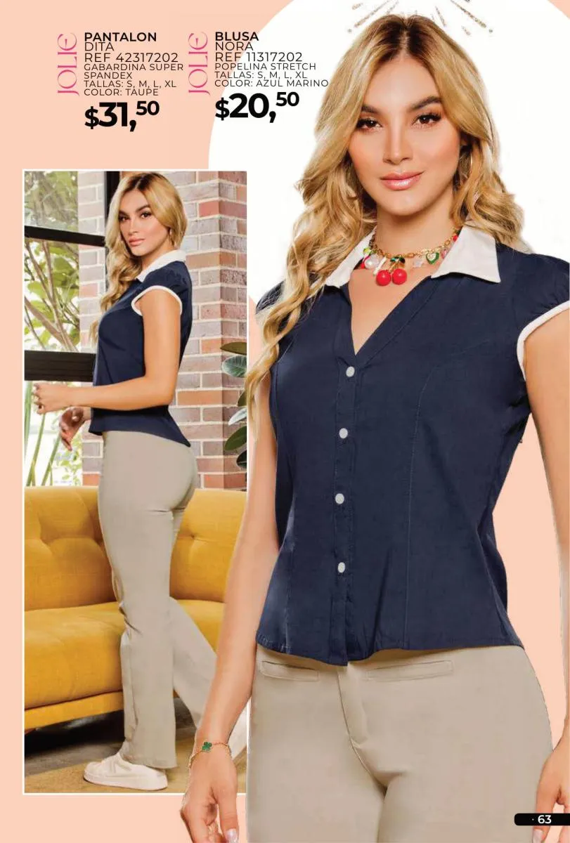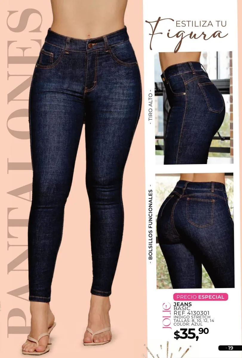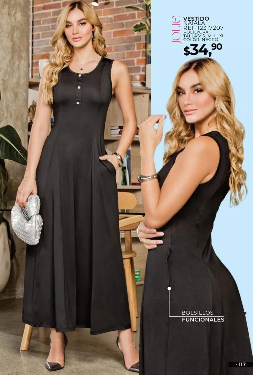 - Para atraer todas las miradas en este mes de aniversario Jolie, el color negro es ideal para ello. Búscalo en un enterizo “Saida” de lycra texturizada y tull (pág. 10) o un pantalón “Anny” en gabardina súper spandex (pág. 13).