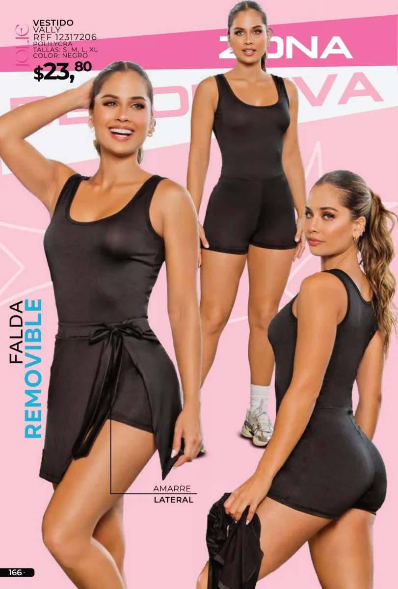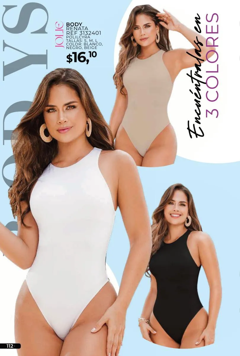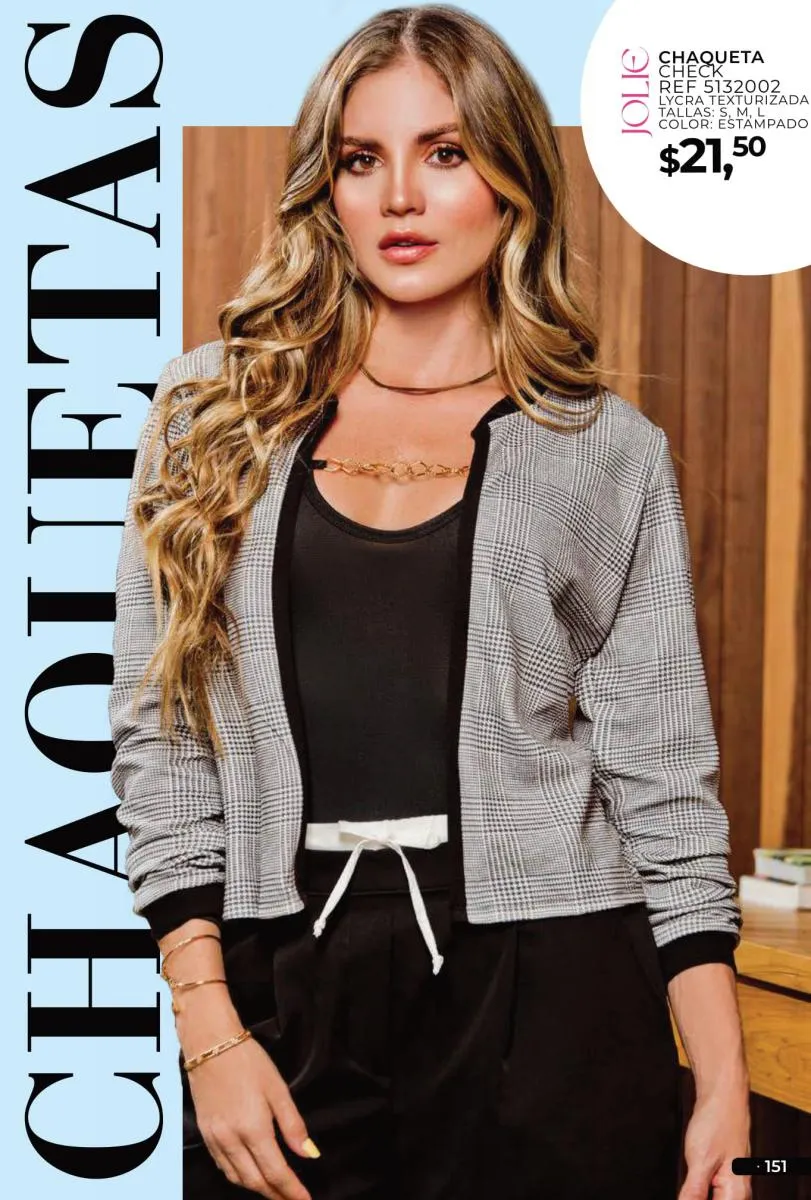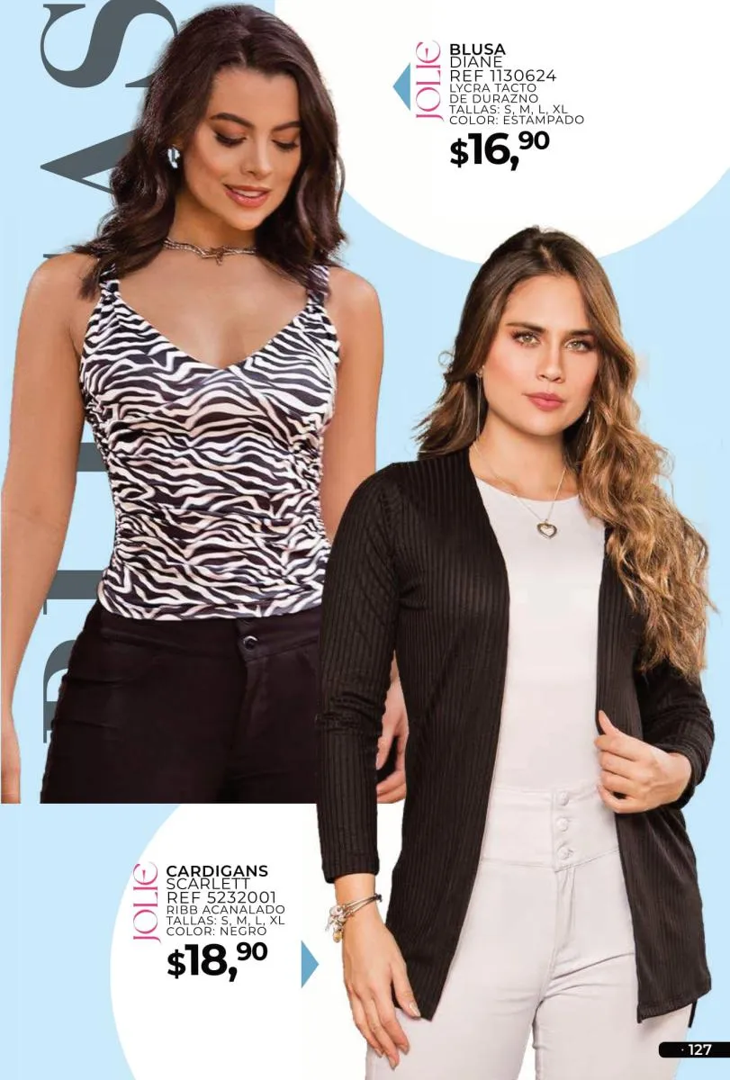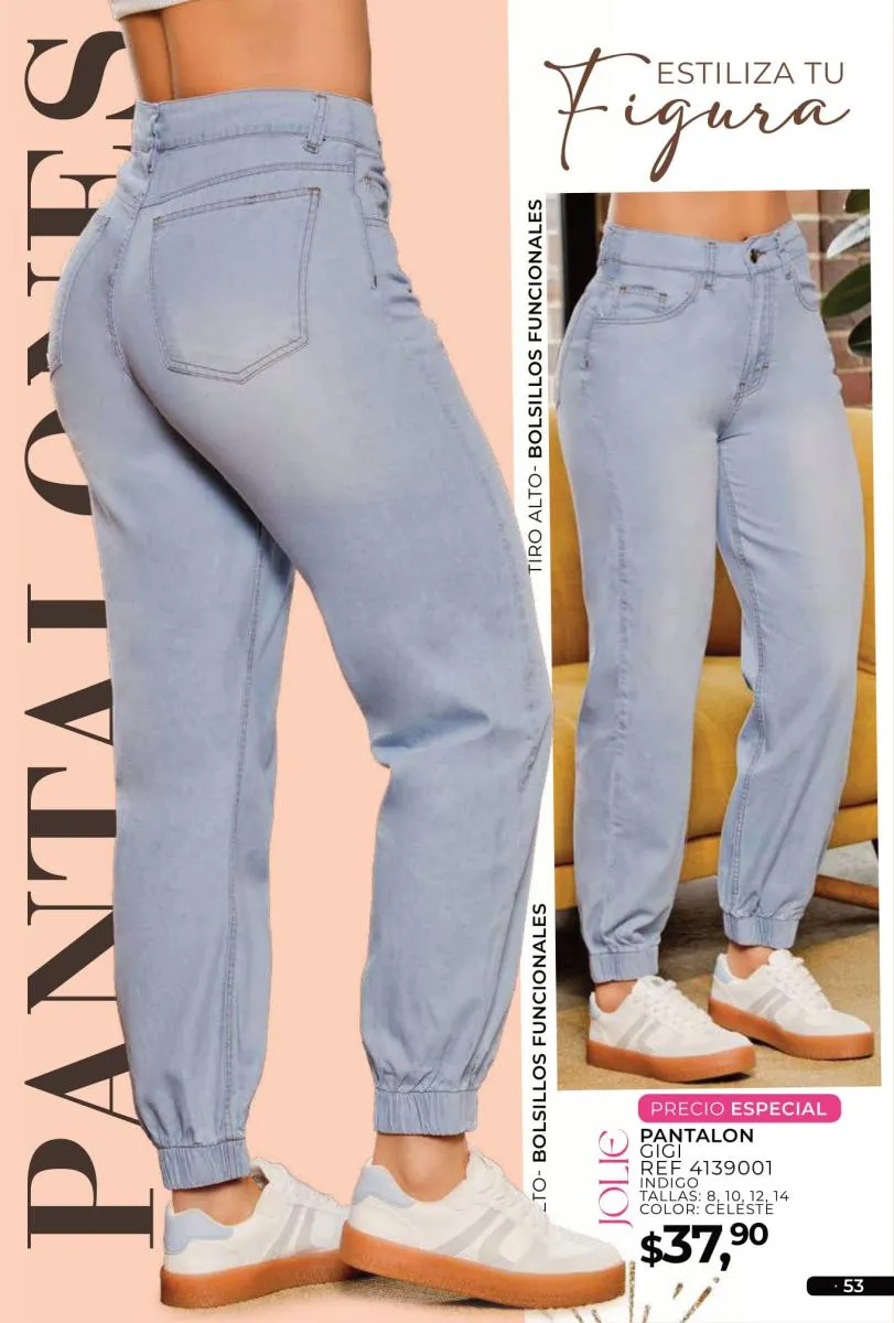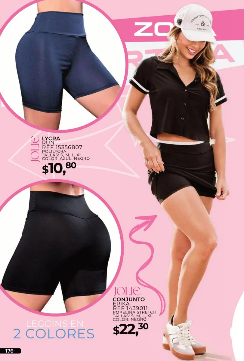- Para atraer todas las miradas en este mes de aniversario Jolie, el color negro es ideal para ello. Búscalo en un enterizo “Saida” de lycra texturizada y tull (pág. 10) o un pantalón “Anny” en gabardina súper spandex (pág. 13).