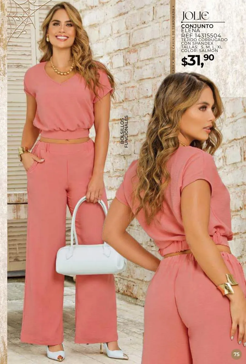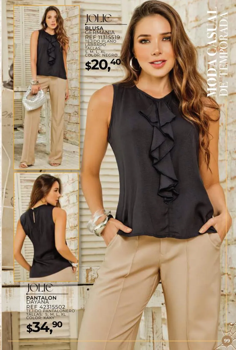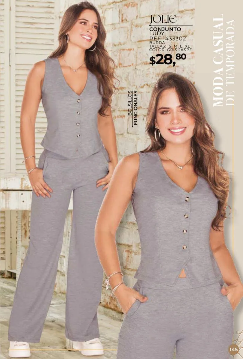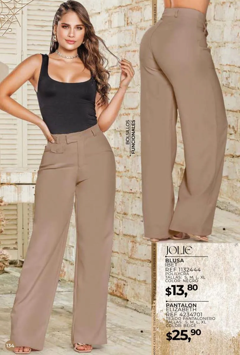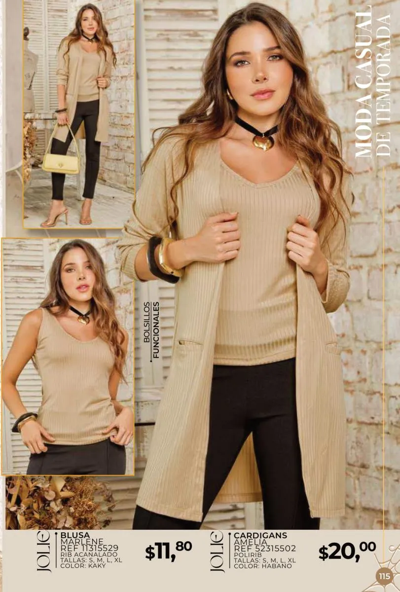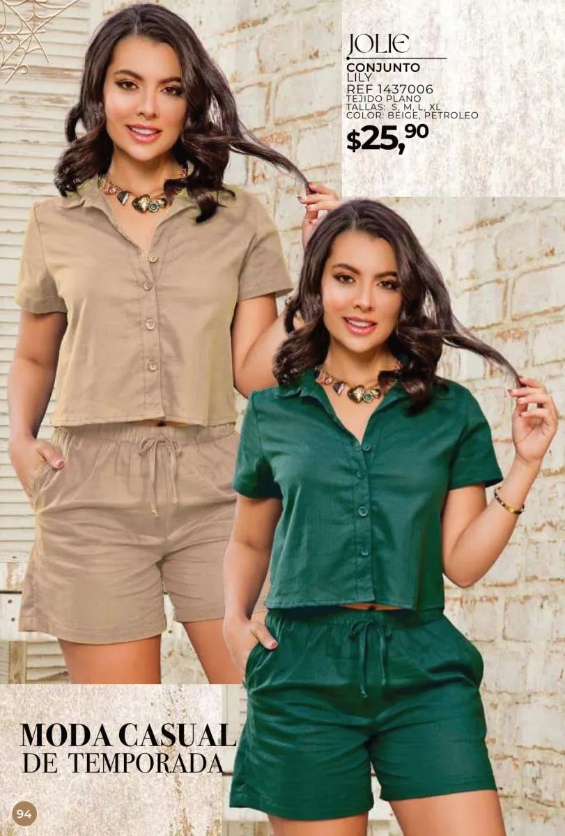 Una de las principales propuestas del Jolie campaña 15 2025 son los conjuntos casuales, perfectos para llevar en cualquier ocasión. Los pantalones de cintura alta combinados con blusas de mangas largas o cortas ofrecen una comodidad excepcional sin perder el toque de sofisticación. Los diseños se adaptan tanto a un día de trabajo como a una salida informal con amigos o familiares. Además, los materiales ligeros y frescos garantizan confort todo el día.