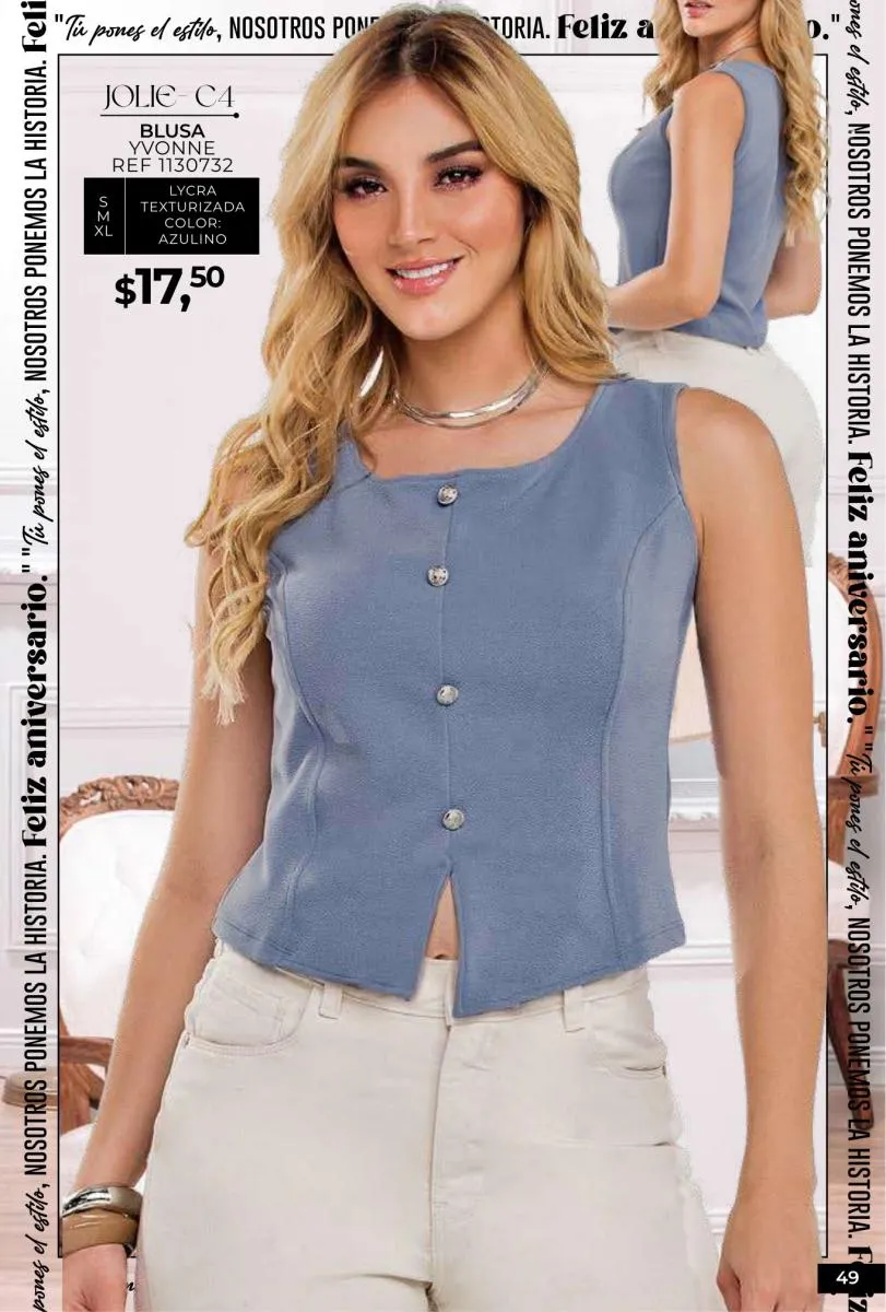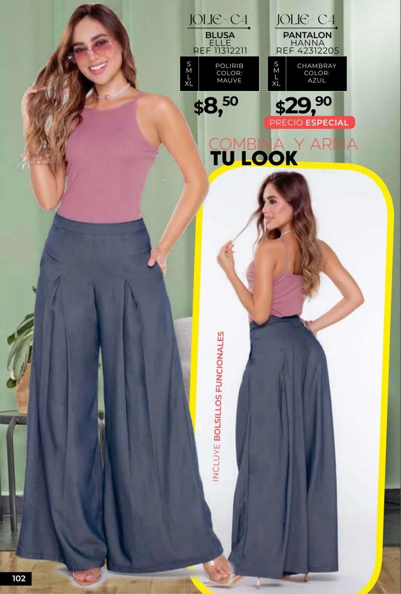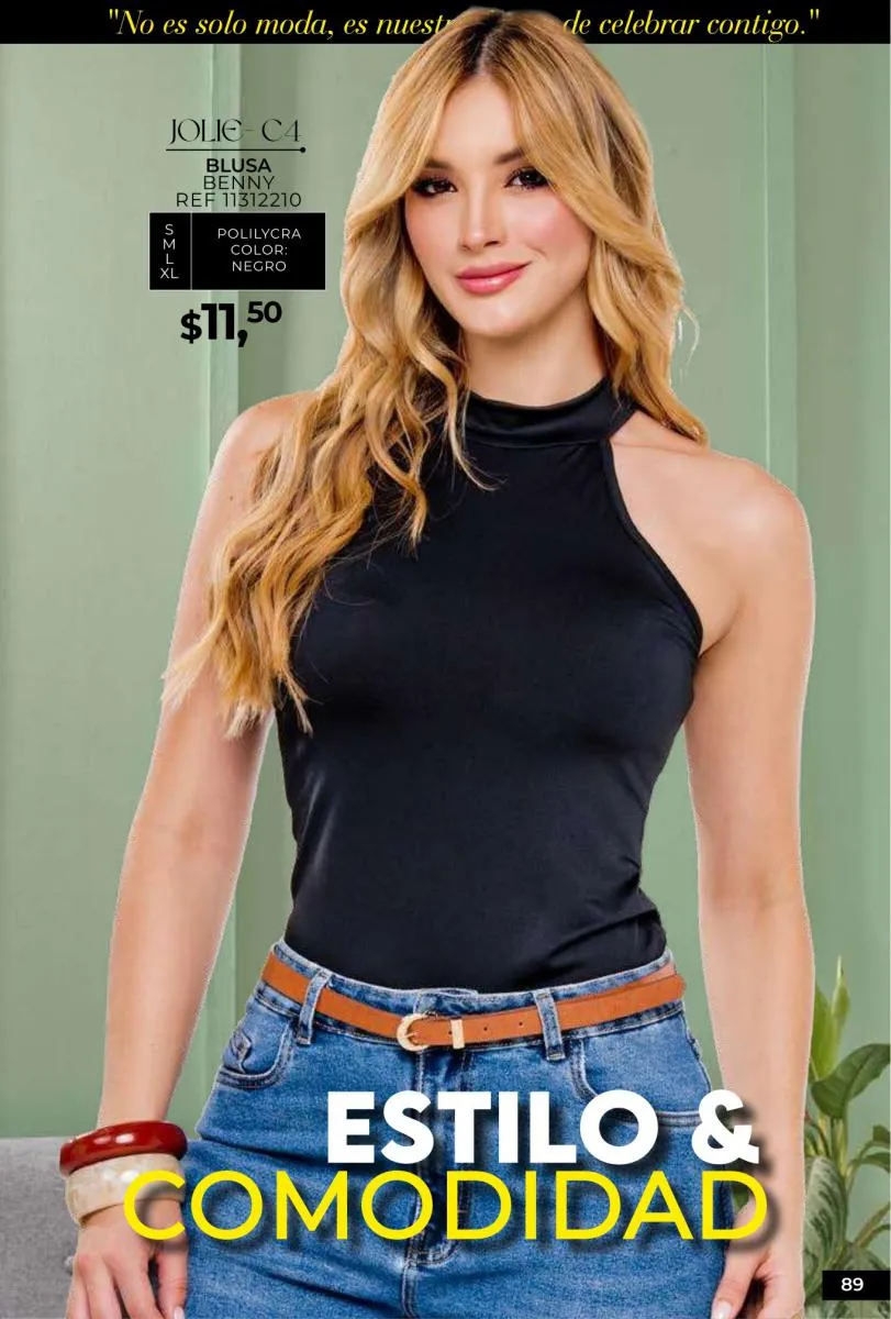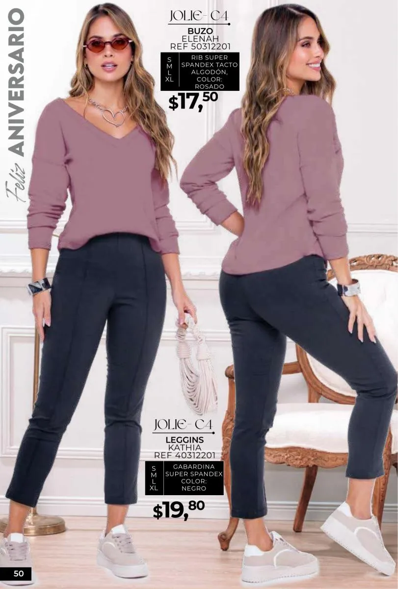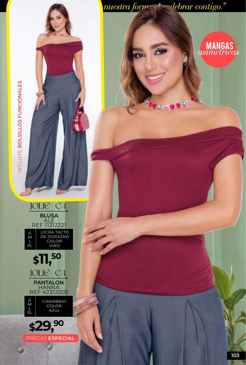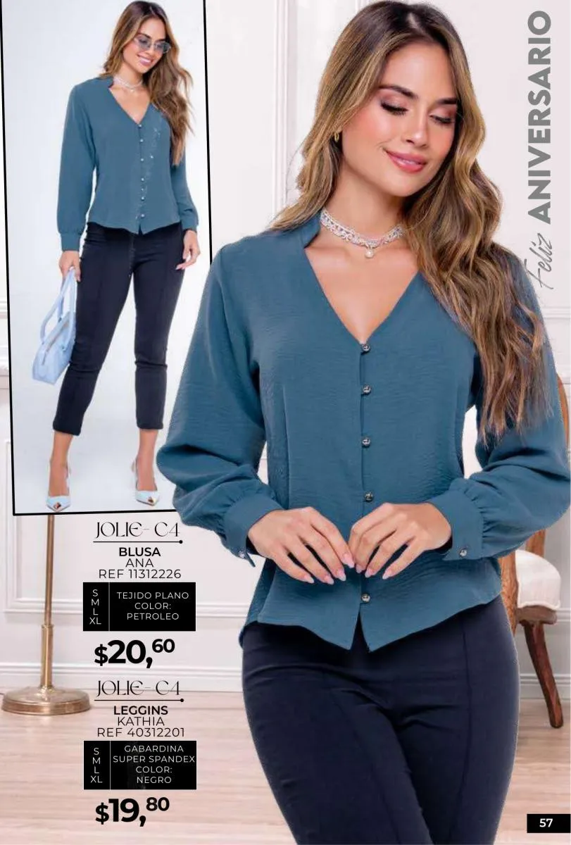 - Si de blusas se trata, hay una gran variedad en esta colección. Ejemplo de esto la de tono azul rey “Giselle”, elaborada en polilycra o la “Salmy” de manga larga y tejido plano (página 32).