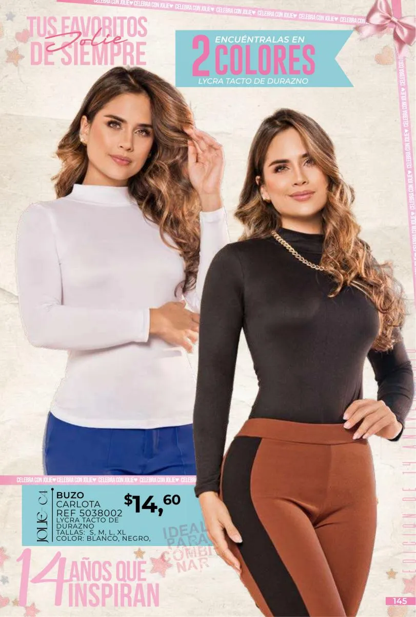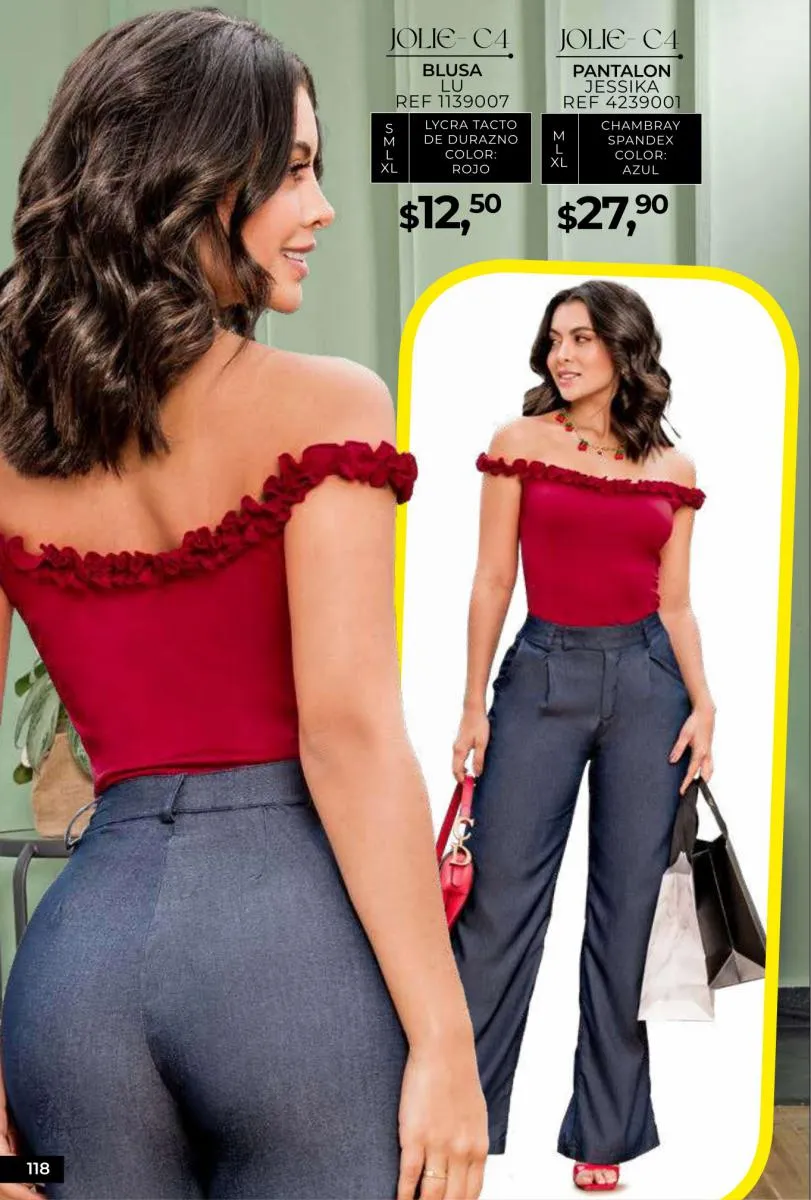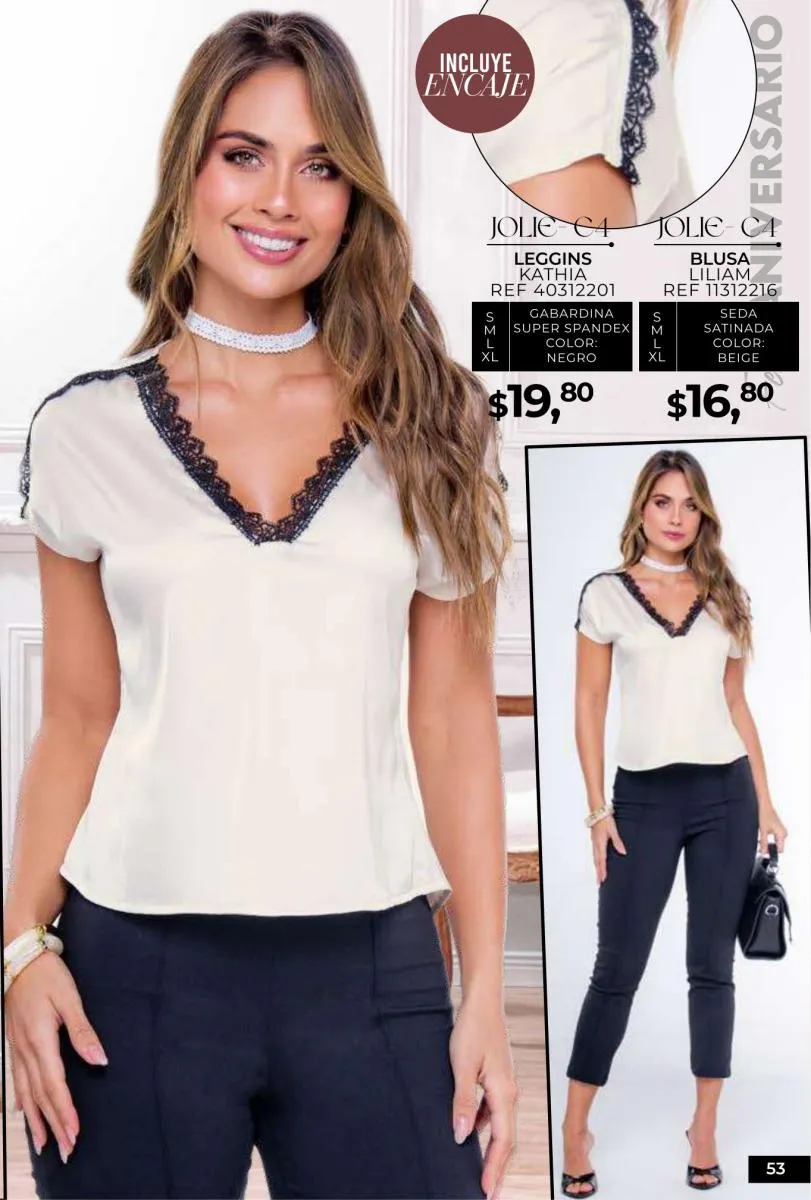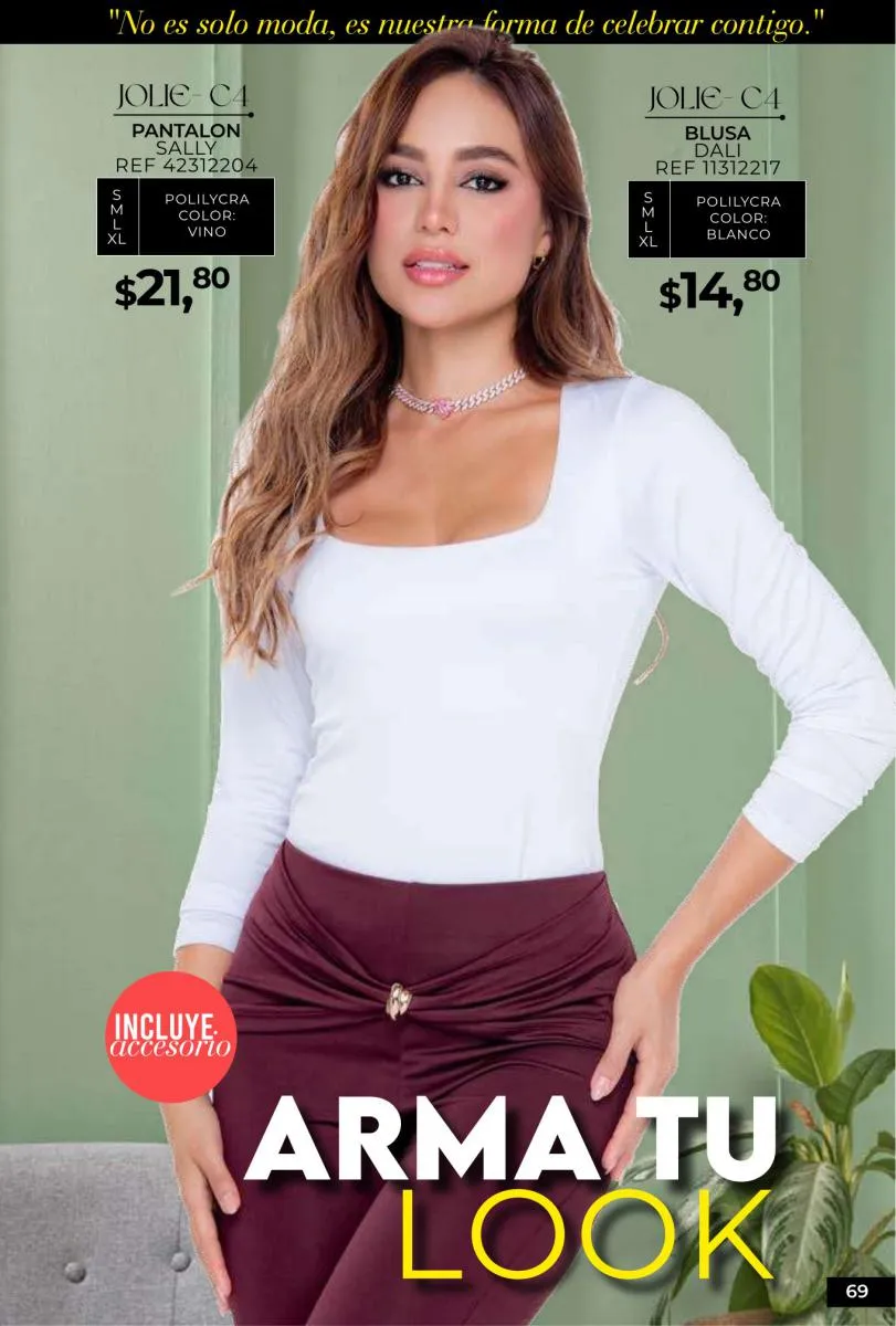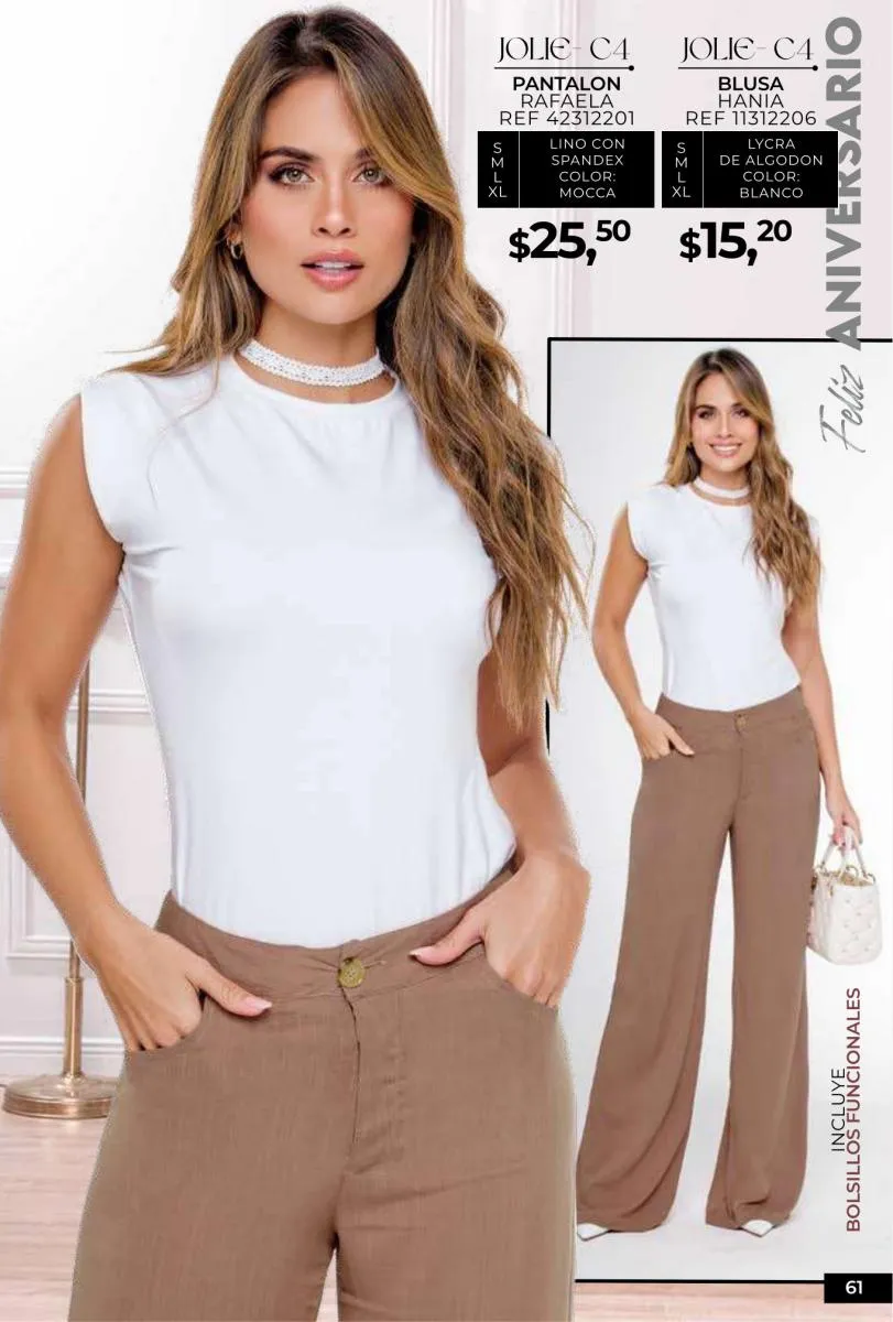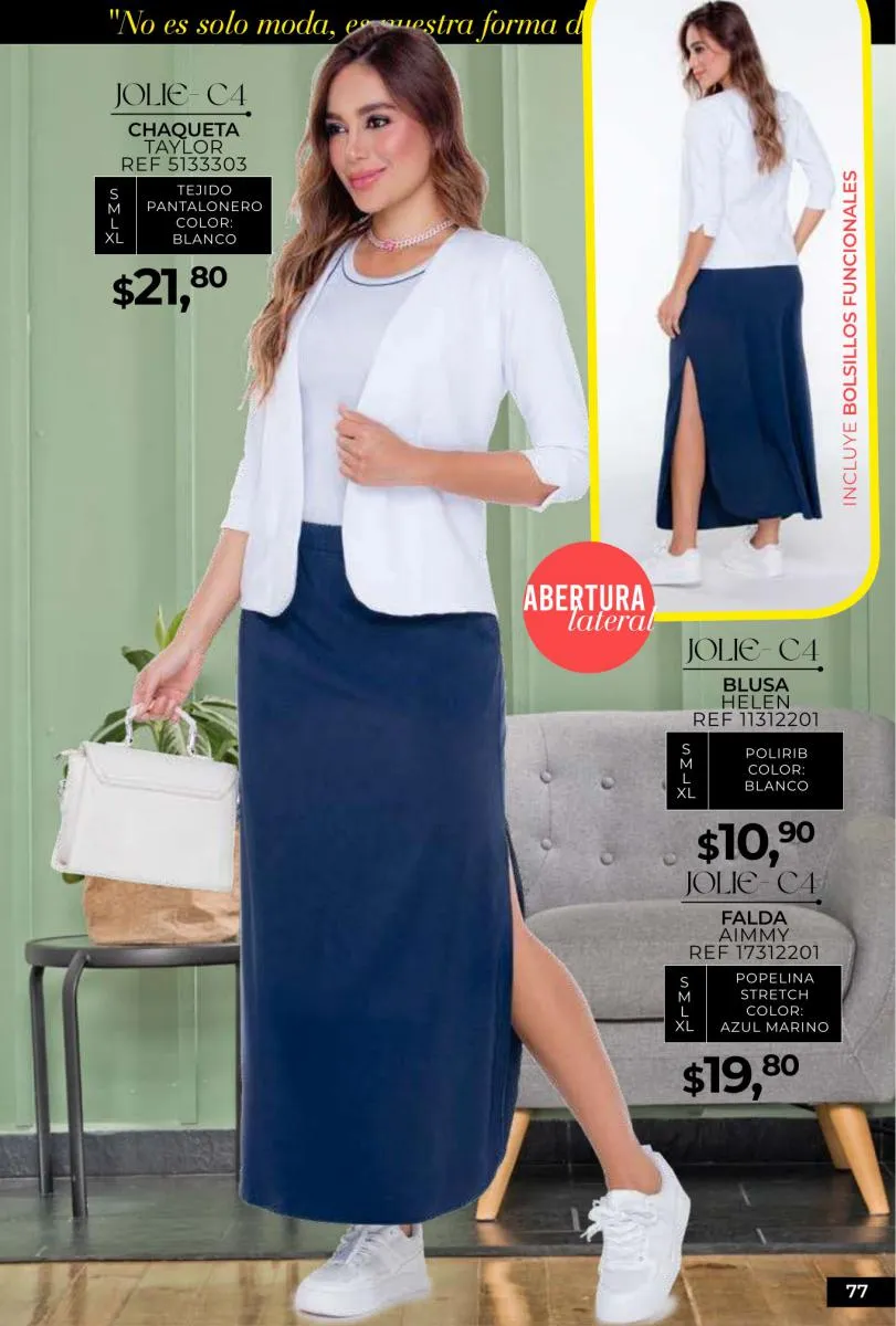 - Si de blusas se trata, hay una gran variedad en esta colección. Ejemplo de esto la de tono azul rey “Giselle”, elaborada en polilycra o la “Salmy” de manga larga y tejido plano (página 32).