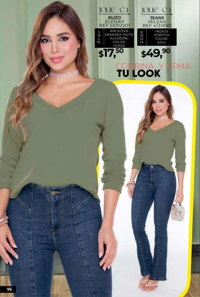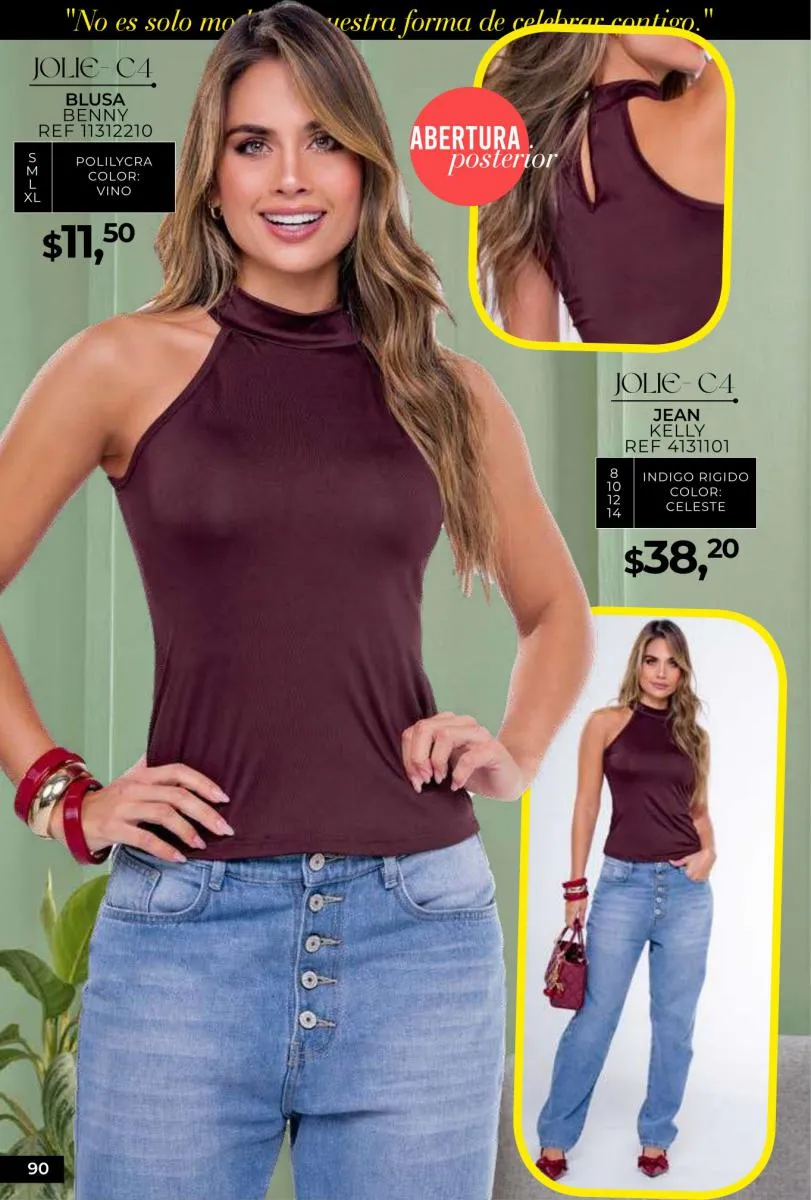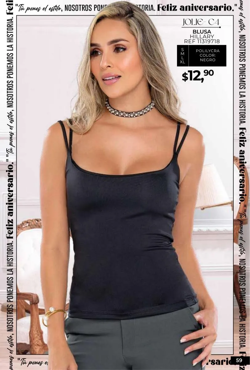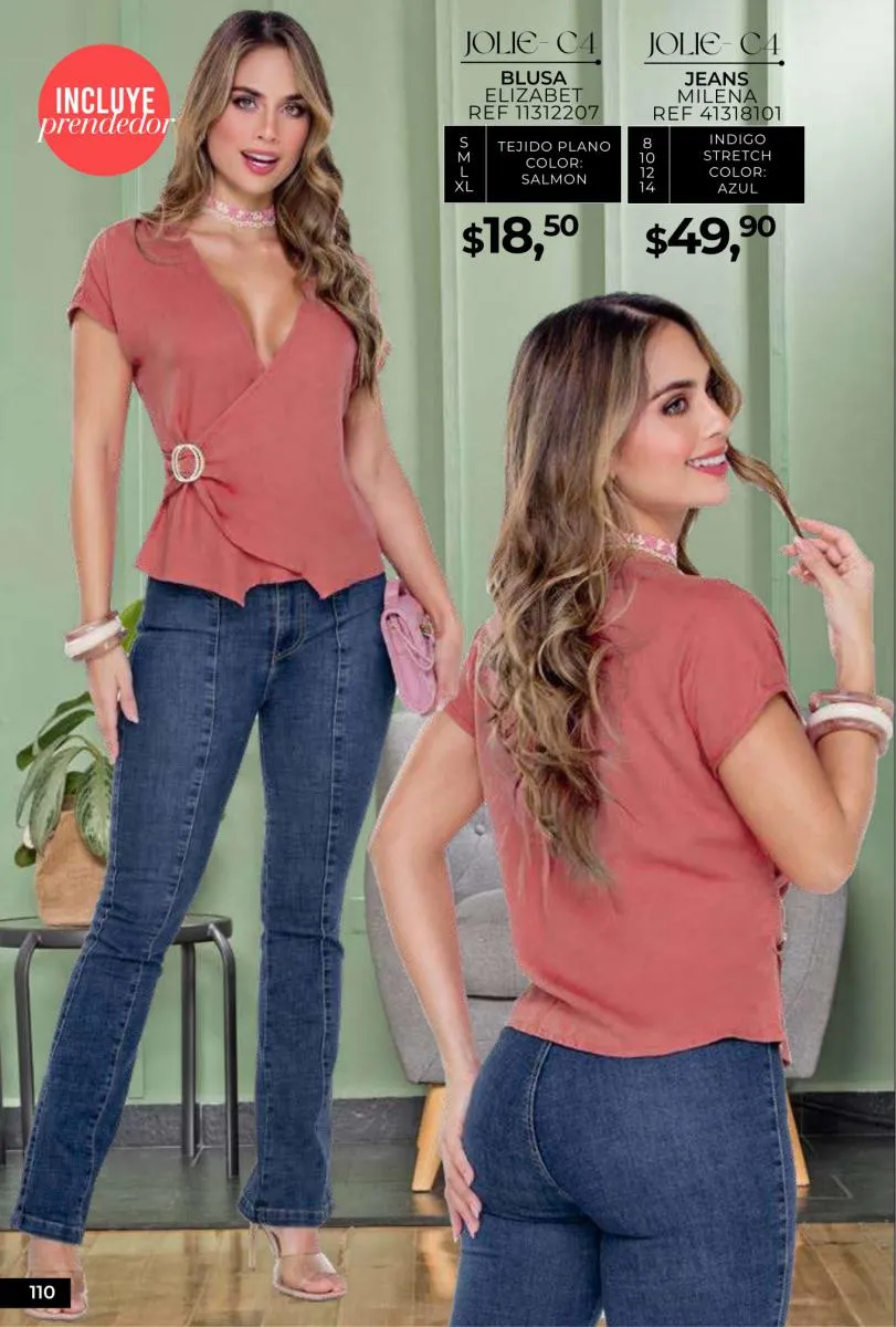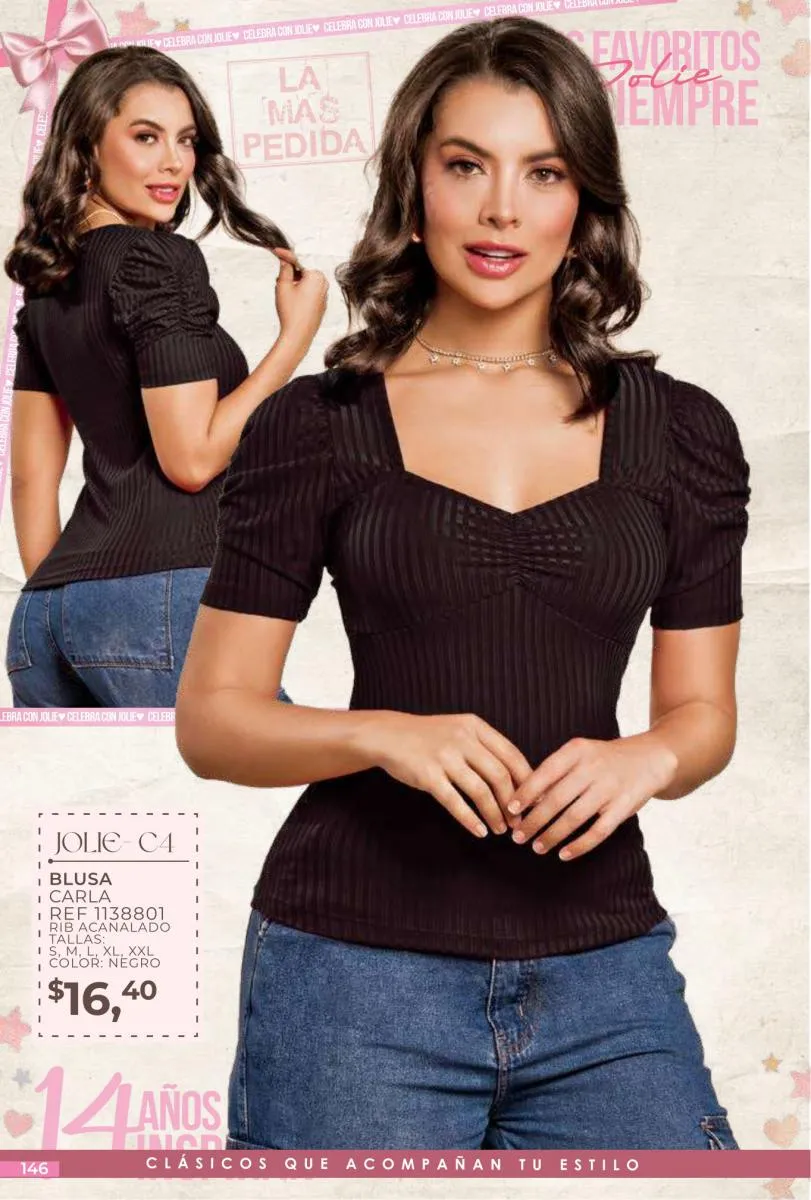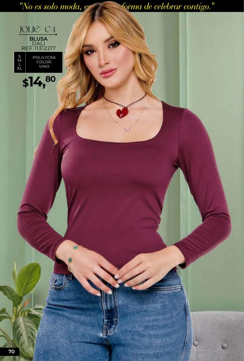 - Si de blusas se trata, hay una gran variedad en esta colección. Ejemplo de esto la de tono azul rey “Giselle”, elaborada en polilycra o la “Salmy” de manga larga y tejido plano (página 32).