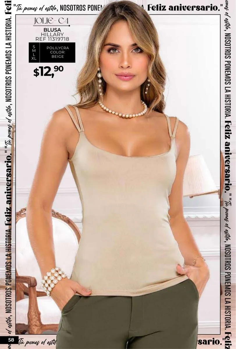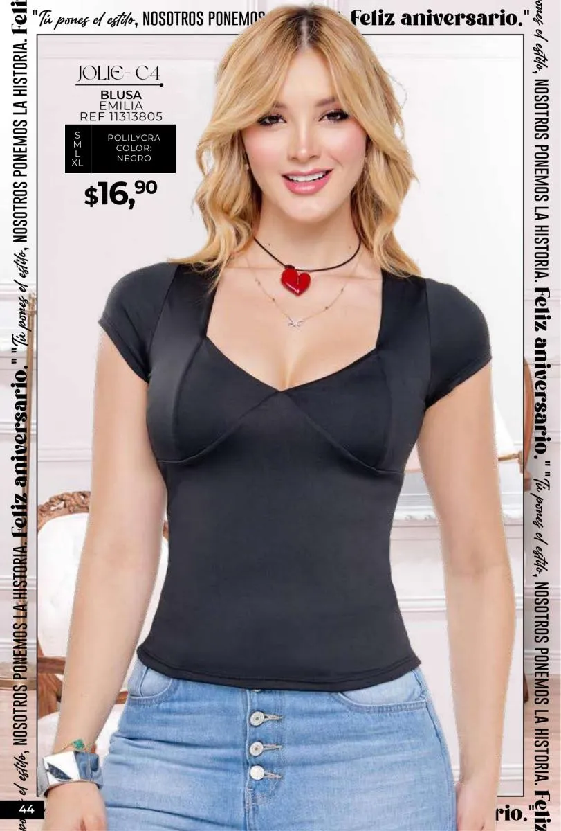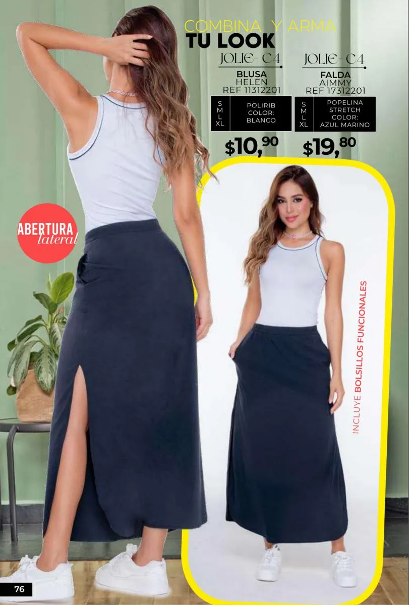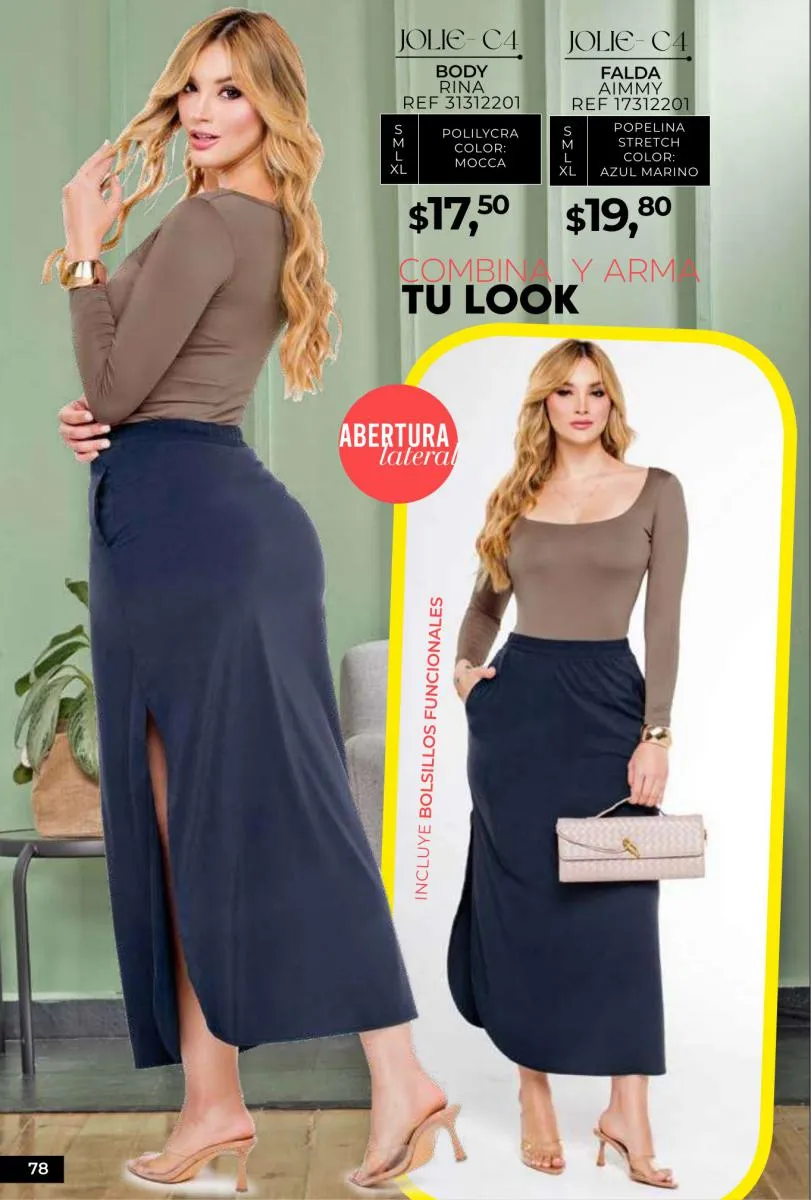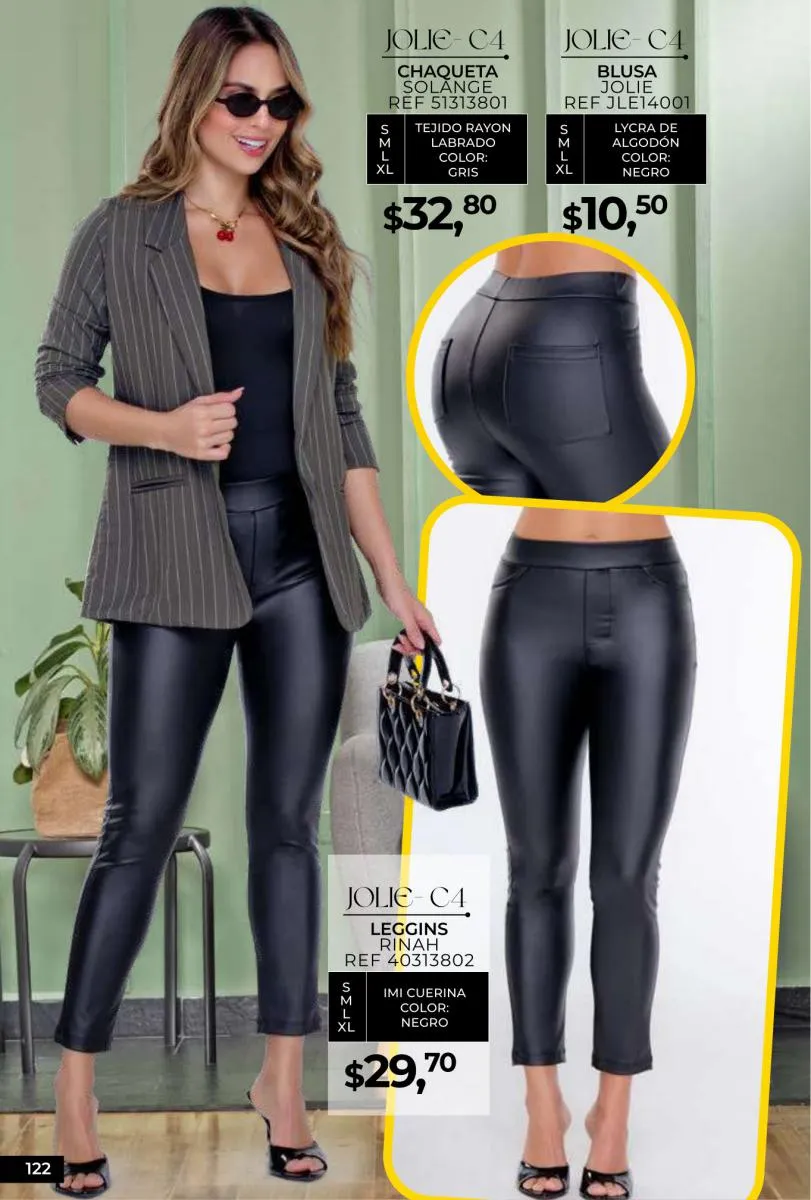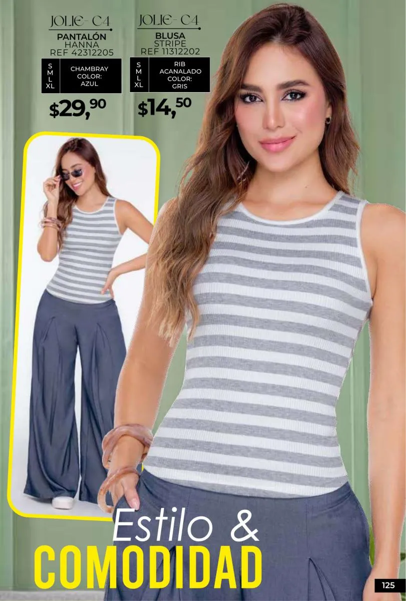 - Si de blusas se trata, hay una gran variedad en esta colección. Ejemplo de esto la de tono azul rey “Giselle”, elaborada en polilycra o la “Salmy” de manga larga y tejido plano (página 32).